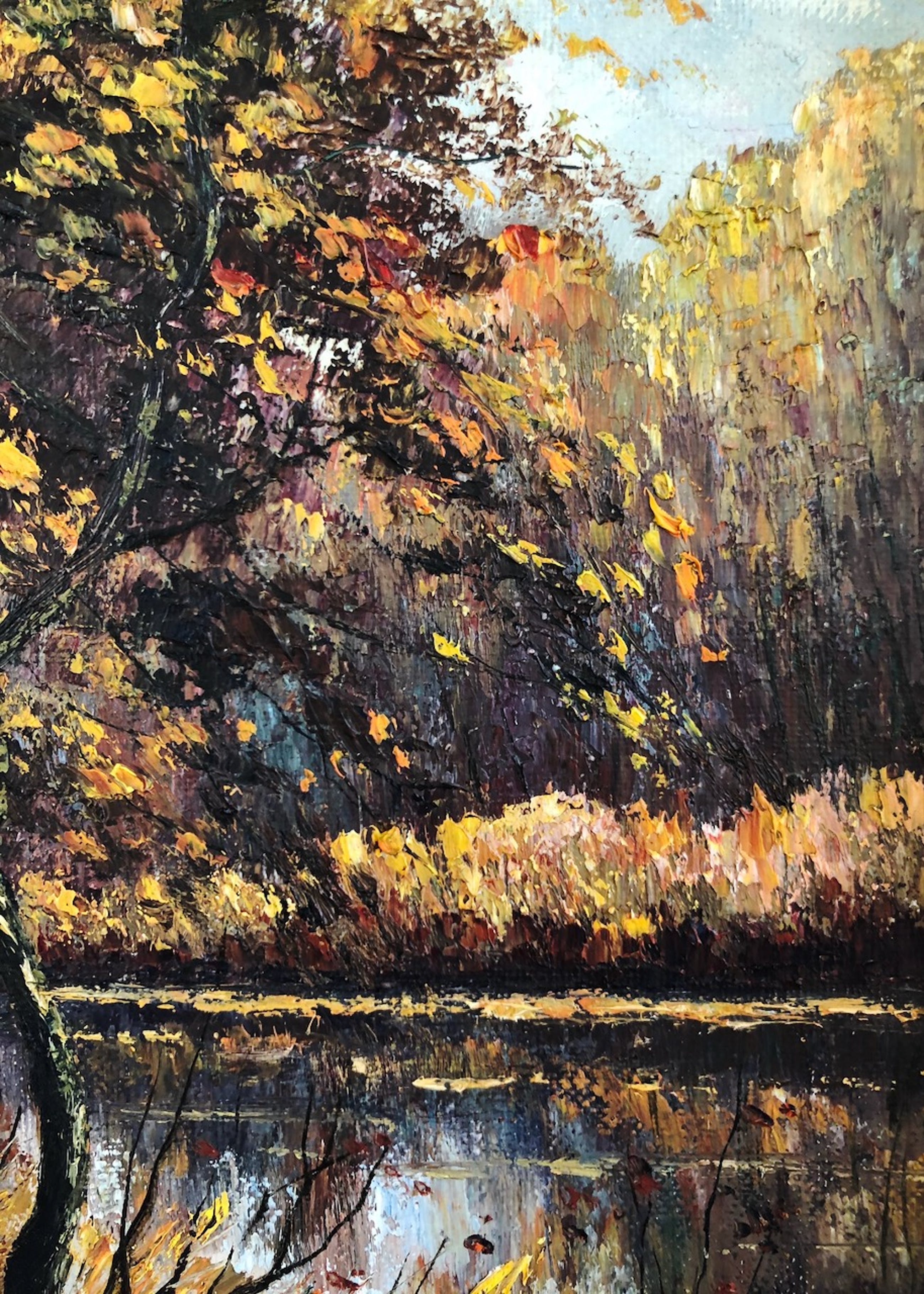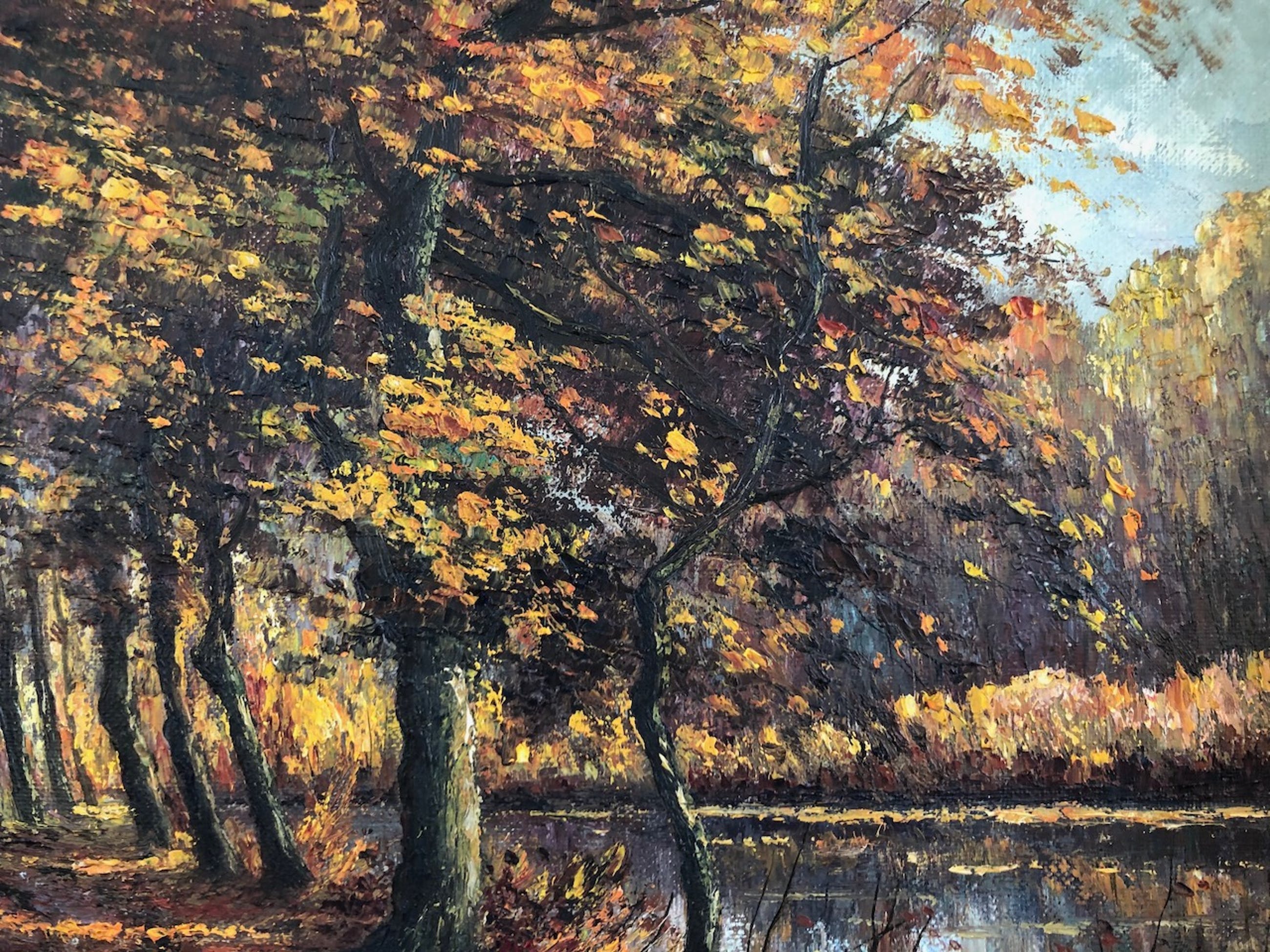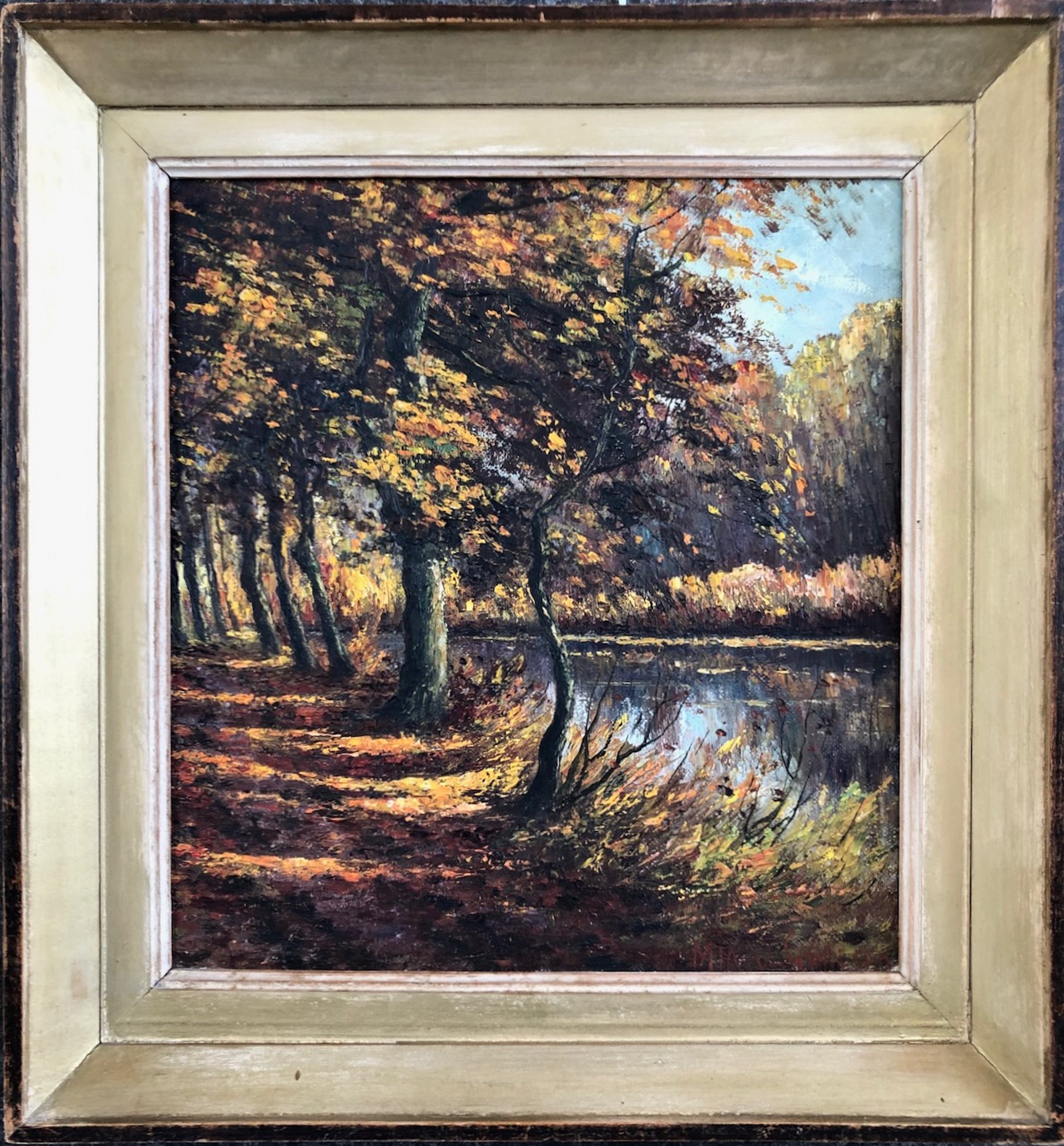 Een mooi weergegeven herfstimpressie van een vennnetje met links inderdaad een soort van kloostergang van bomen. De maker van dit werk kan een zus van de bekendere Jos van Genegen zijn, wellicht zijn vrouw maar misschien ook wel de kunstenaar zelf om het exclusiviteitsrecht qua verkoop onder de naam Jos van Genegen te omzeilen. Dit gebeurde wel vaker.