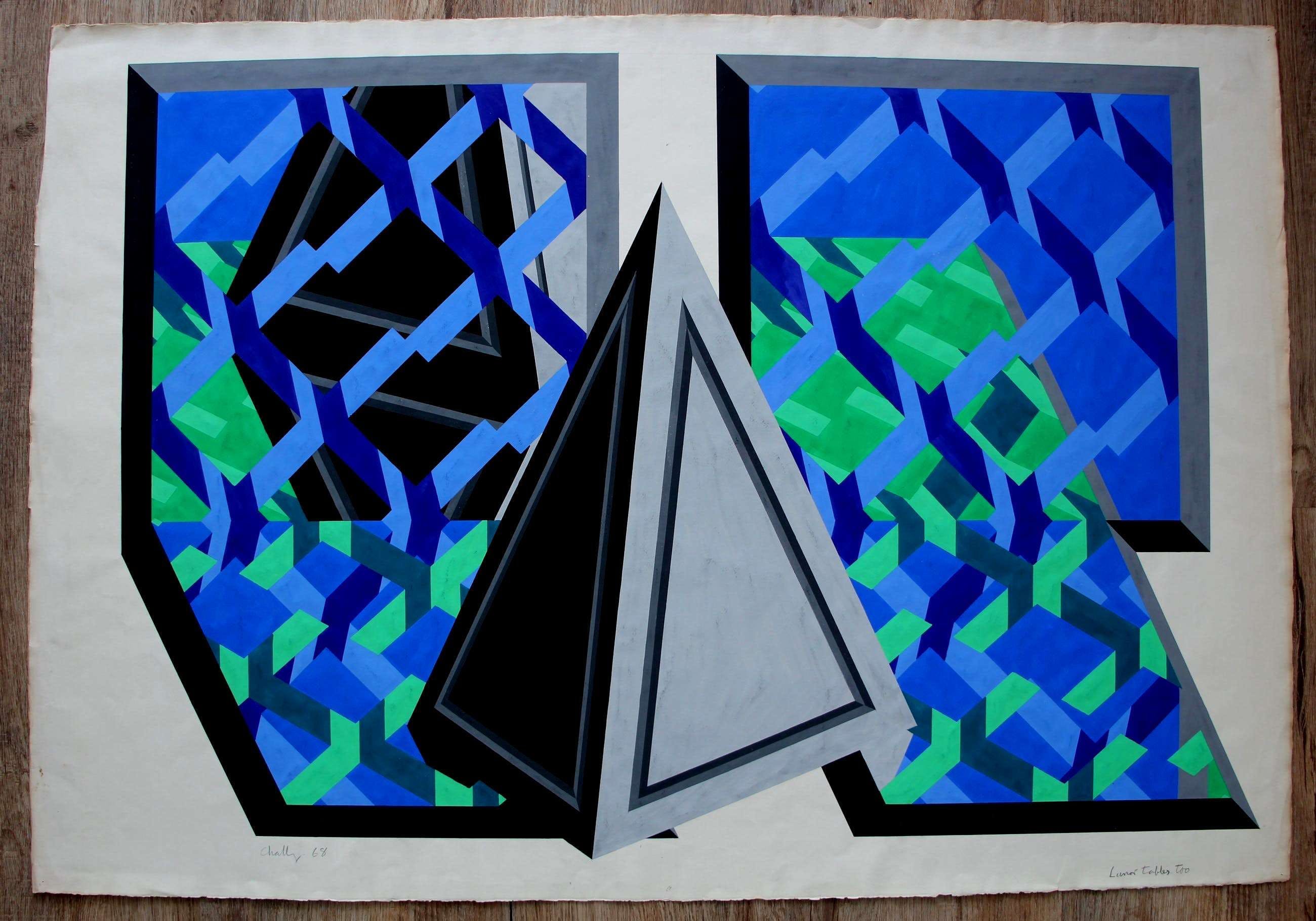 Geometrische compositie van Michael Challenger op papier. Titel: Lunor Tables too. Jaar: 1968. Afmetingen werk: H71.5 x b103cm.
