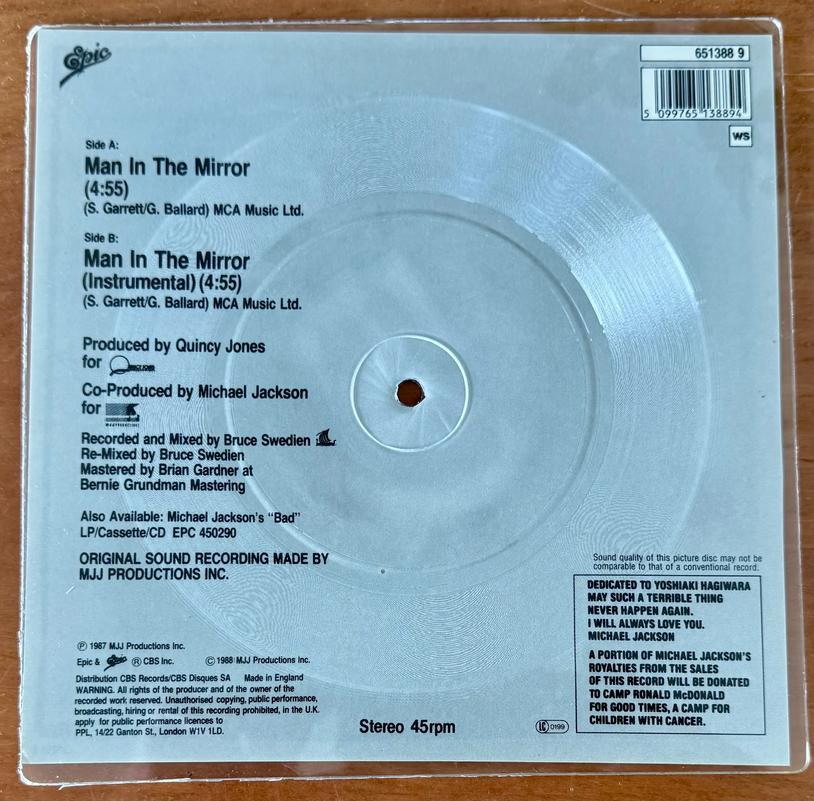 Verzamelaarsuitgave van de single: plaat is vierkant met afbeelding, daarin is de single 'man in the mirror' geperst.
