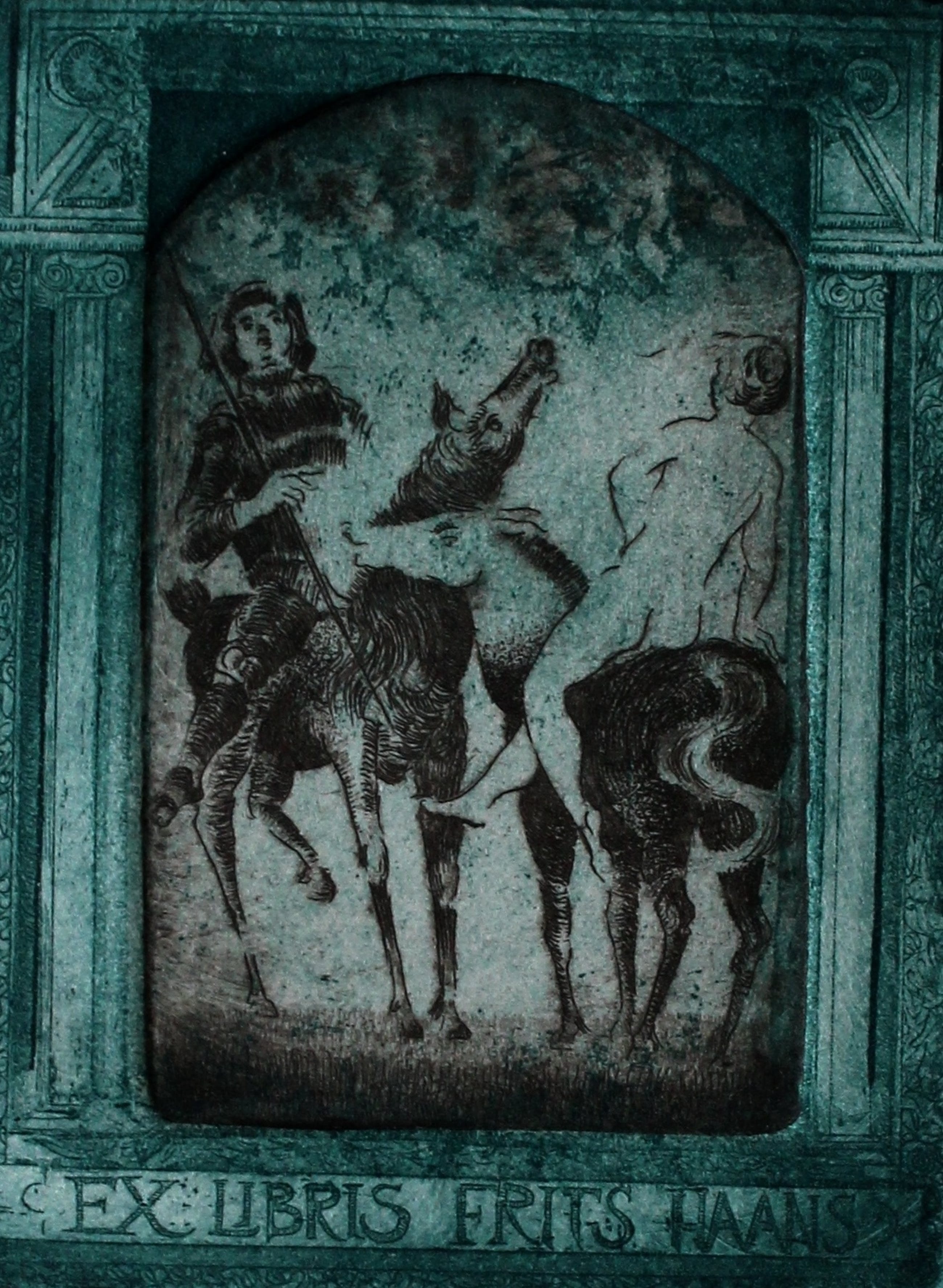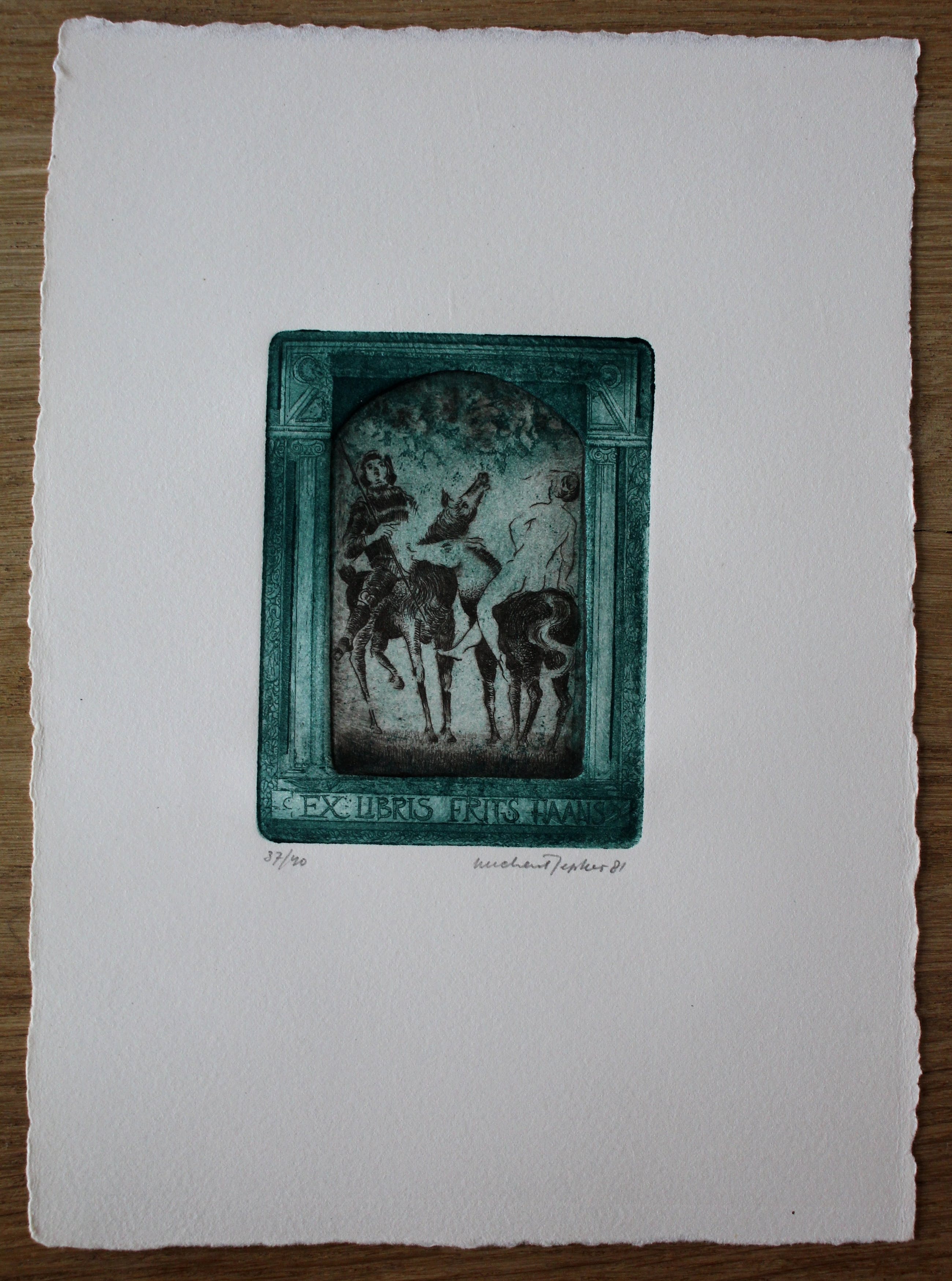 Ets van Michael Jepkes. Ex Libris Frits Haans. Nummer: 37/40. Jaar: 1981. Afmetingen blad : H26 x b19 cm; Afmetingen voorstelling: H10.5 x b8cm. Het werk is rechts onderaan, met potlood, gesigneerd door de kunstenaar. De authenticiteit van dit werk wordt volledig gegarandeerd. Een certificaat van echtheid kan, op aanvraag, worden gemaild.