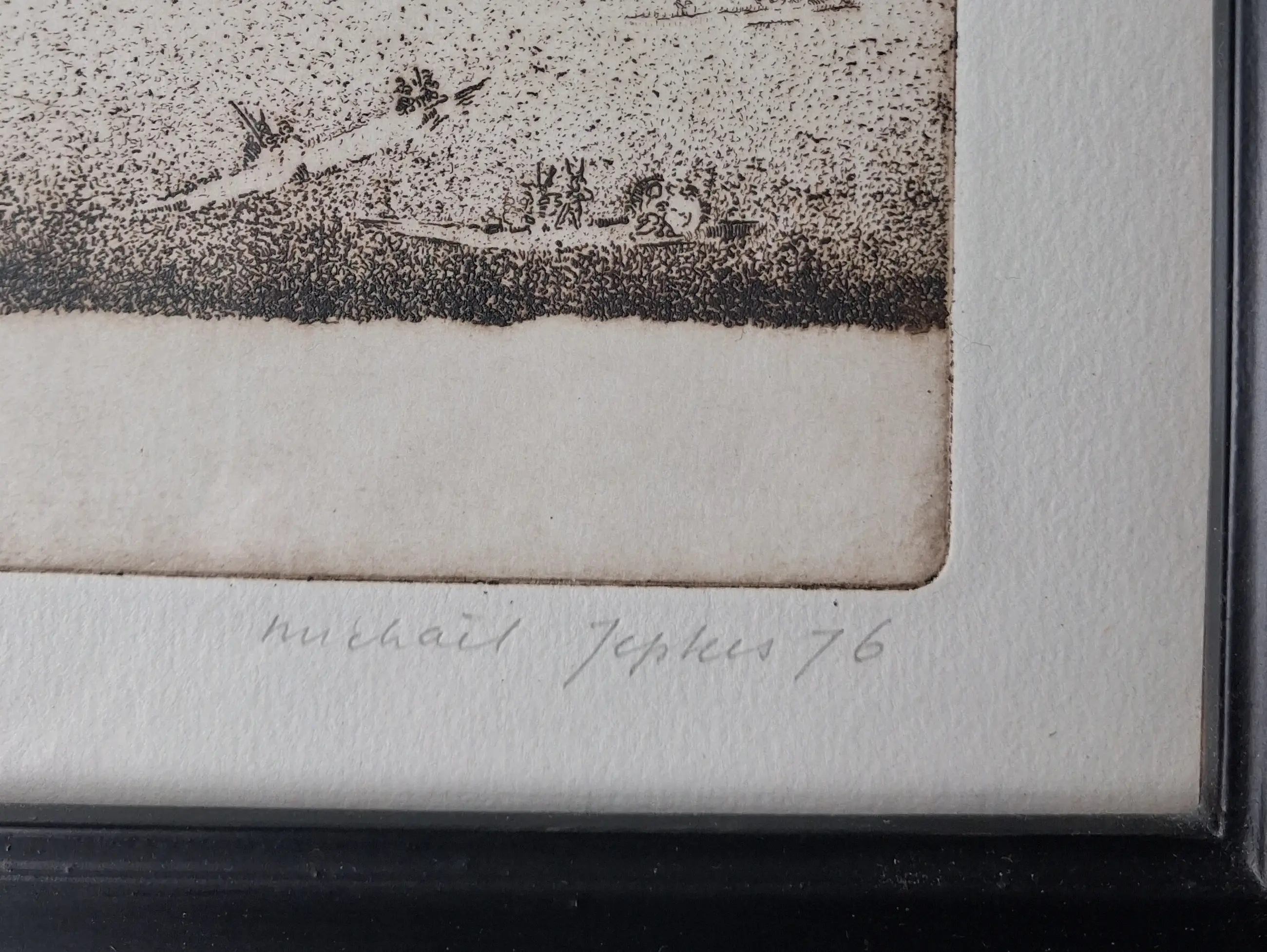 Ets/aquatint van Michaël Jepkes, met potlood door de maker gesigneerd, gedateerd en genummerd. Ingelijst in degelijke zwarte houten lijst. De conditie van het geheel is uitstekend.