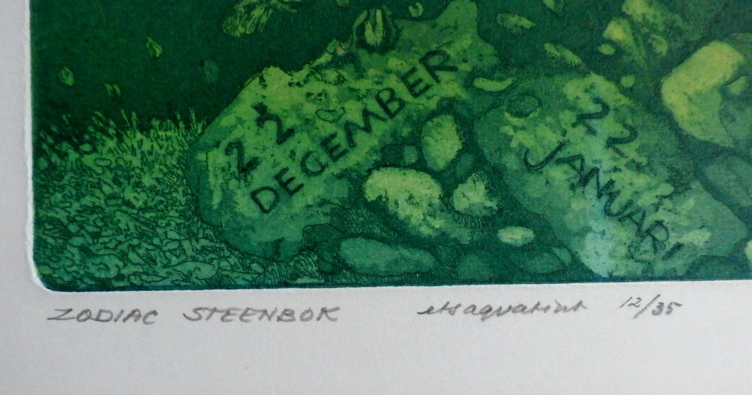 Ets/aquatint van Michael Jepkes. Titel: Zodiac Steenbok. Nummer:12 /35. Afmetingen blad: H30 x b29 cm. Afmetingen voorstelling: H25 x b25 cm. Rechtsonder door de kunstenaar gesigneerd met potlood. De authenciteit van het, aangeboden, werk wordt voor 100% gegarandeerd. Herkomst: collectie ABN AMRO.