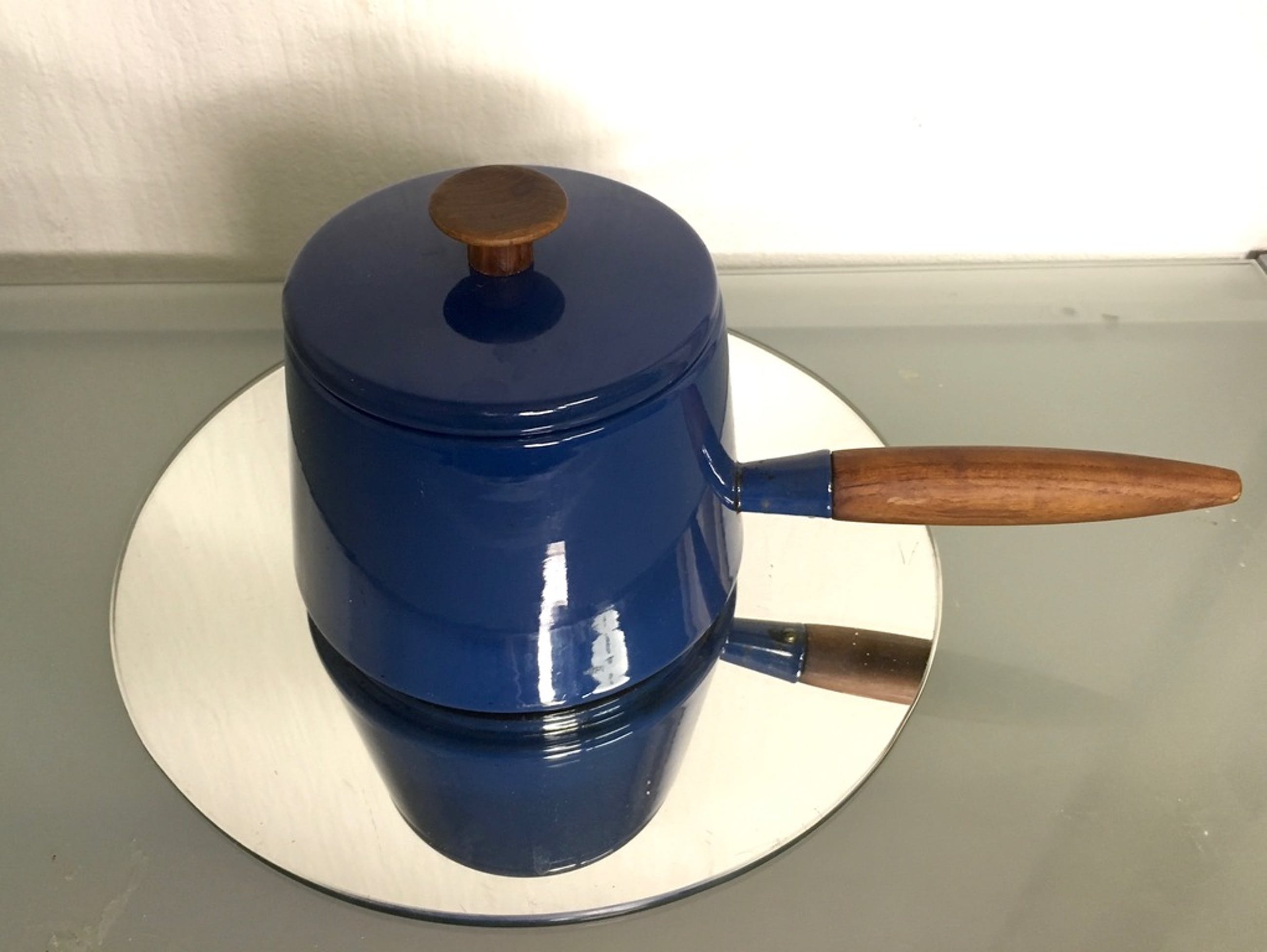 Deze iconische fonduepan is ontworpen door Michael Lax voor Copco Holland. De pan en de warmhoudbrander zijn nooit gebruikt, emaille en het teakhout zijn prachtige staat.