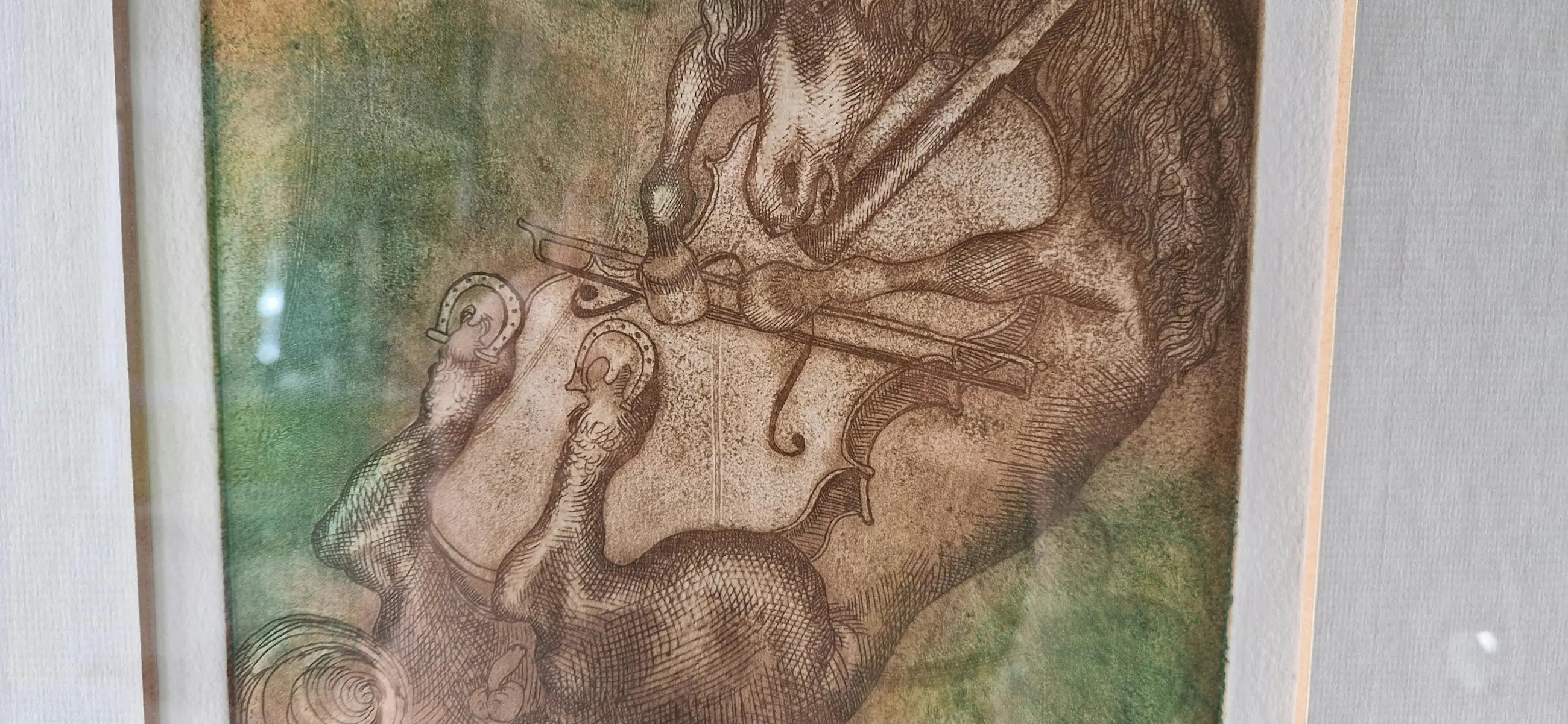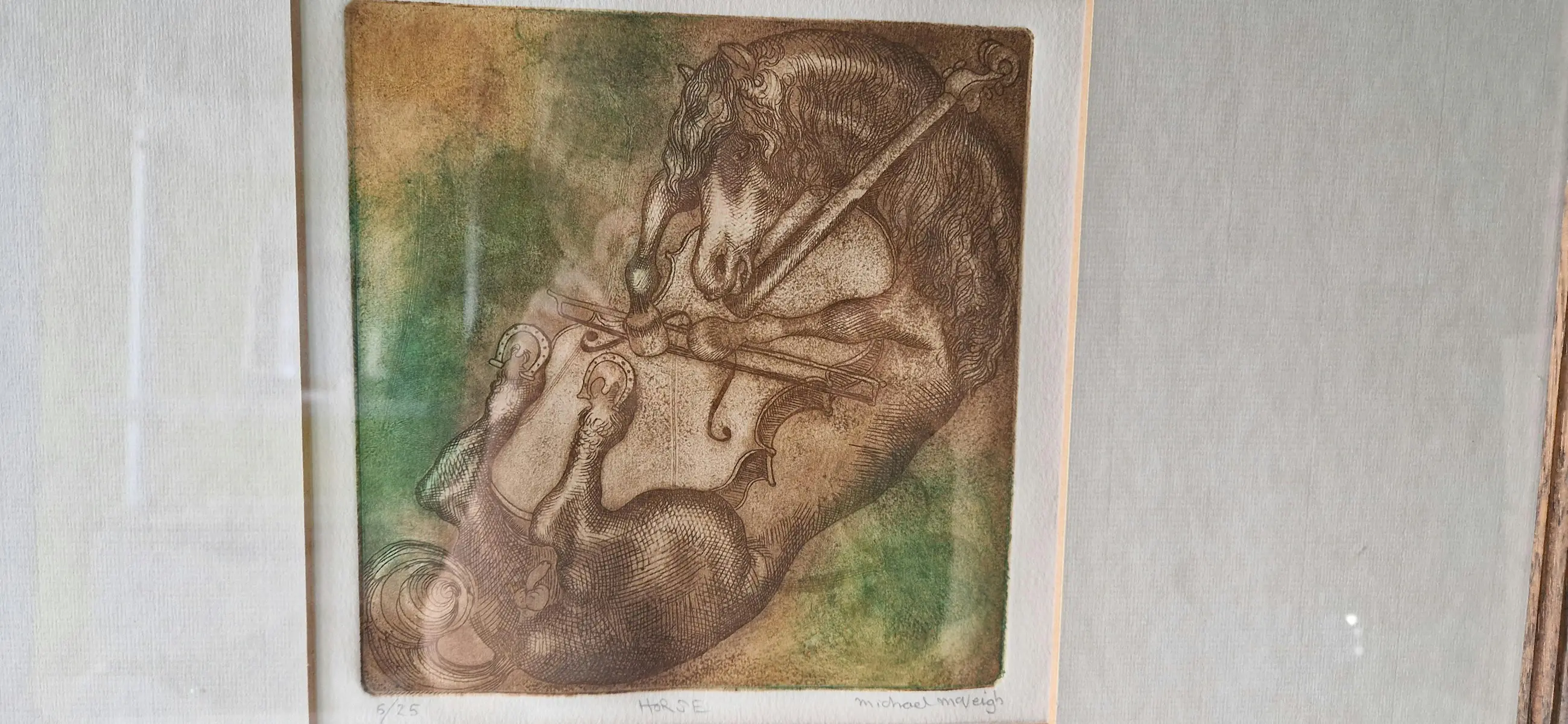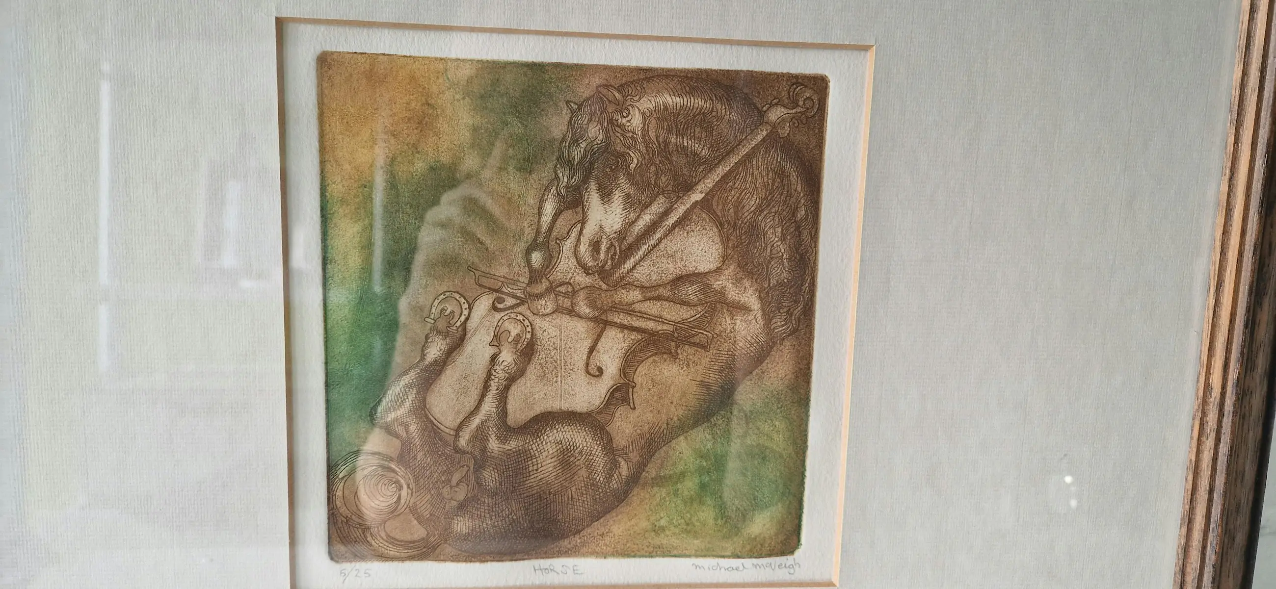 Deze gedetailleerde ets toont een gestileerd paard verweven met muzikale elementen, weergegeven in warme bruine en gedempte groene tinten. De prent is professioneel ingelijst met een brede, gebroken witte passe-partout en gepresenteerd in een massief houten frame met een natuurlijke donkere afwerking, wat het geheel een rustige, tijdloze uitstraling geeft.