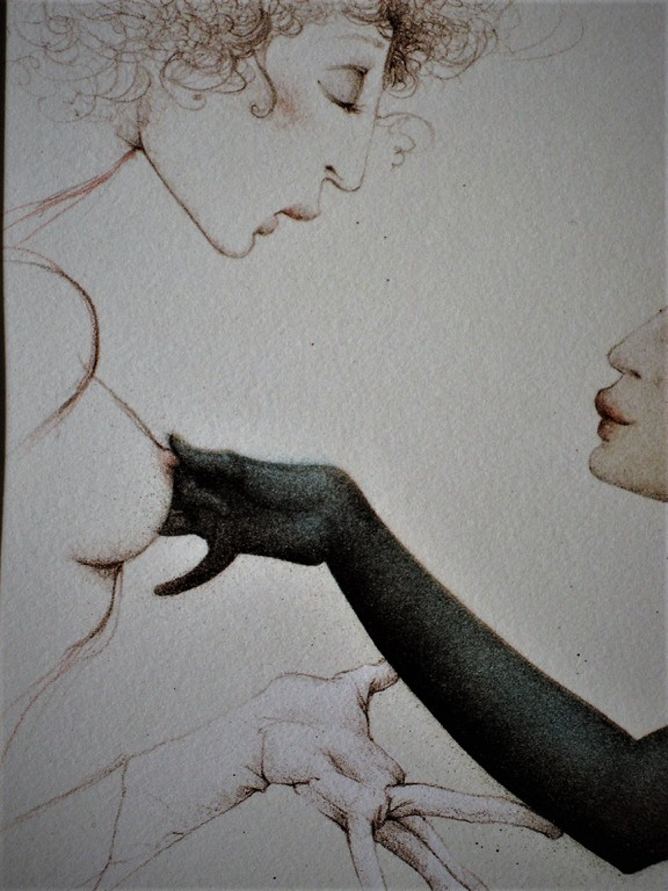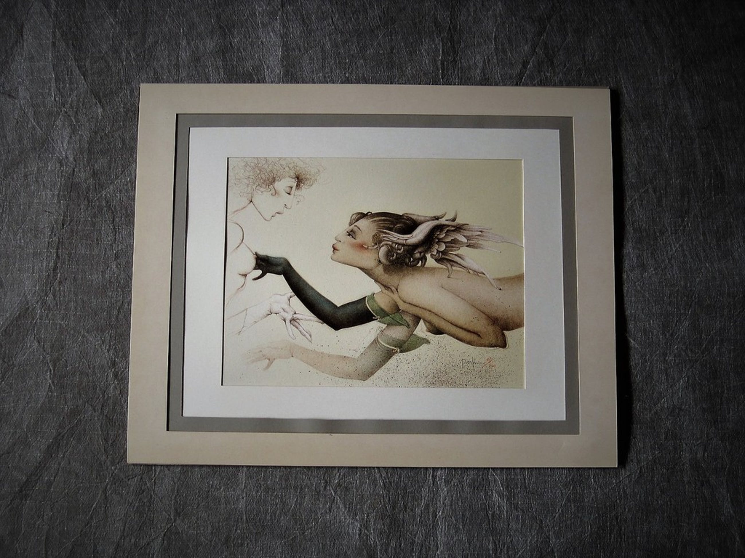 In 1975 Michael Parkes settled definitively in Spain where he engaged in the development of his artwork and where he still lives today. Early on, he painted in the generally abstract expressionist style common among his teachers, but after his pause for reflection he began to draw and paint in a meticulous style of detailed representation which enabled him to give full expression to his inner world of images. Here strange beasts encounter mysterious winged women, good and evil fight out their immemorial conflict and in this weightless environment worlds are unmade and remade nearer to the heart's desire. Even as a student Parkes was fascinated by various graphic processes, and until 2002 he was highly proficient in the difficult medium of the colour stone lithograph.
