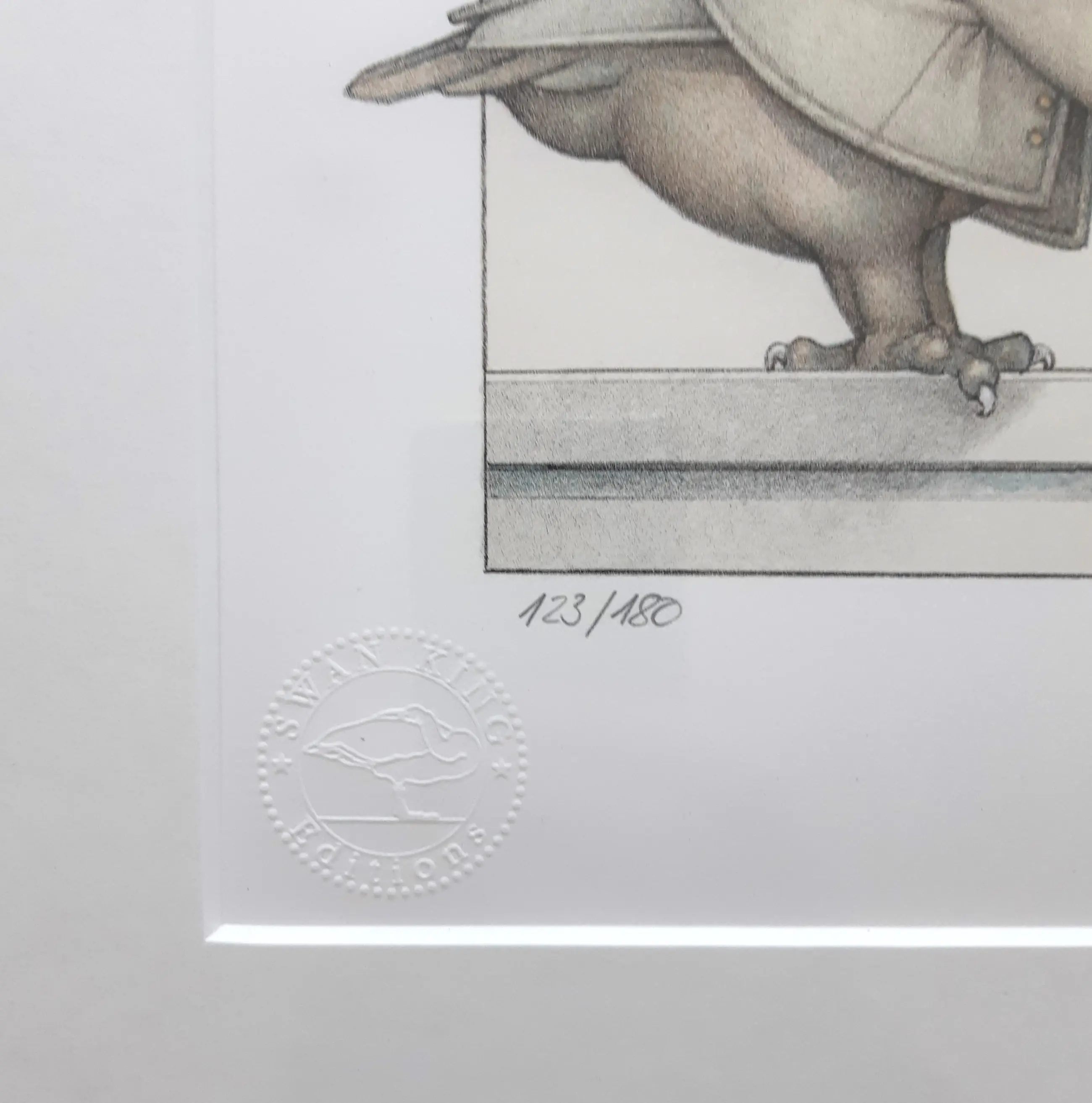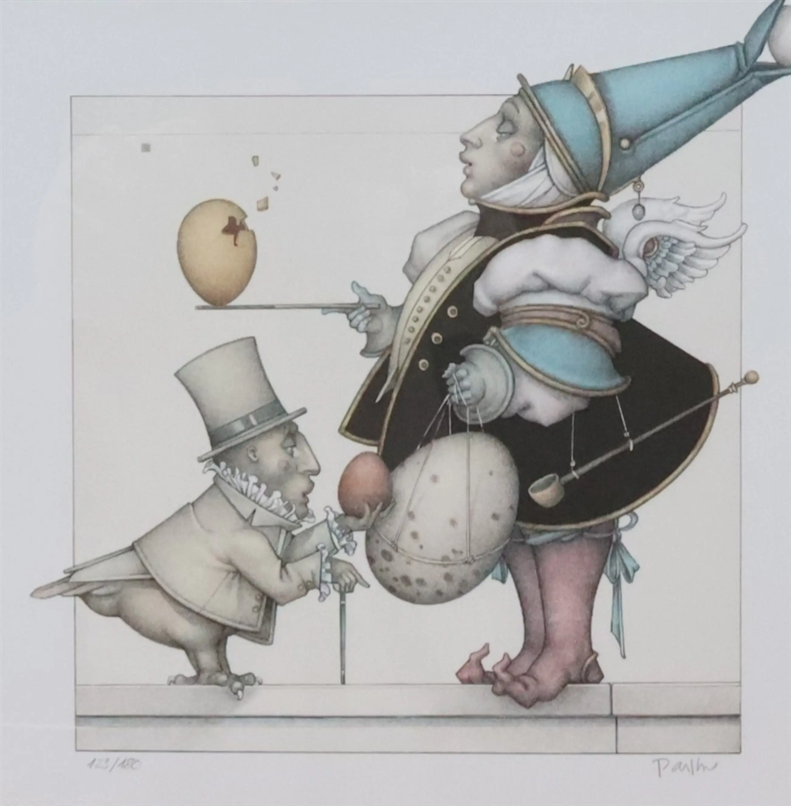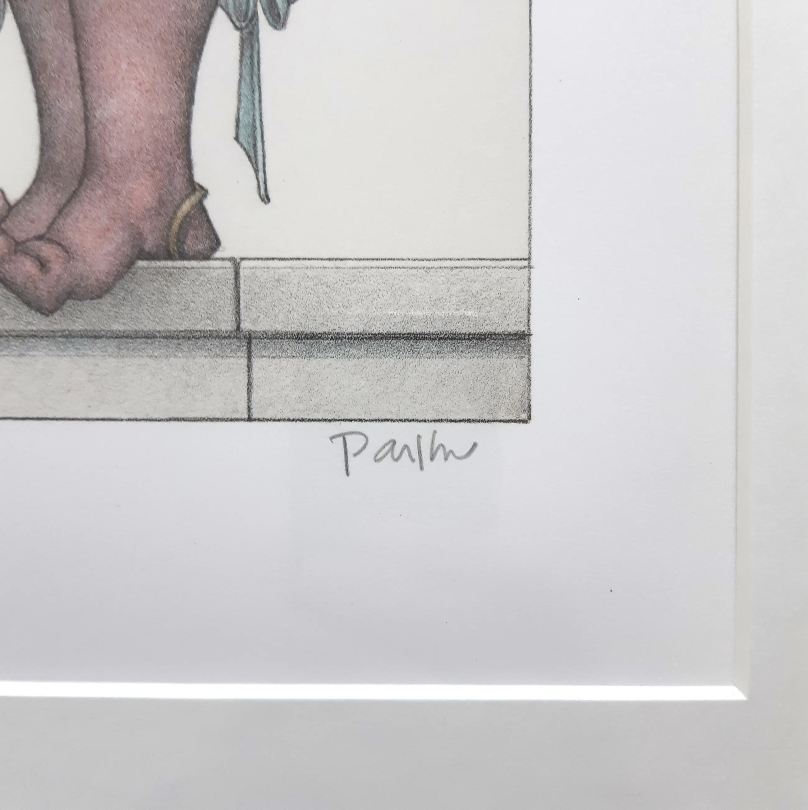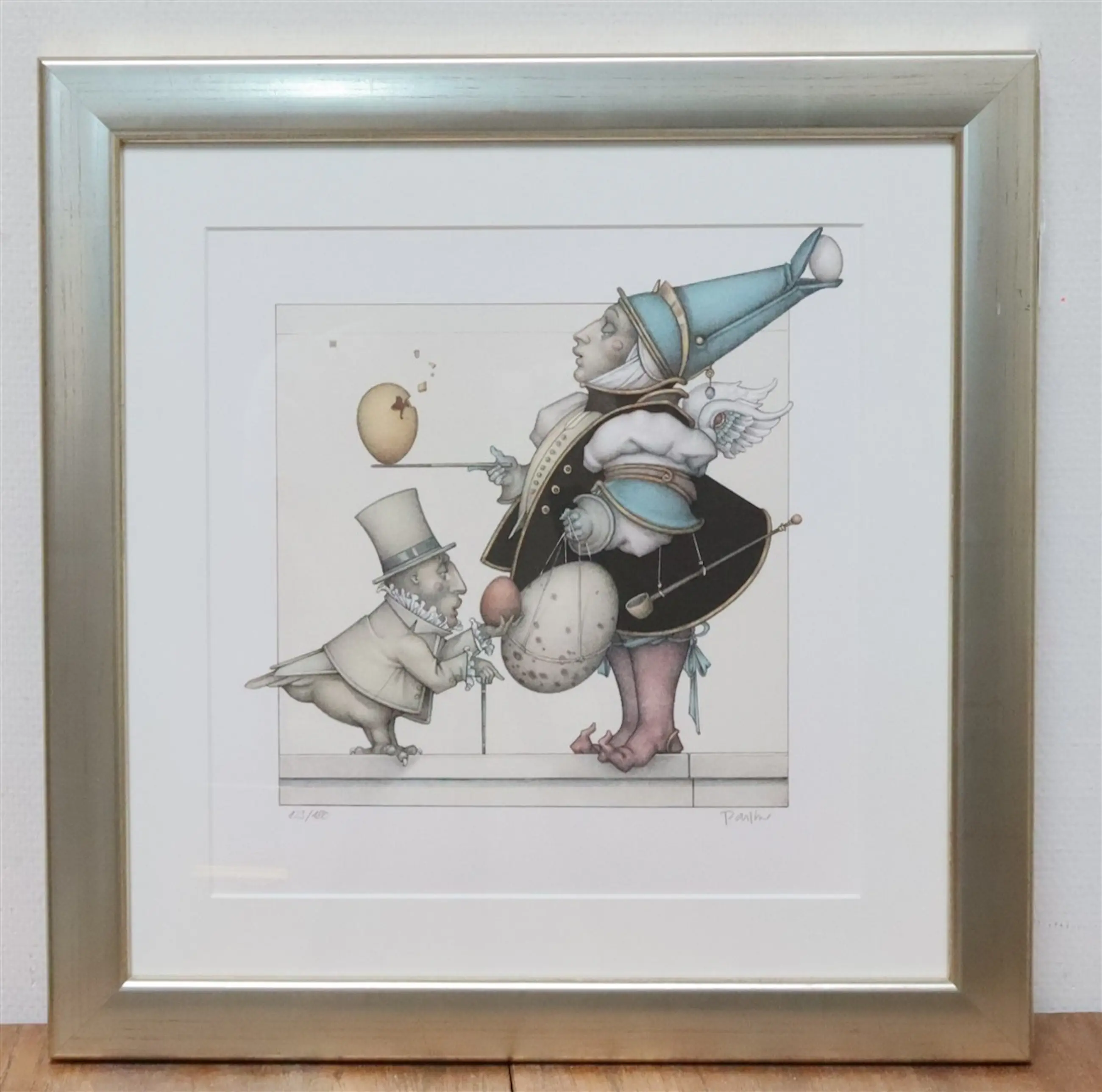 Meteen herkenbaar als steendruk van Michael Parkes. Met potlood door de maker gesigneerd en genummerd, voorzien van blindstempel. Ingelijst in stijlvolle zilverkleurige houten lijst. Het geheel verkeert in nieuwstaat. Op de foto's kunnen reflectiues zichtbaar zijn.