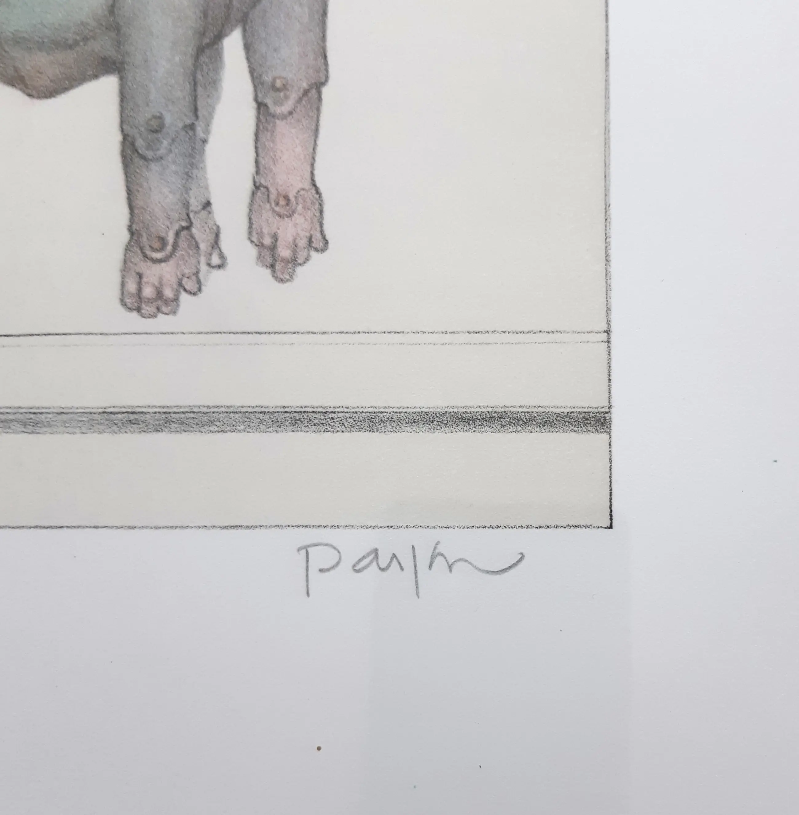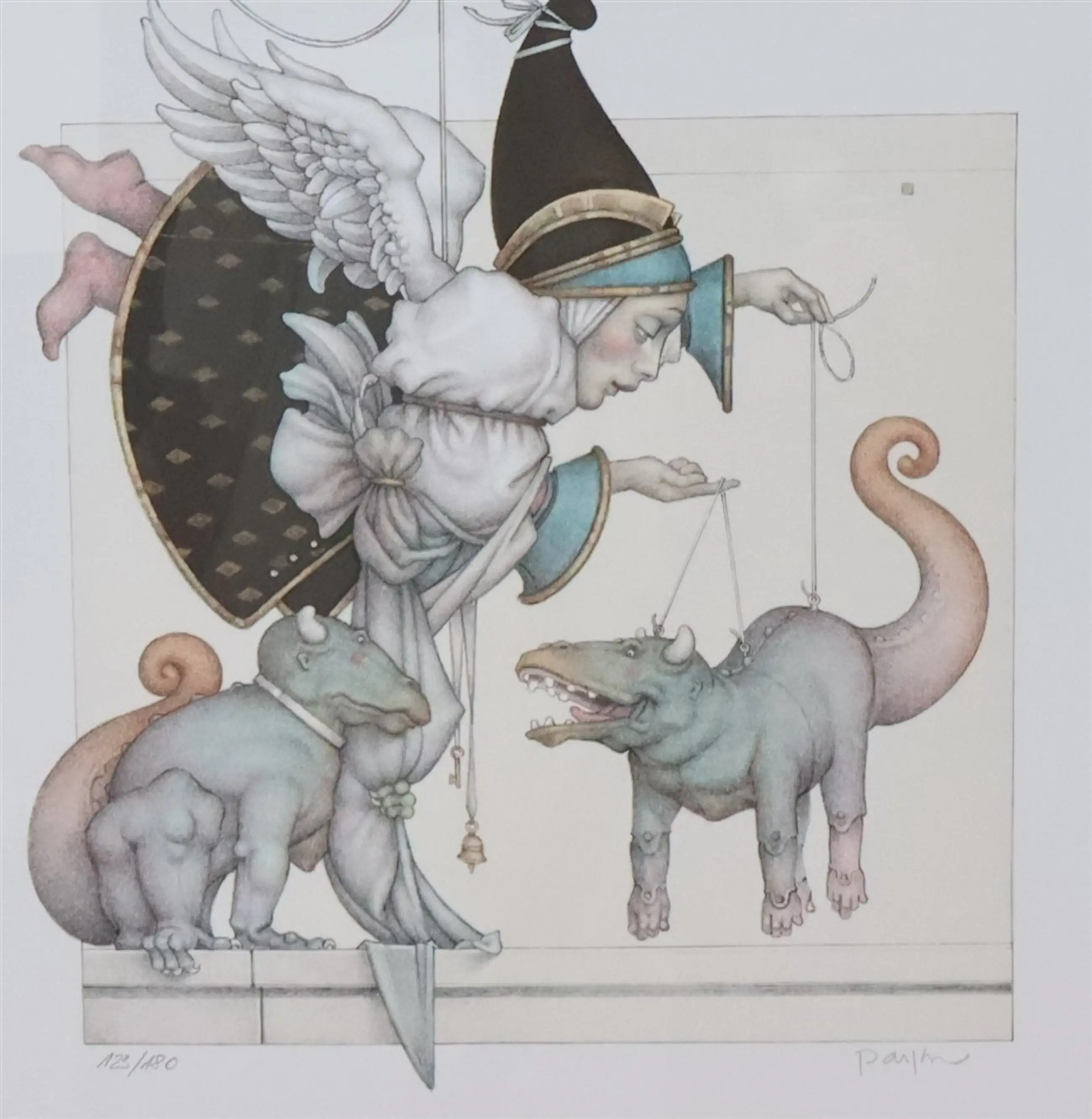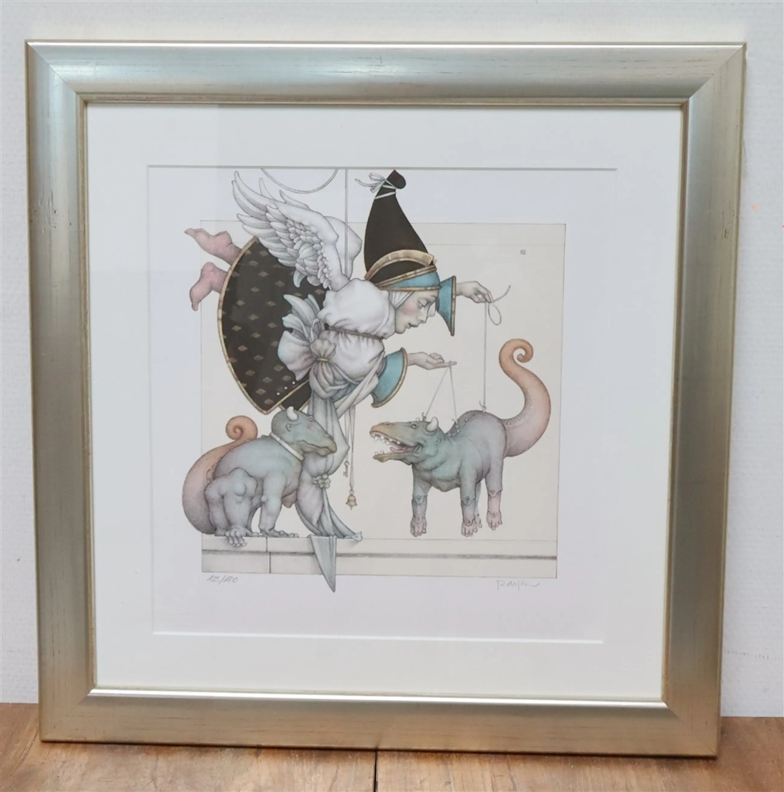 Meteen herkenbaar als steendruk van Michael Parkes. Met potlood door de maker gesigneerd en genummerd, voorzien van blindstempel. Ingelijst in stijlvolle zilverkleurige houten lijst. Het geheel verkeert in nieuwstaat. Op de foto's kunnen reflectiues zichtbaar zijn.