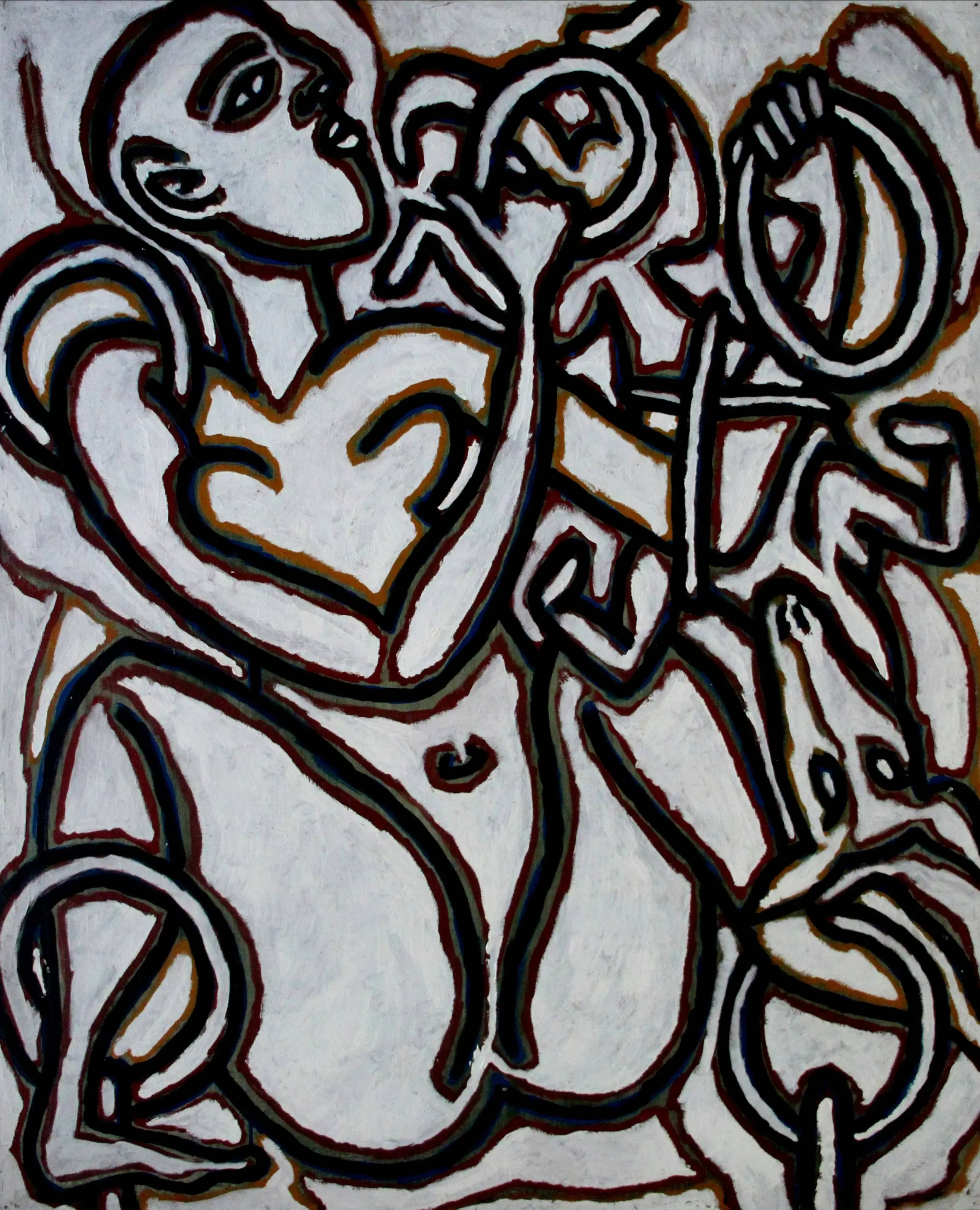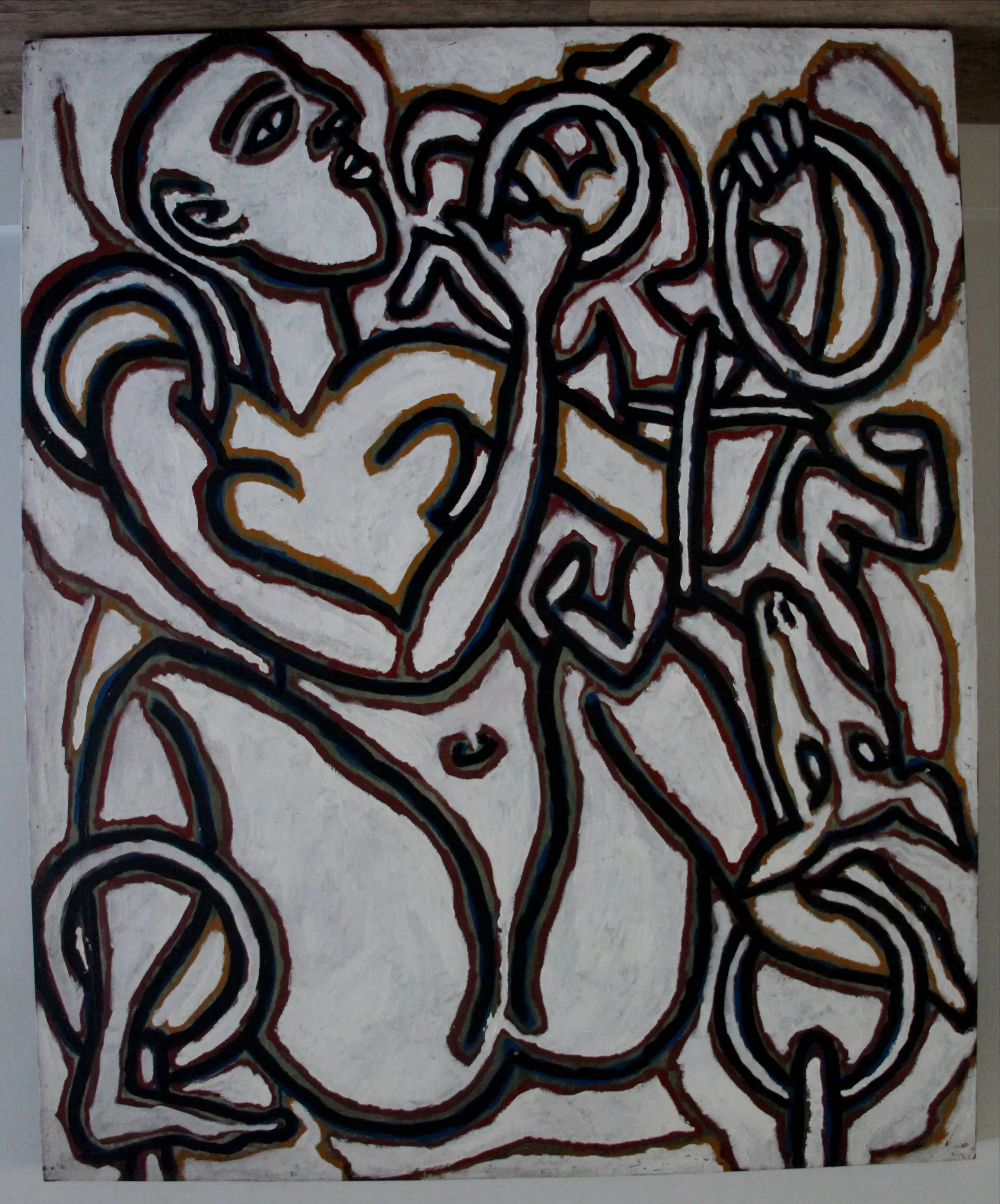 Acryl op board van Michaël Winkel. Jaar: 1984. Afmetingen werk: H122 x b100cm. Het werk is niet gesigneerd door de kunstenaar.