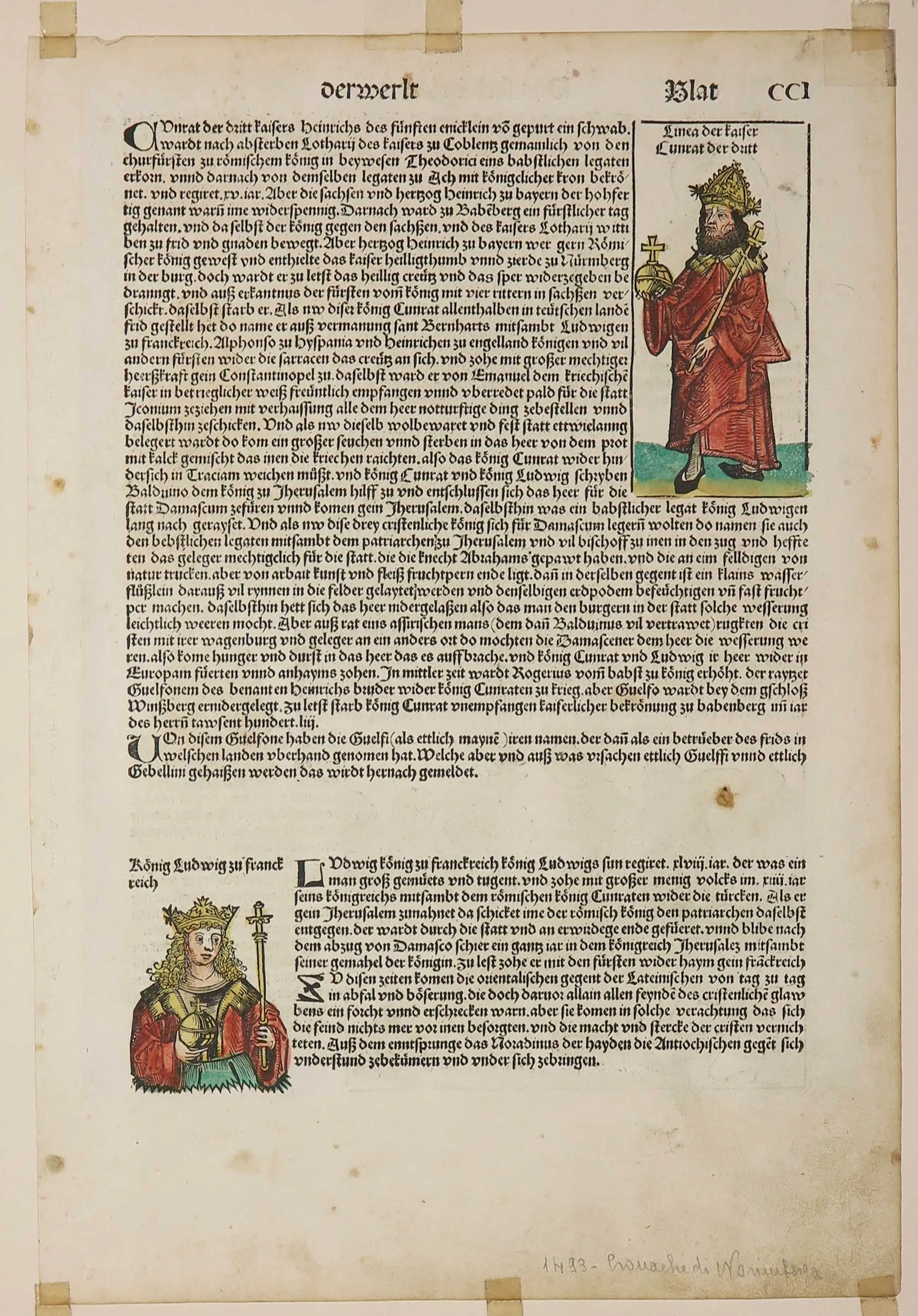 Incunabel of wiegendruk en houtsnede uit de bekende Neurenberg Chronicle, ook bekend onder de titel Liberchronicarum of Schedelsche Weltchronik. De Kroniek van Neurenberg wordt gezien als één van de meest rijk geïllustreerde werken in de vroege boekdrukkunst en bevat zo'n 1.800 houtsneden van Michael Wolgemut en Wilhelm Pleydenwurff.