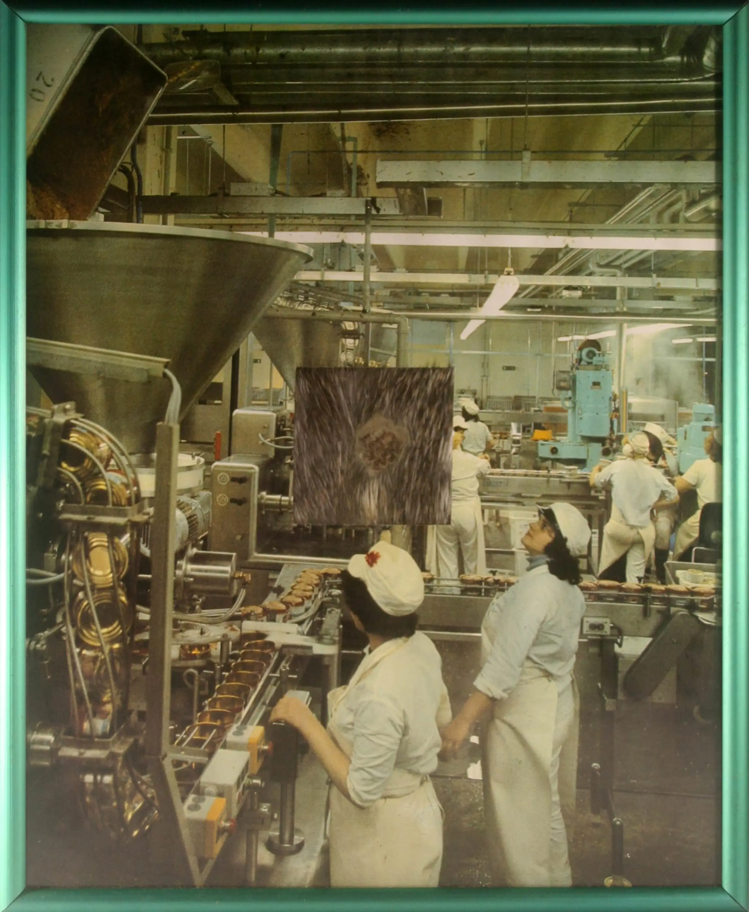 Het bestaat uit een kleurenfoto met dames aan een lopende band met in het midden een stukje bont gemonteerd waar een van de dames verbaasd naar op lijkt te kijken.