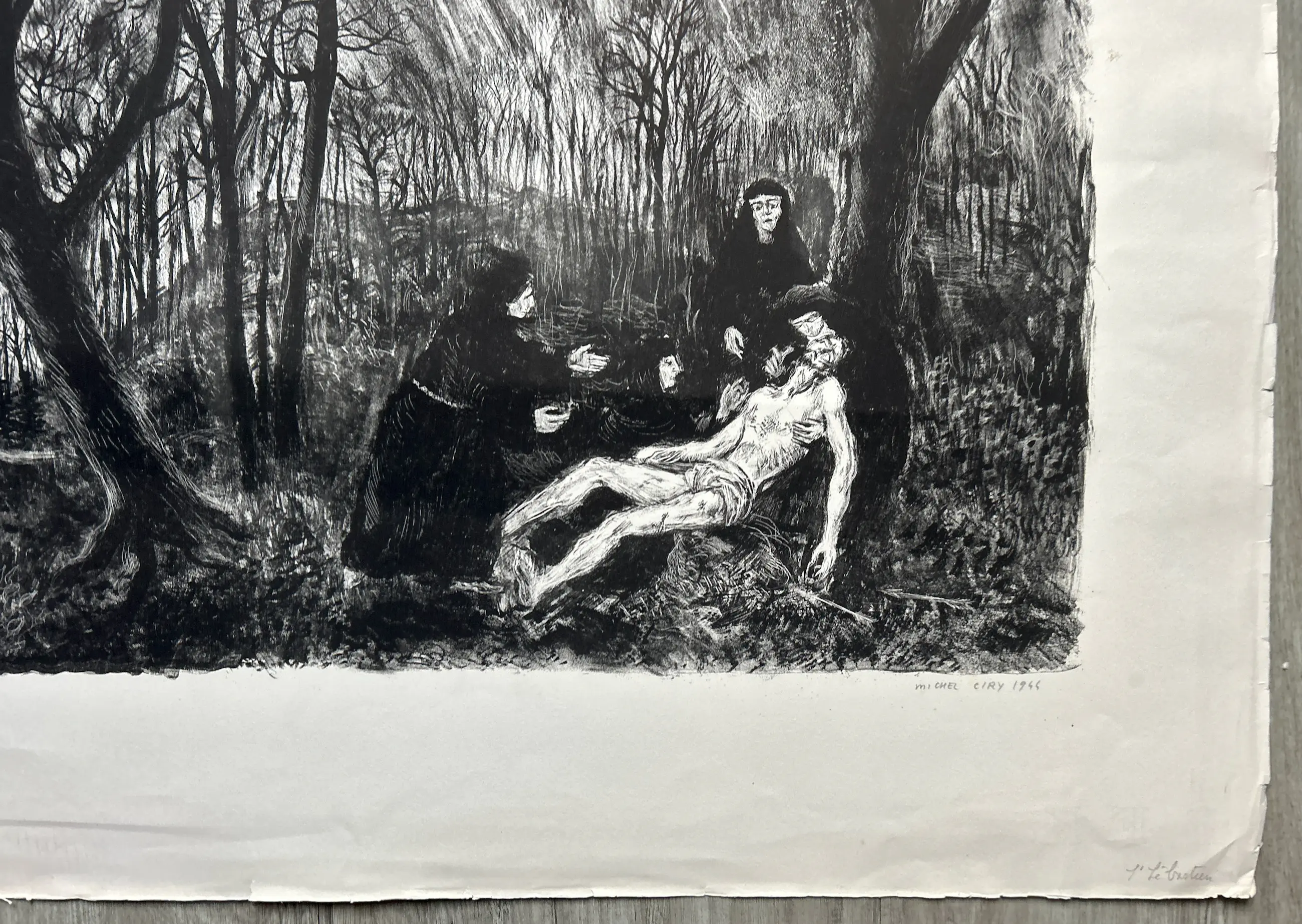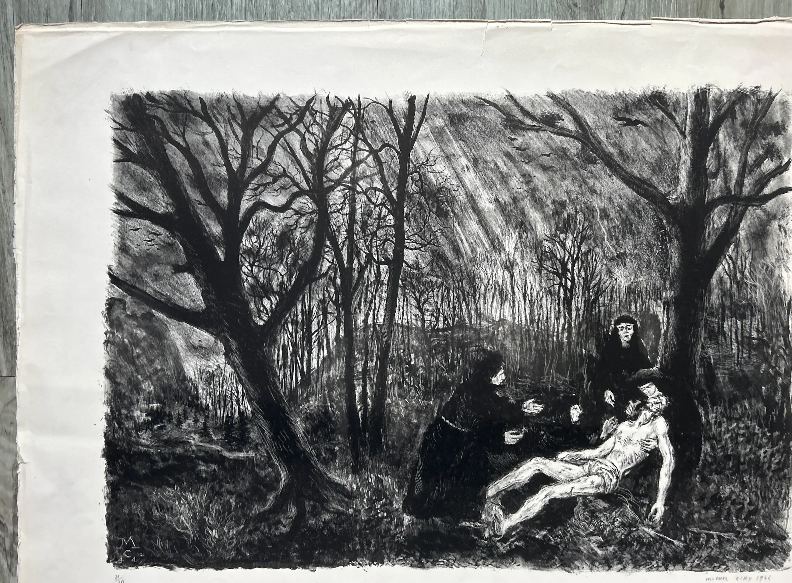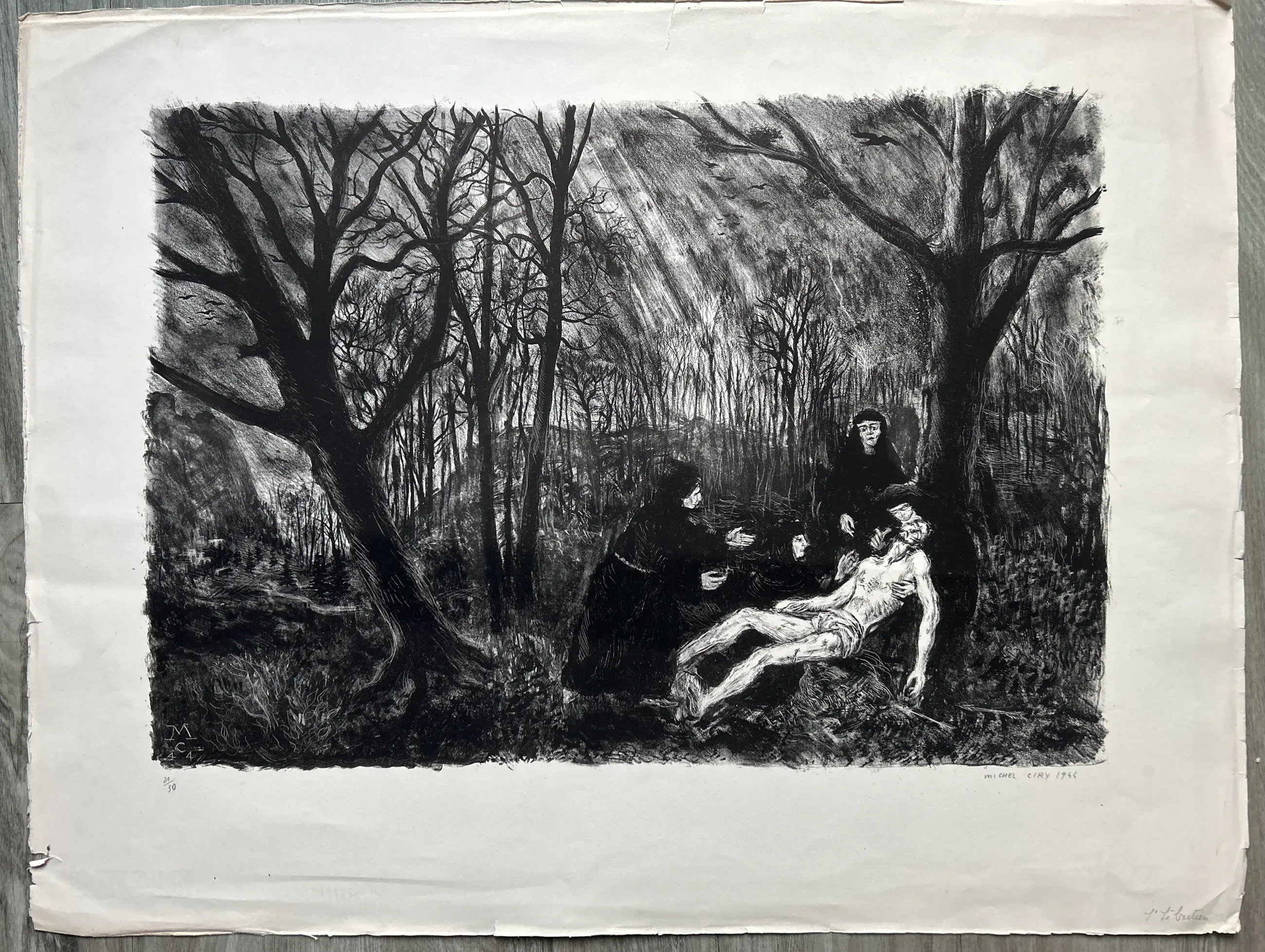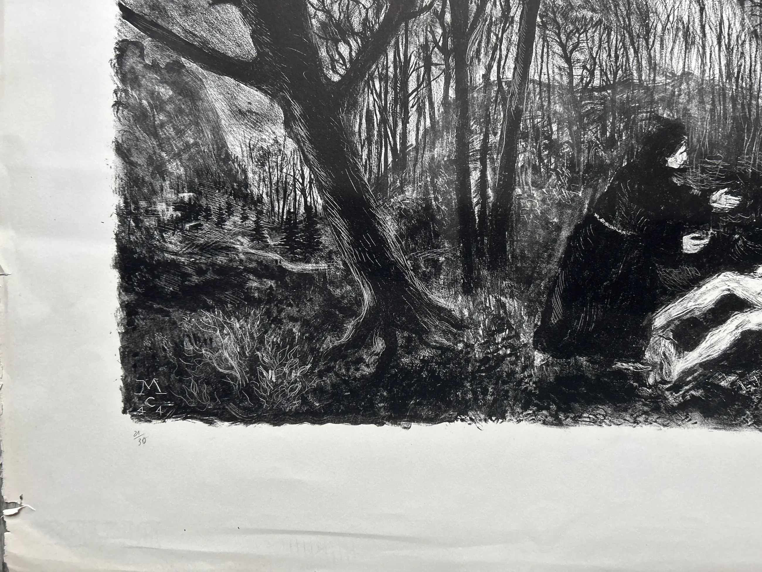 Conditie: afbeelding zeer goed. Vel heeft vlekjes en rand vel kleine scheurtjes, zie foto's. Editie: 21/30. Afmeting: afbeelding 37 x 53 cm.