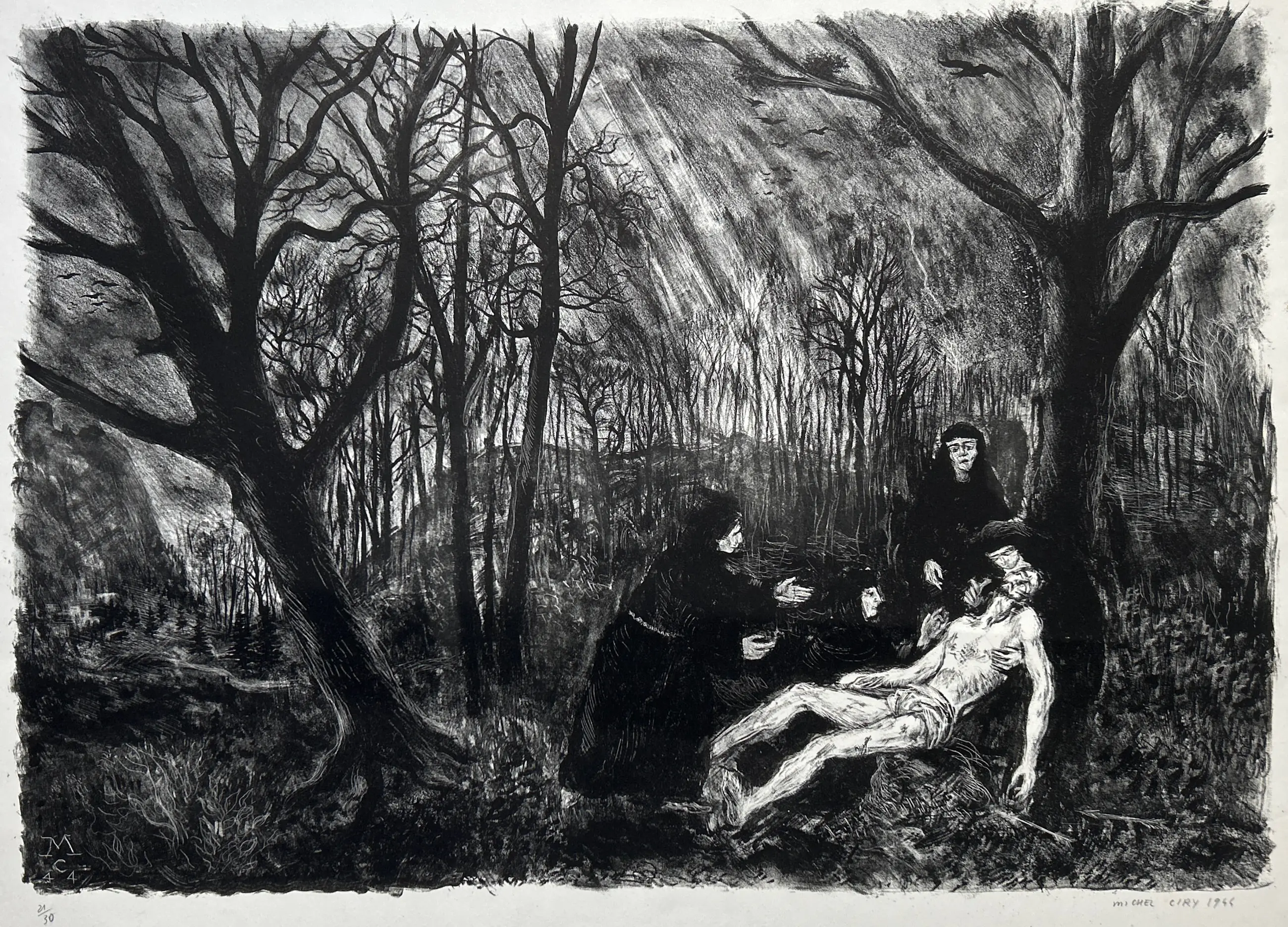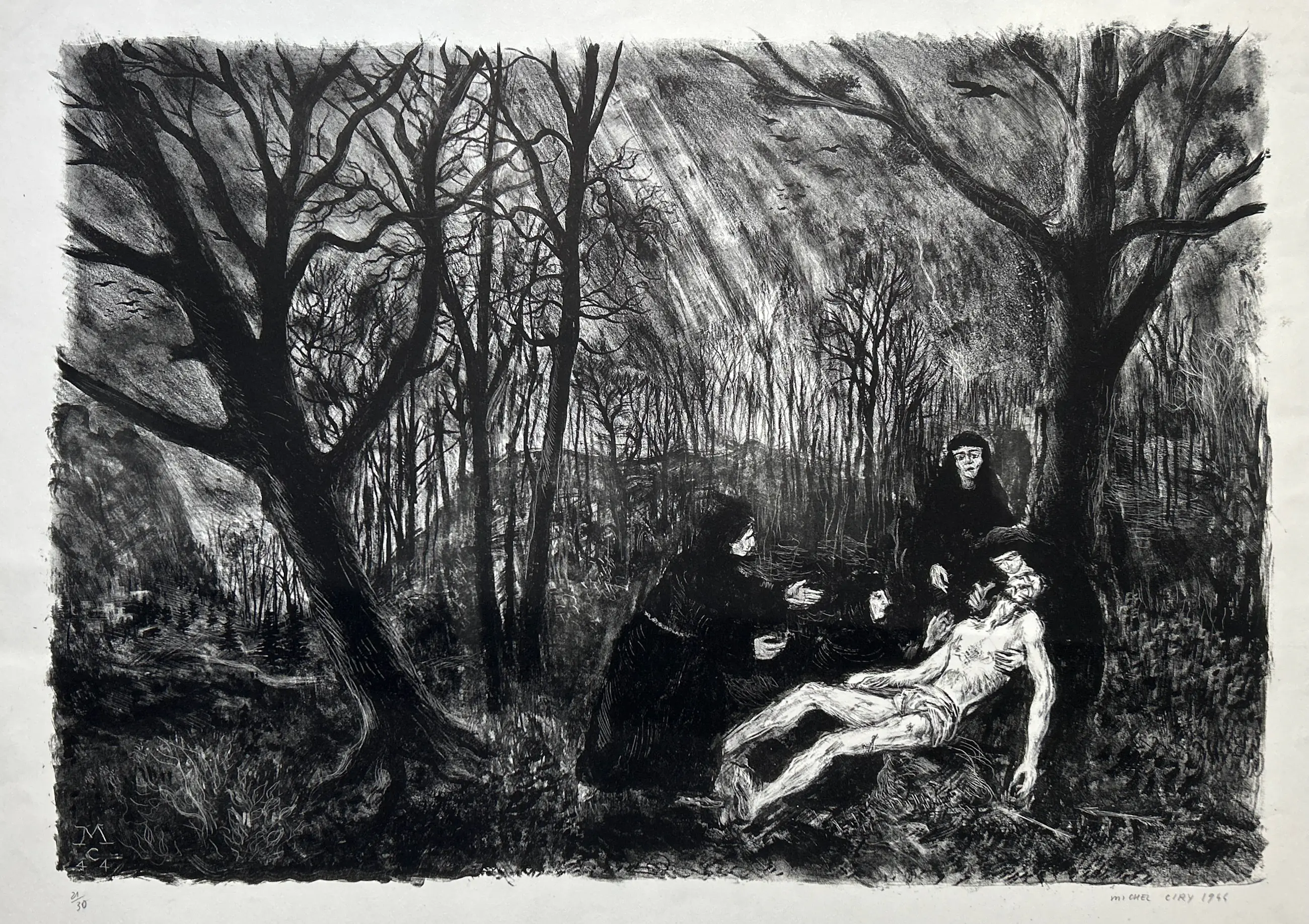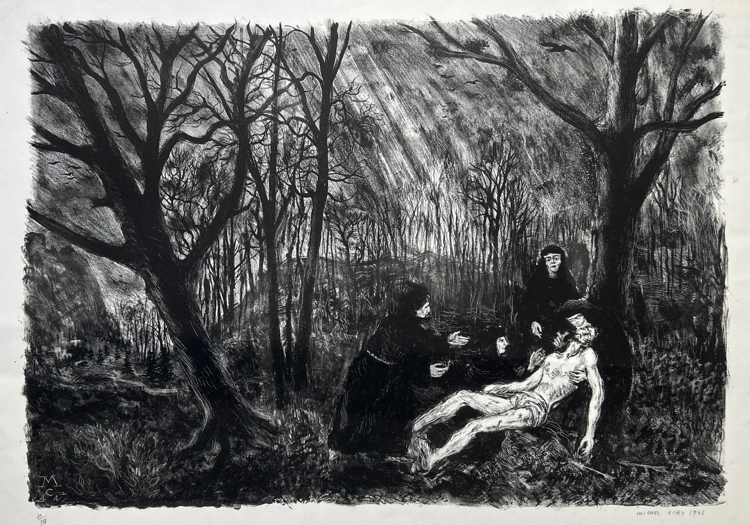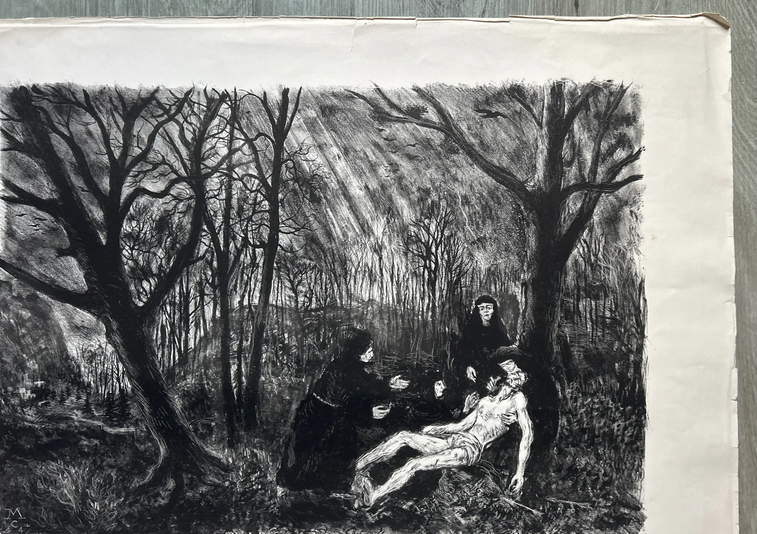 Conditie: afbeelding zeer goed. Vel heeft vlekjes en rand vel kleine scheurtjes, zie foto's. Editie: 21/30. Afmeting: afbeelding 37 x 53 cm.