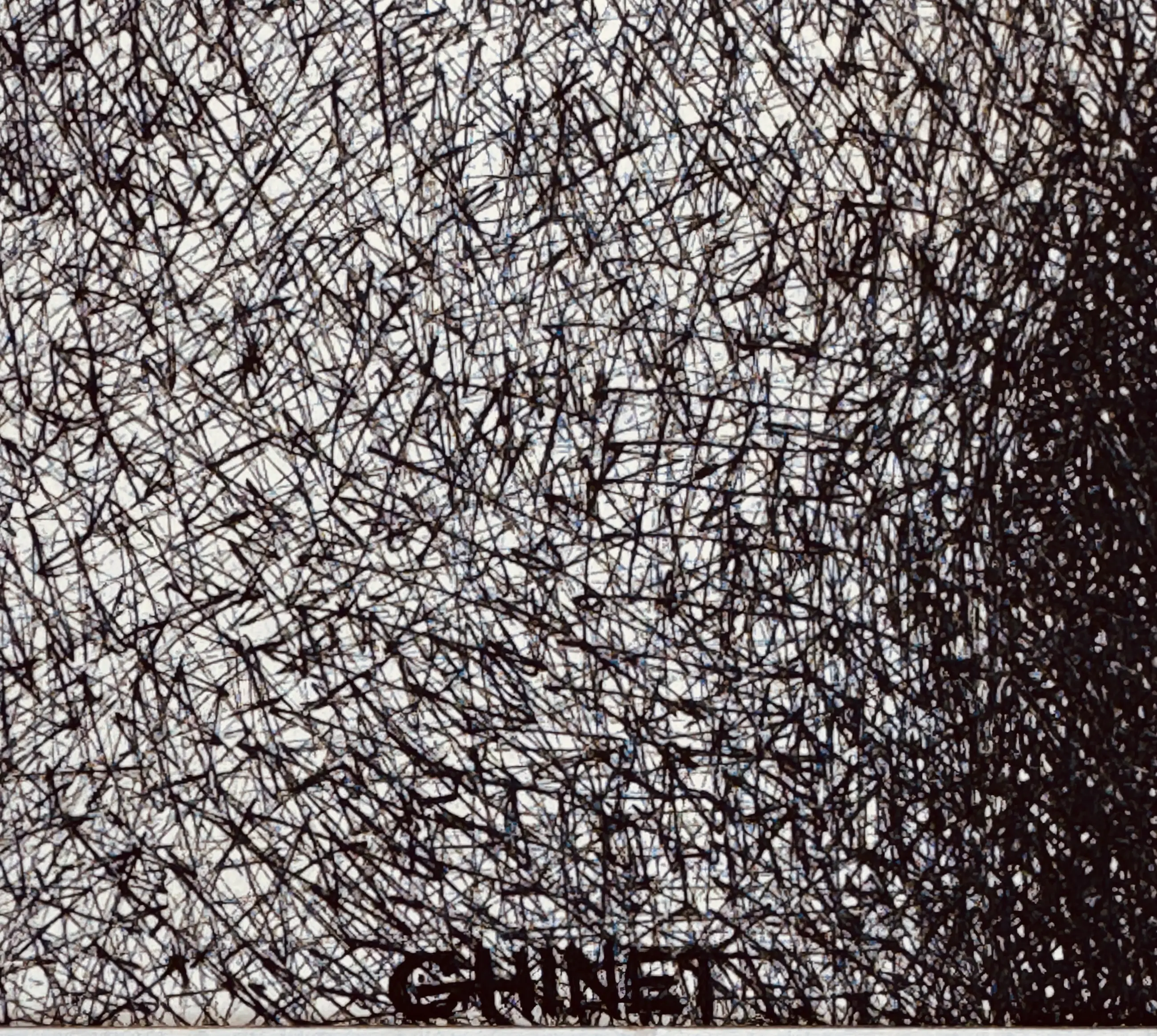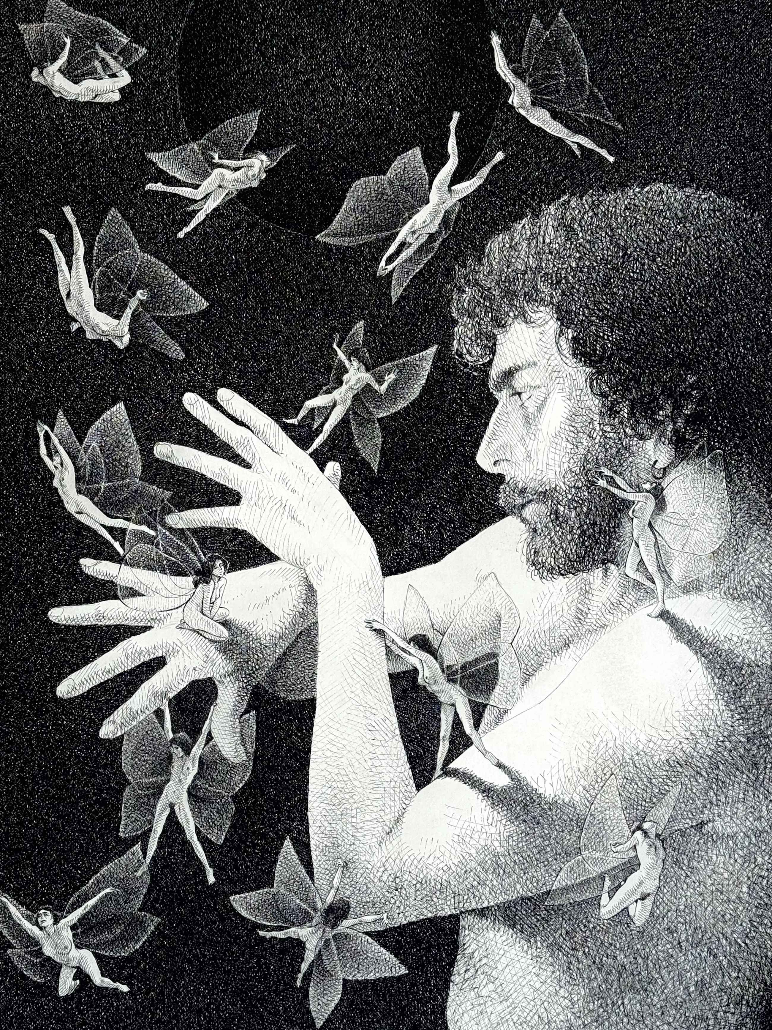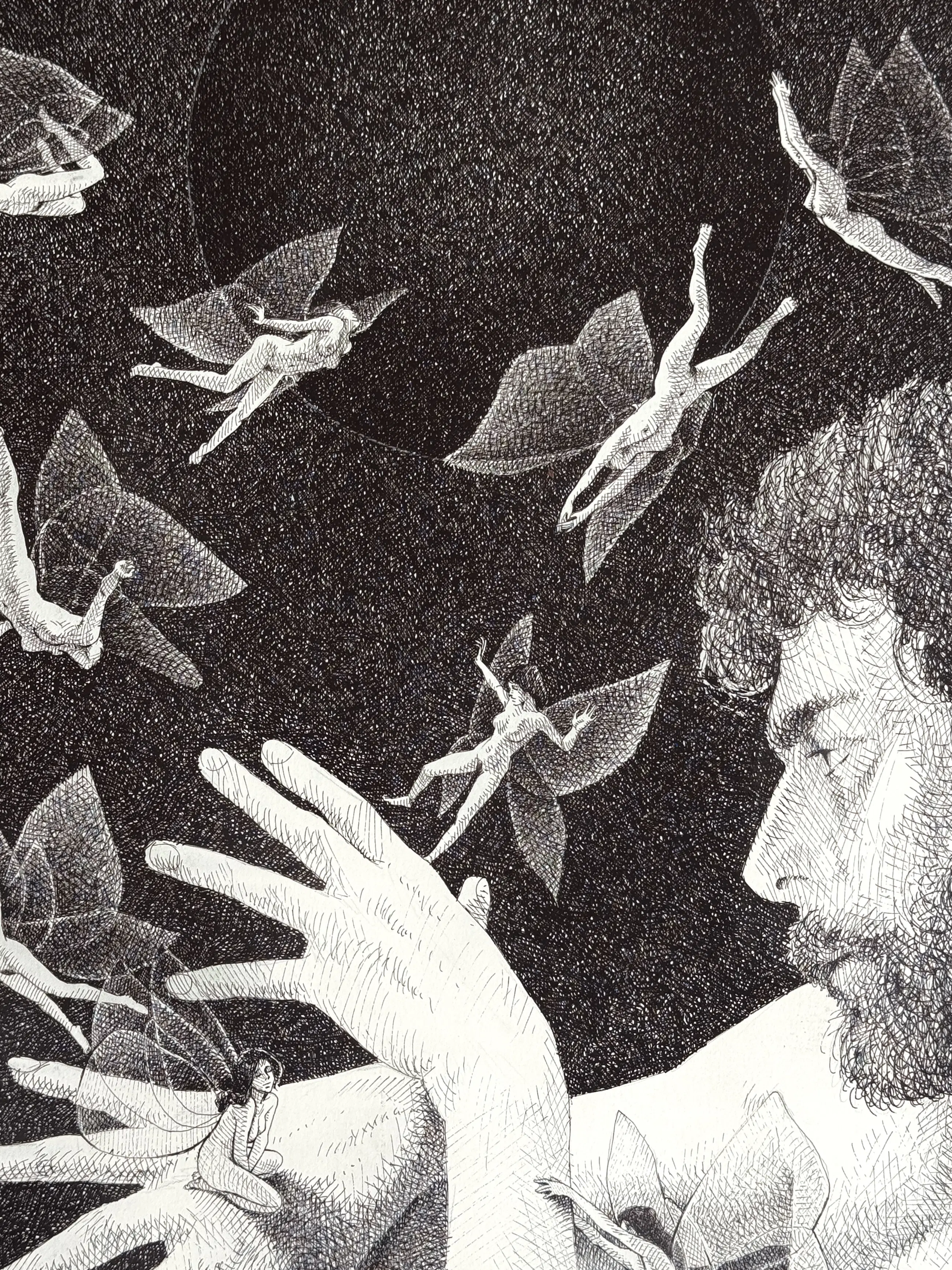 Ghinets meesterschap in de lijnvoering komt tot uiting in het minutieuze stippelen en arceren, waardoor een opvallend contrast ontstaat tussen licht en schaduw. Dit geeft leven aan deze gevleugelde figuren die rond het hoofdpersonage lijken te trillen. Elk detail getuigt van een zeldzame technische virtuositeit, waarbij inkt levende materie wordt en uitnodigt tot een poëtische onderdompeling in een universum dat zowel mysterieus als sensueel is.