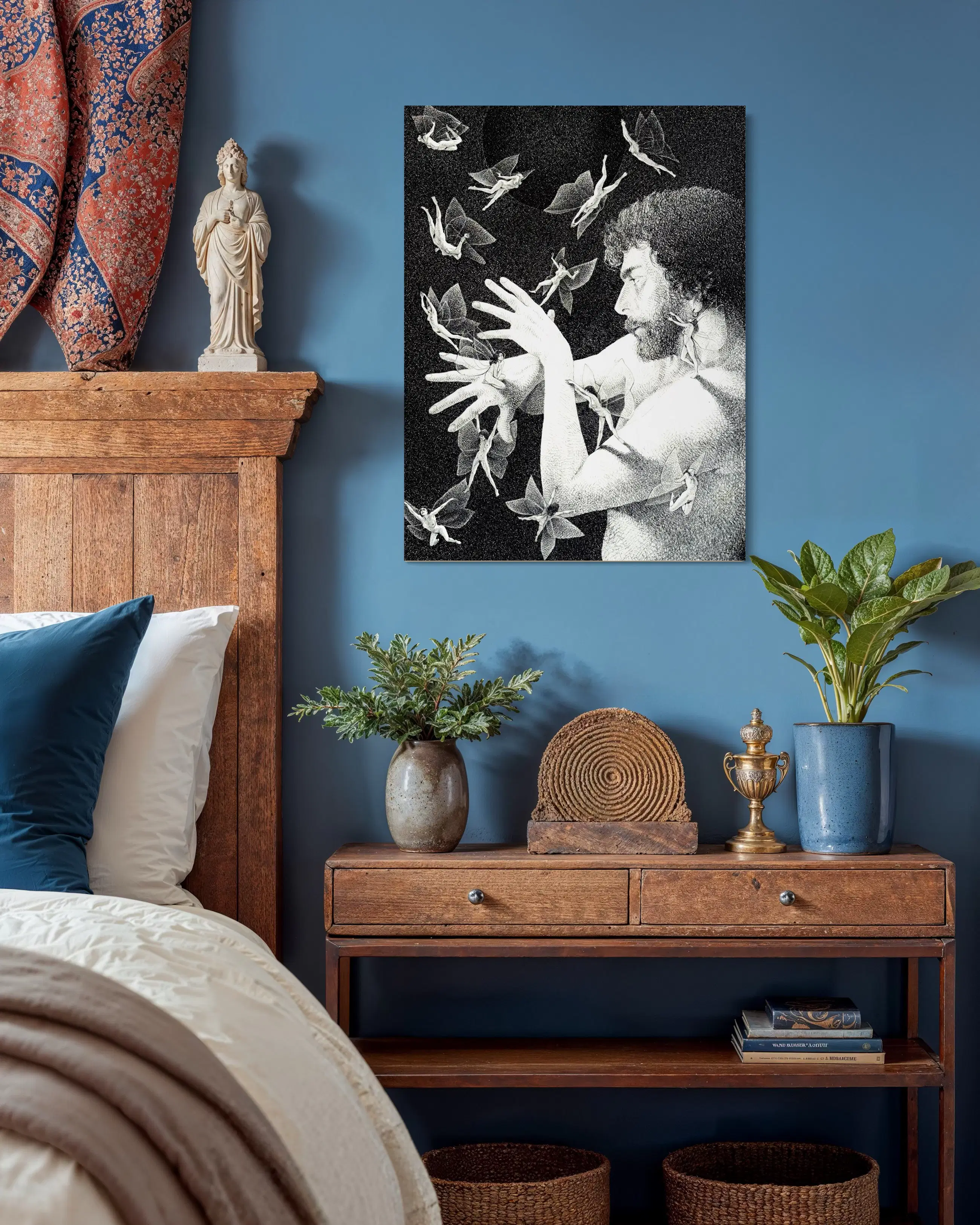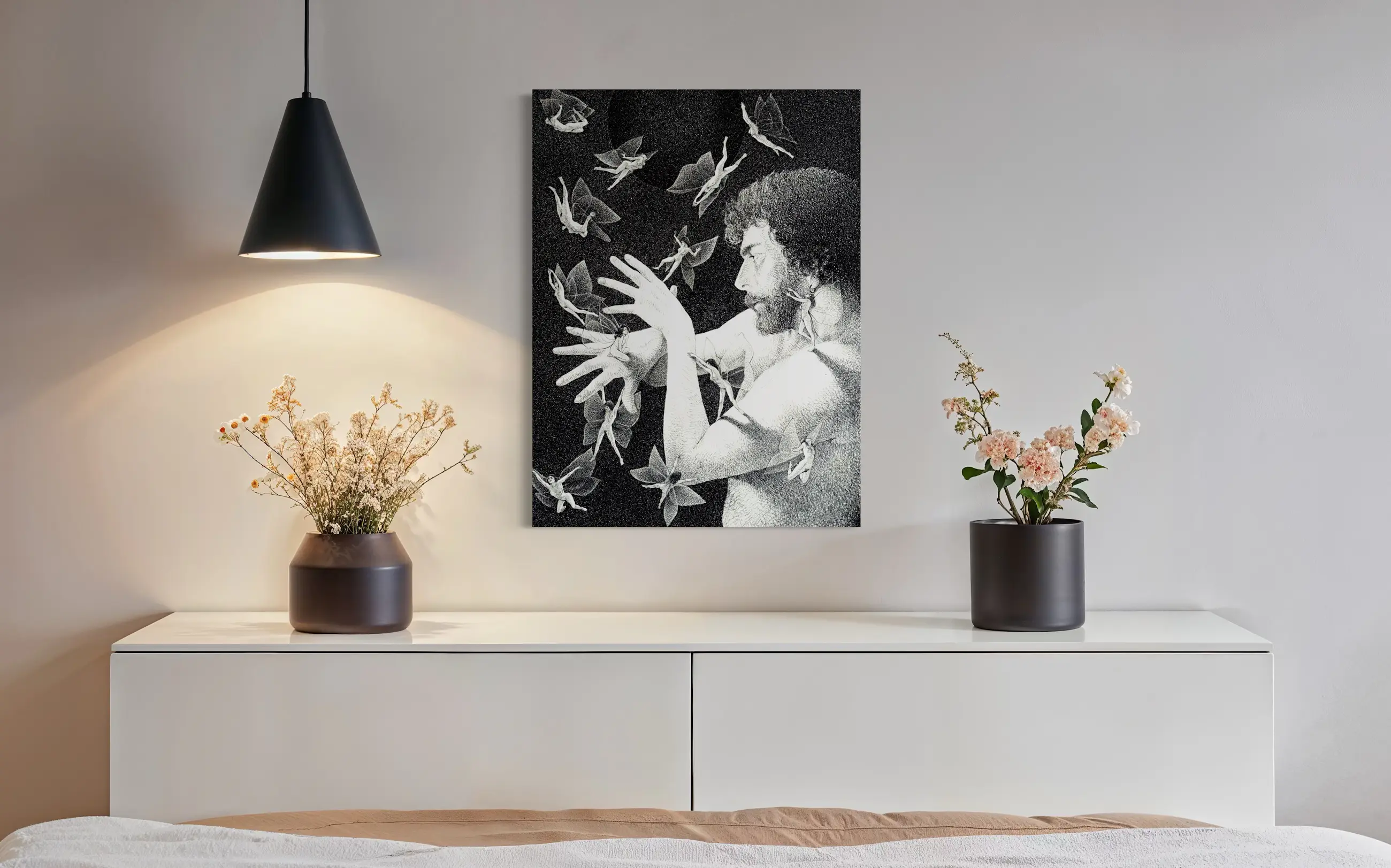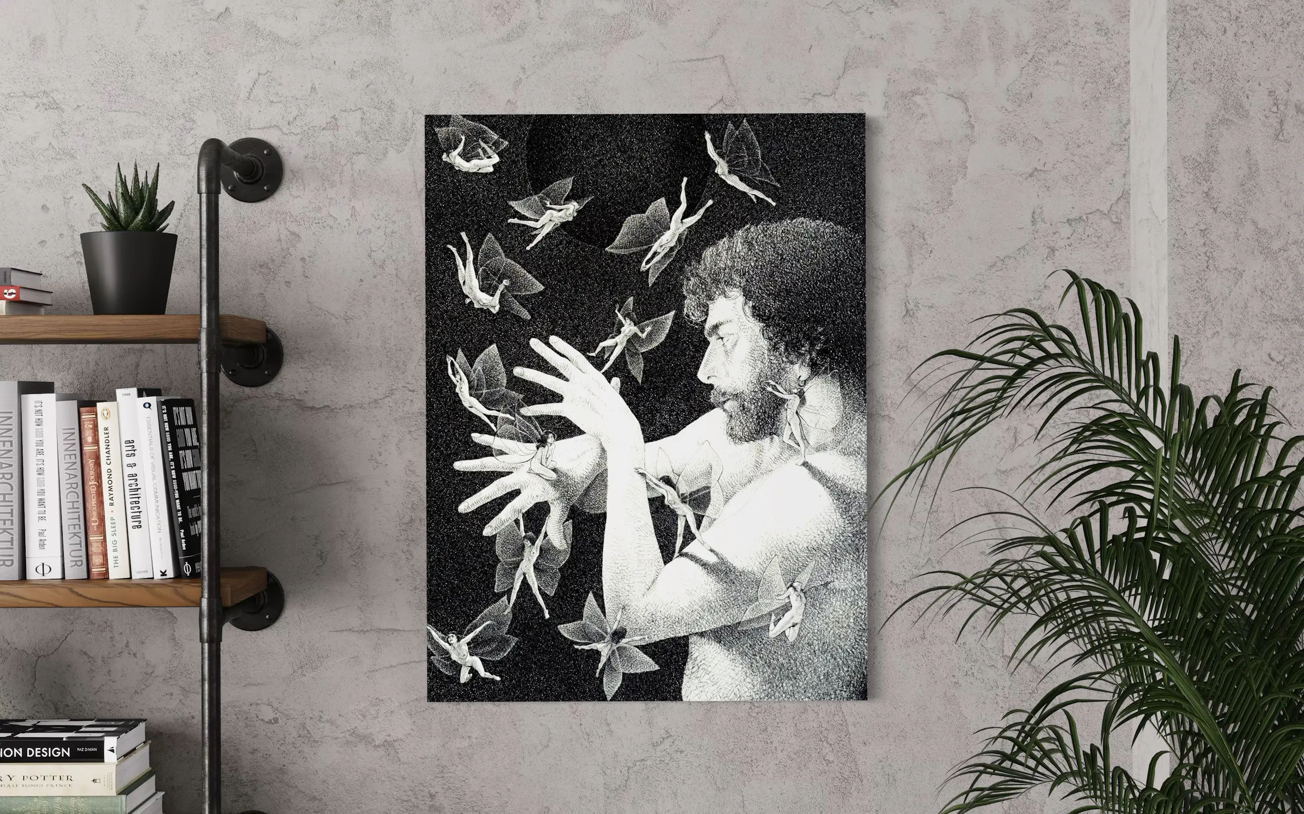 Ghinets meesterschap in de lijnvoering komt tot uiting in het minutieuze stippelen en arceren, waardoor een opvallend contrast ontstaat tussen licht en schaduw. Dit geeft leven aan deze gevleugelde figuren die rond het hoofdpersonage lijken te trillen. Elk detail getuigt van een zeldzame technische virtuositeit, waarbij inkt levende materie wordt en uitnodigt tot een poëtische onderdompeling in een universum dat zowel mysterieus als sensueel is.