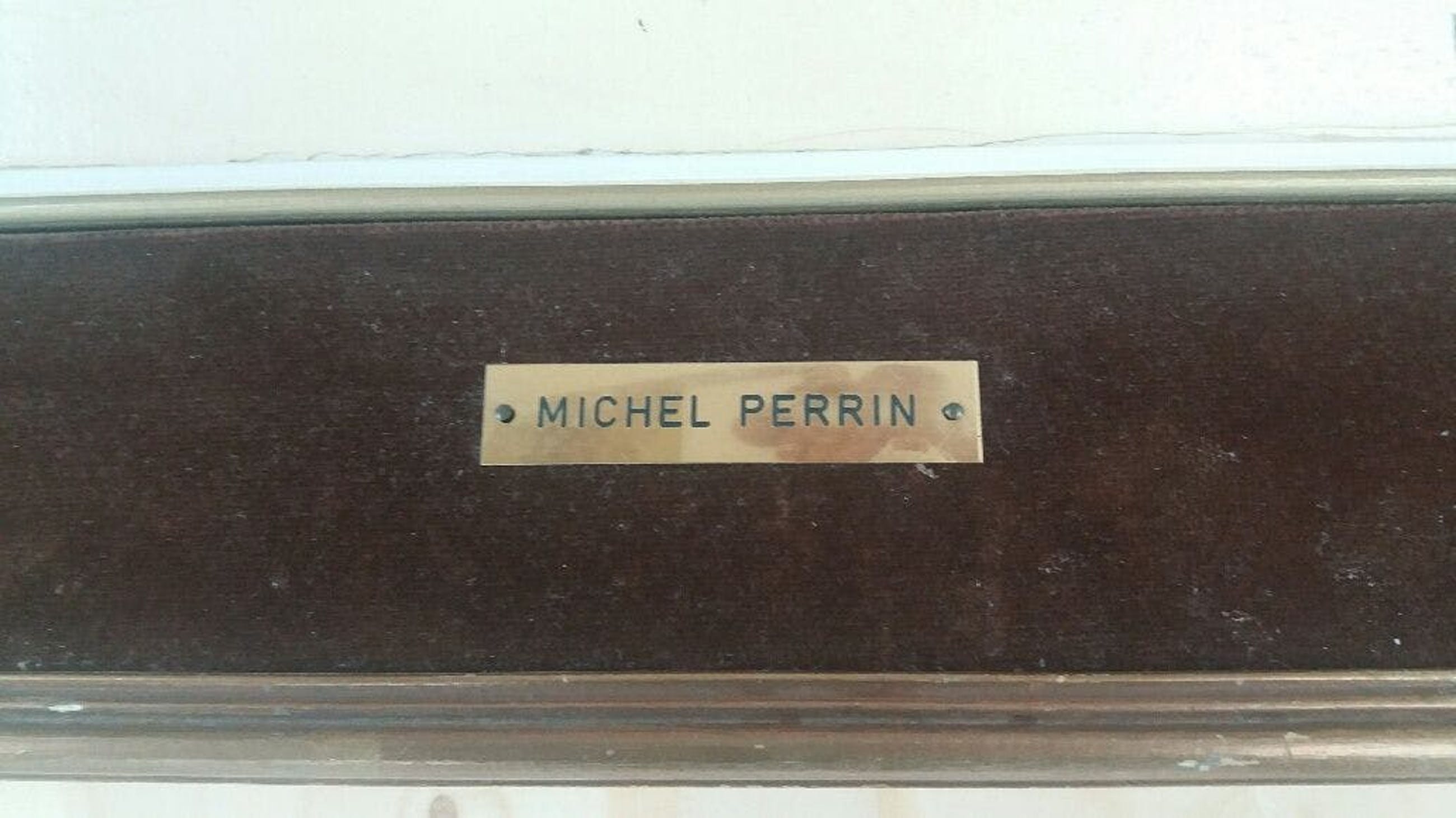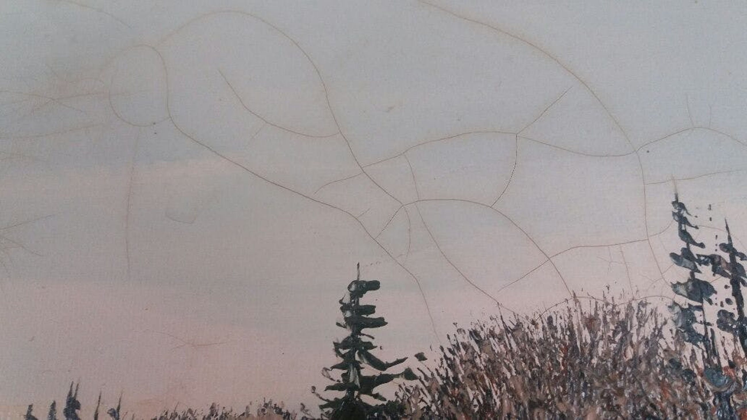 'Peintre de la neige'. Micael Perrin heeft gewerkt in Canada en Frankrijk en staat bekend om zijn sneeuwlandschappen. De verf heeft op twee paatsen wat barstjes die van dichtbij te zien zijn. ,