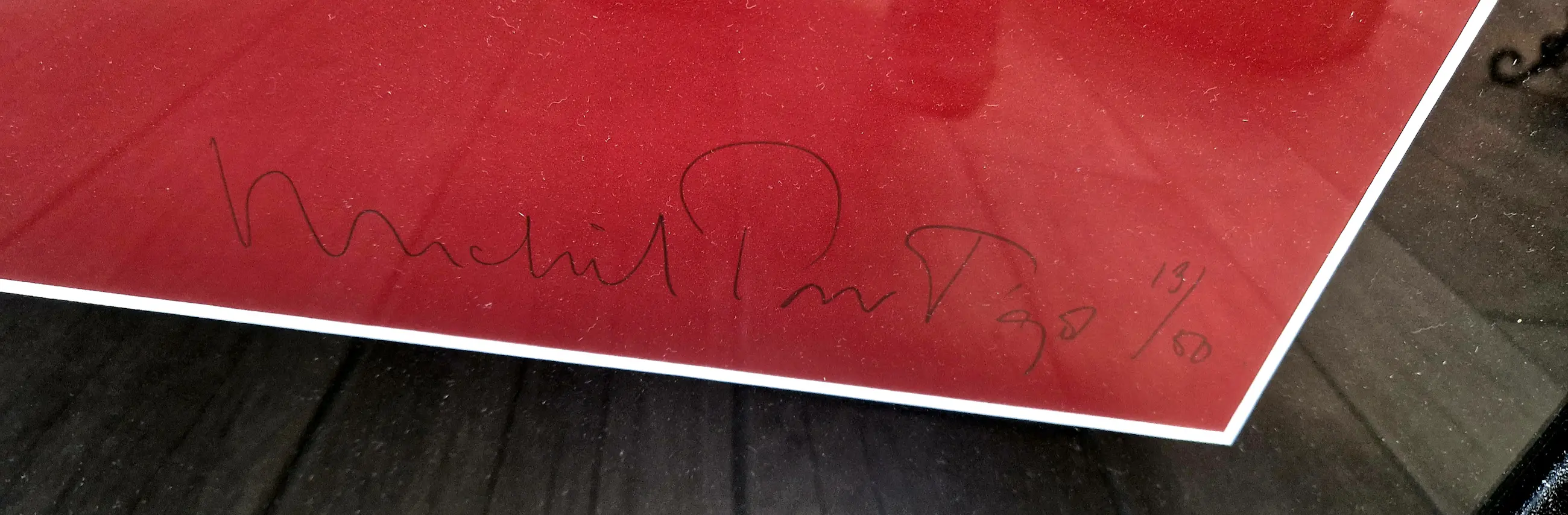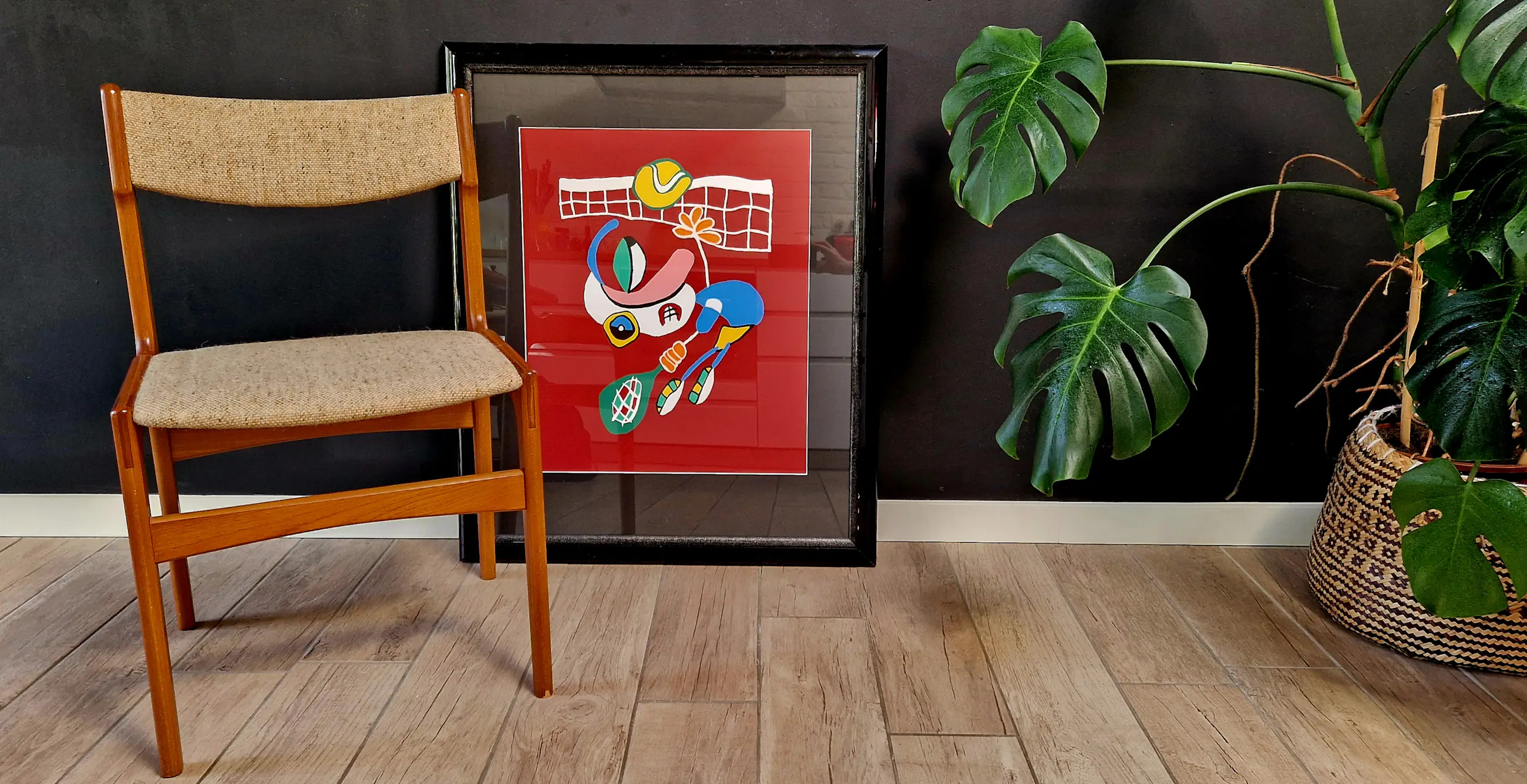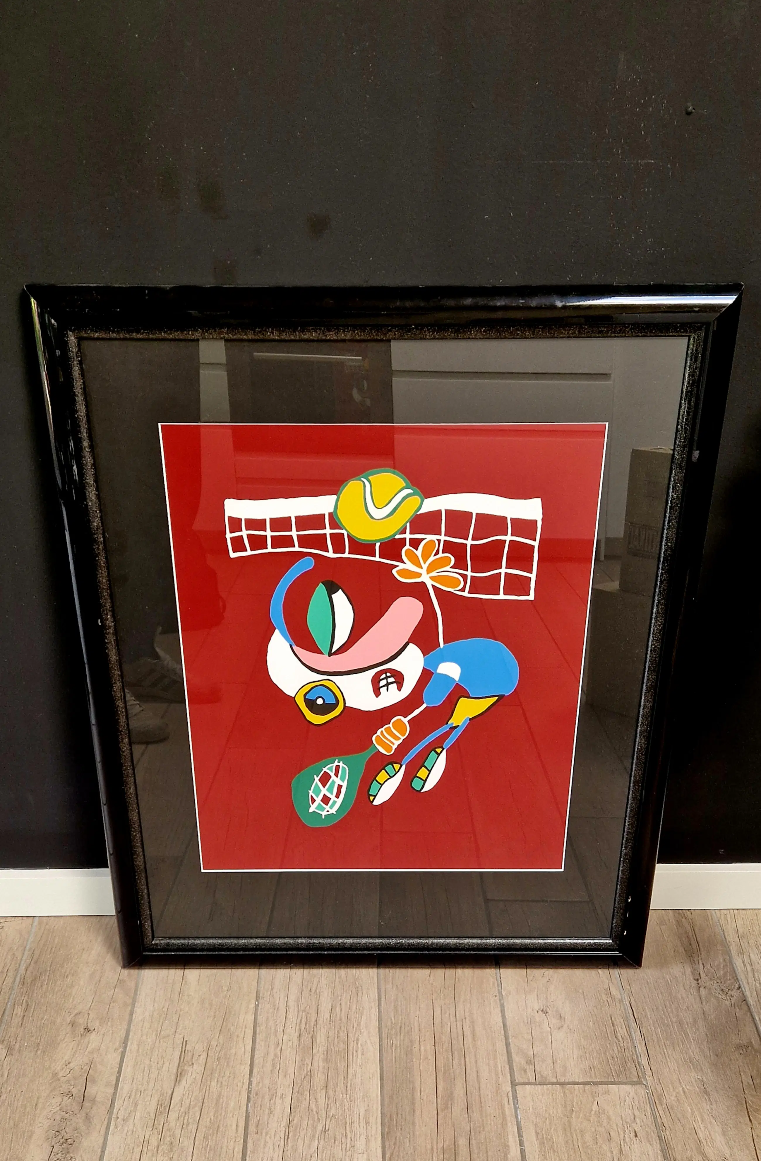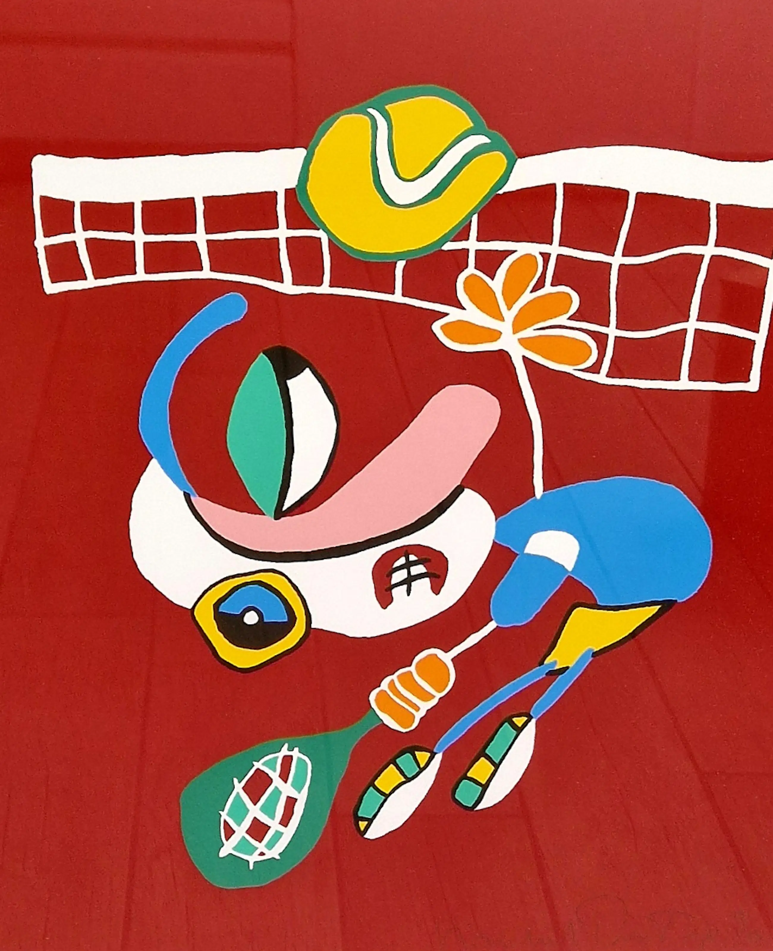Lithografie The Tennis Player van de Nederlandse kunstenaar Michel Poort uit 1990. Gesigneerd en genummerd 13/50. In zwart gelakte lijst, met passe-partout achter glas. Afmetingen 90x73, 59x49.