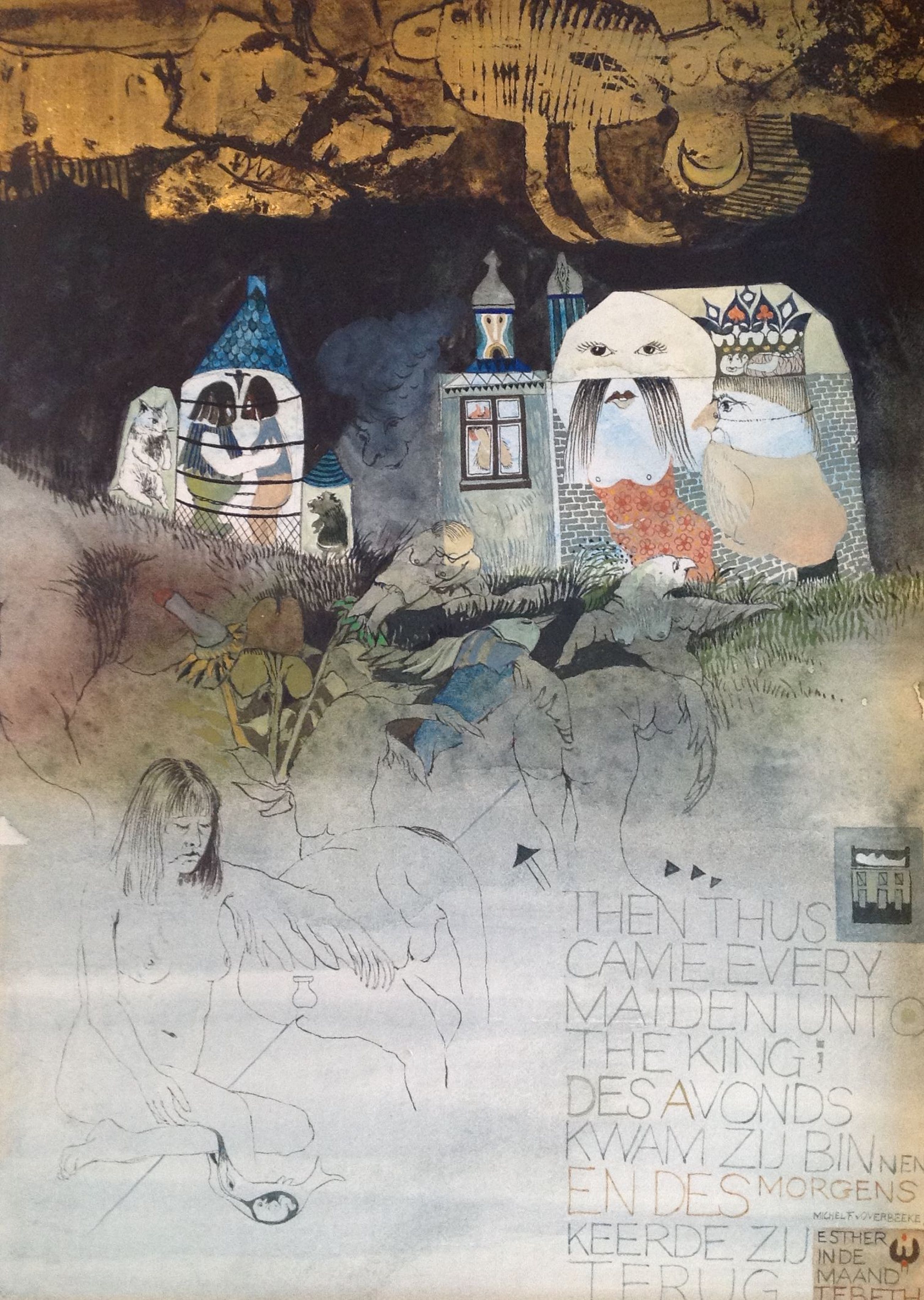 Michiel van Overbeeke, gem tech op papier, voorstelling met figuren, beeldmaat 22.5x16.5, passepartoutmaat 65x50.