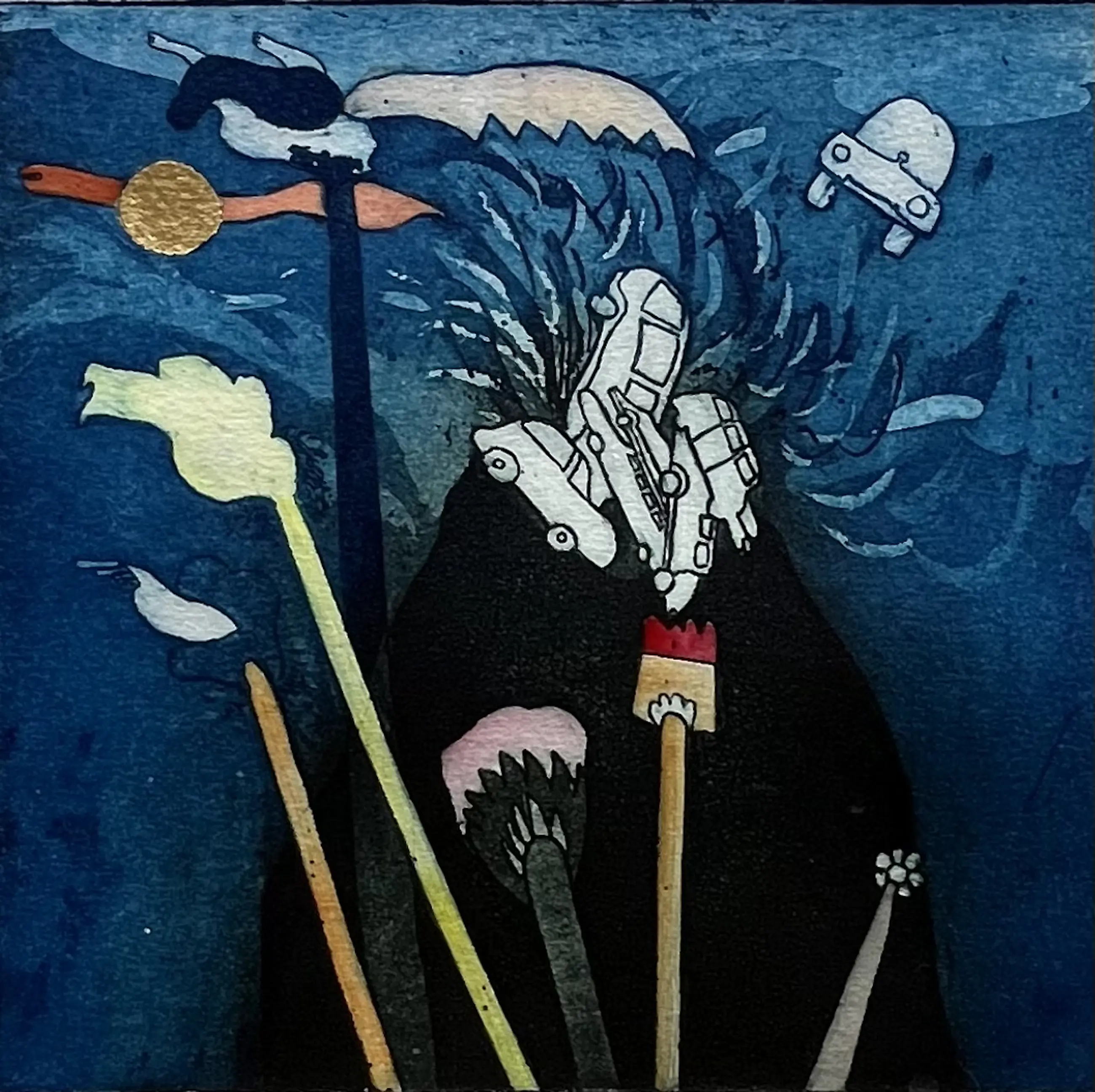 "On My Way II" Afmeting beeld 20cm x 20cm. Afmeting blad 65cm x 50cm.