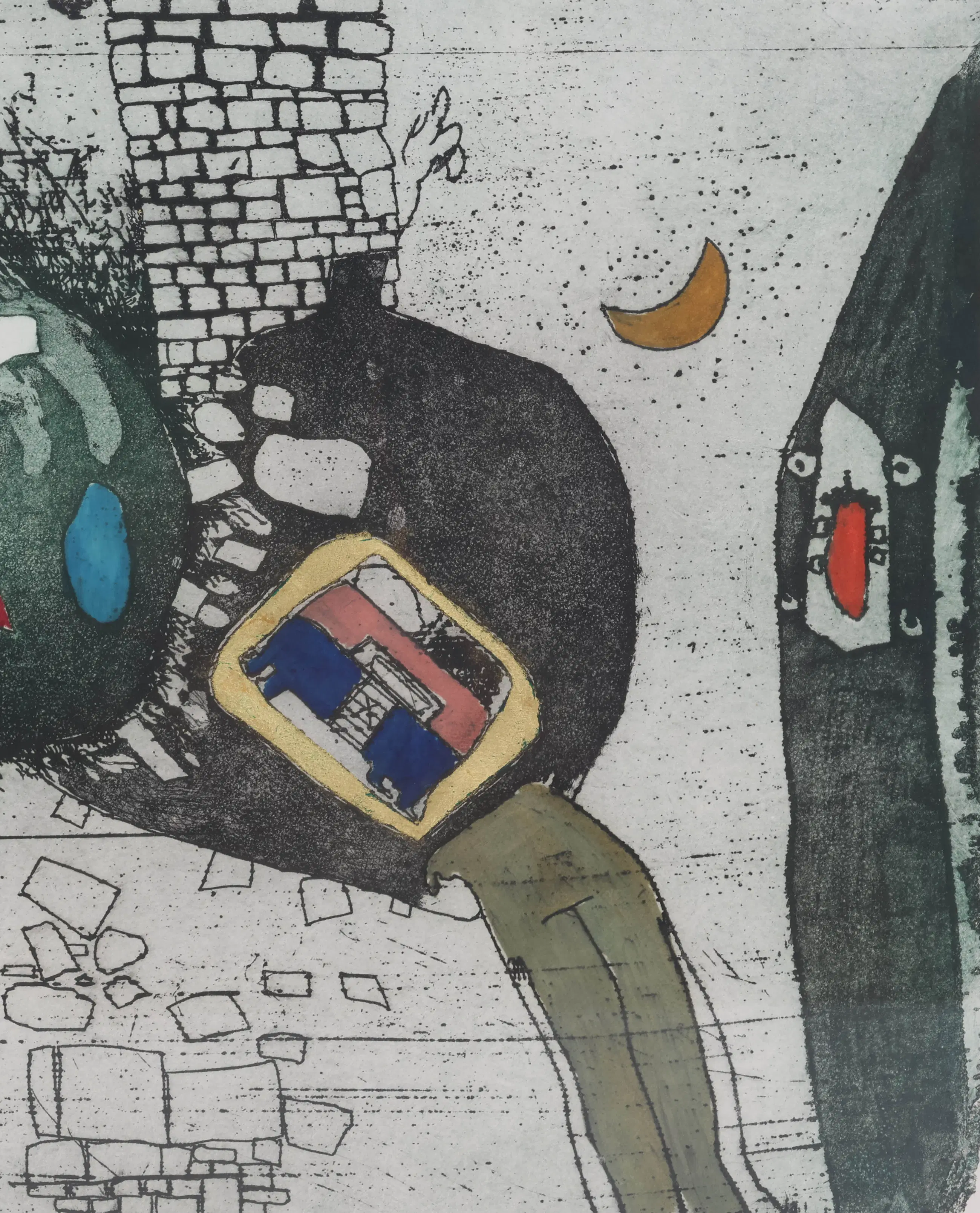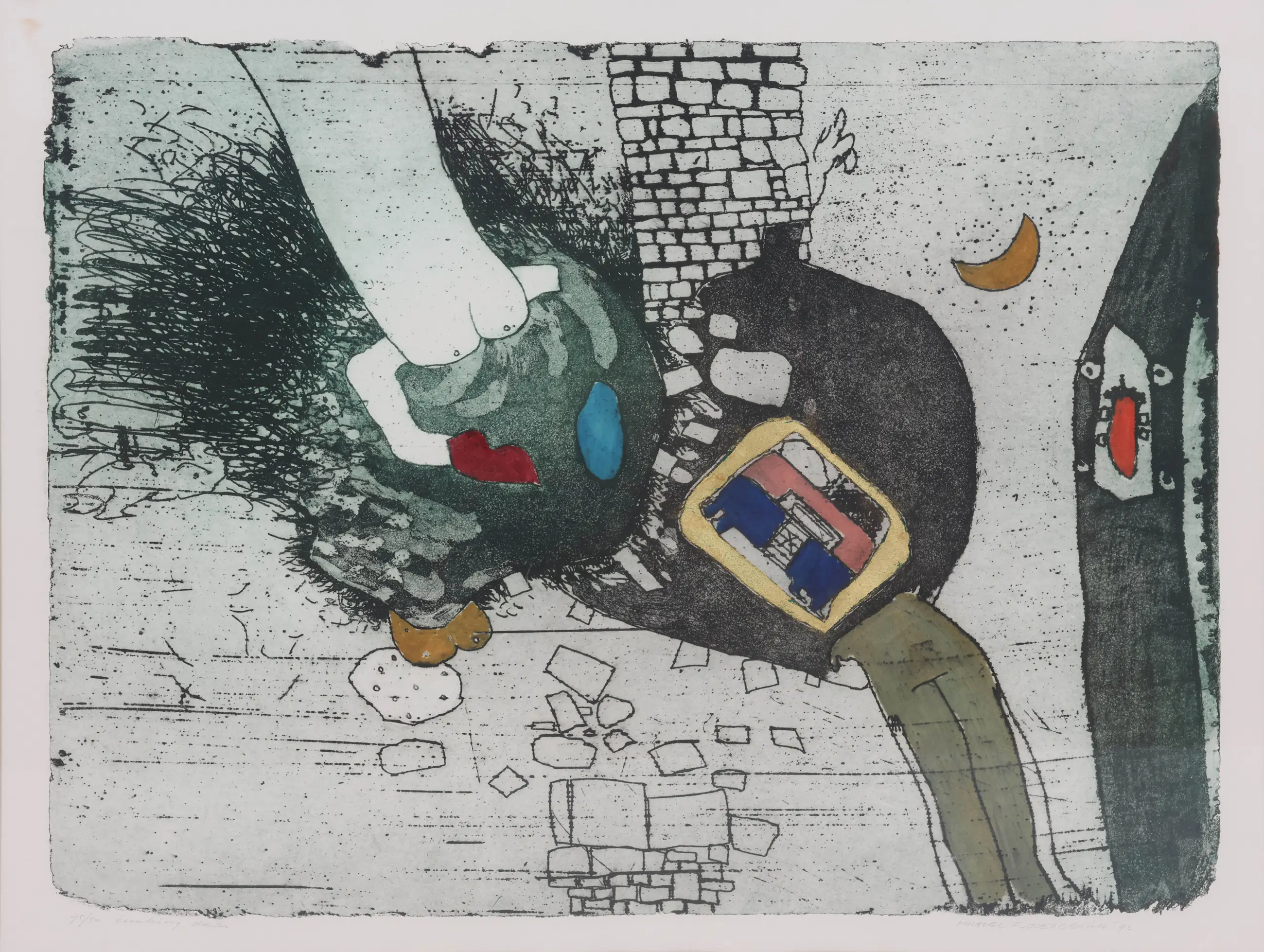 De prenten van Michel van Overbeeke kenmerken zich door een sterke grafische vormgeving en een gevoel voor lijn en compositie. Hij combineerde vaak abstracte en figuratieve elementen, waardoor zijn werk zowel dynamisch als verfijnd oogt. Zijn grafiek varieert van gedetailleerde etsen tot expressieve lithografieën, vaak met een speels gebruik van textuur en contrast, waardoor elke prent een eigen ritme en diepte krijgt.