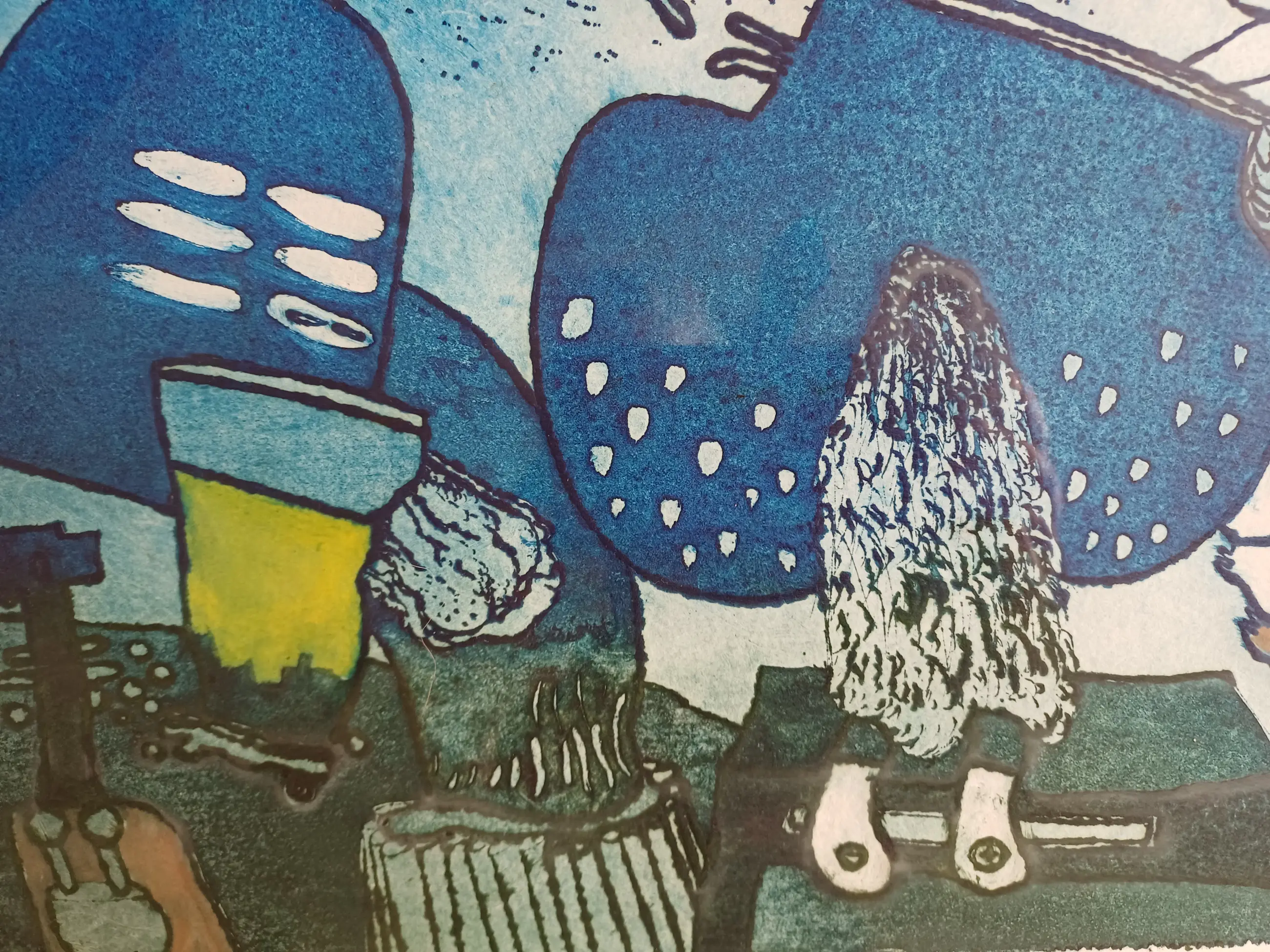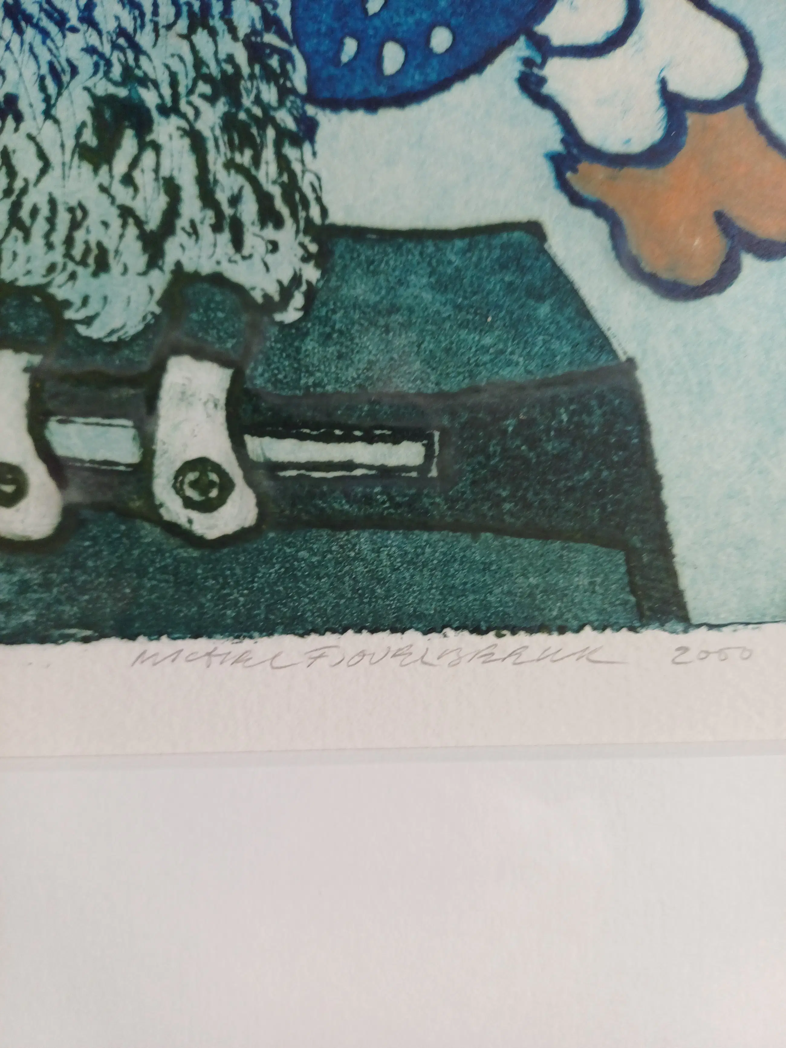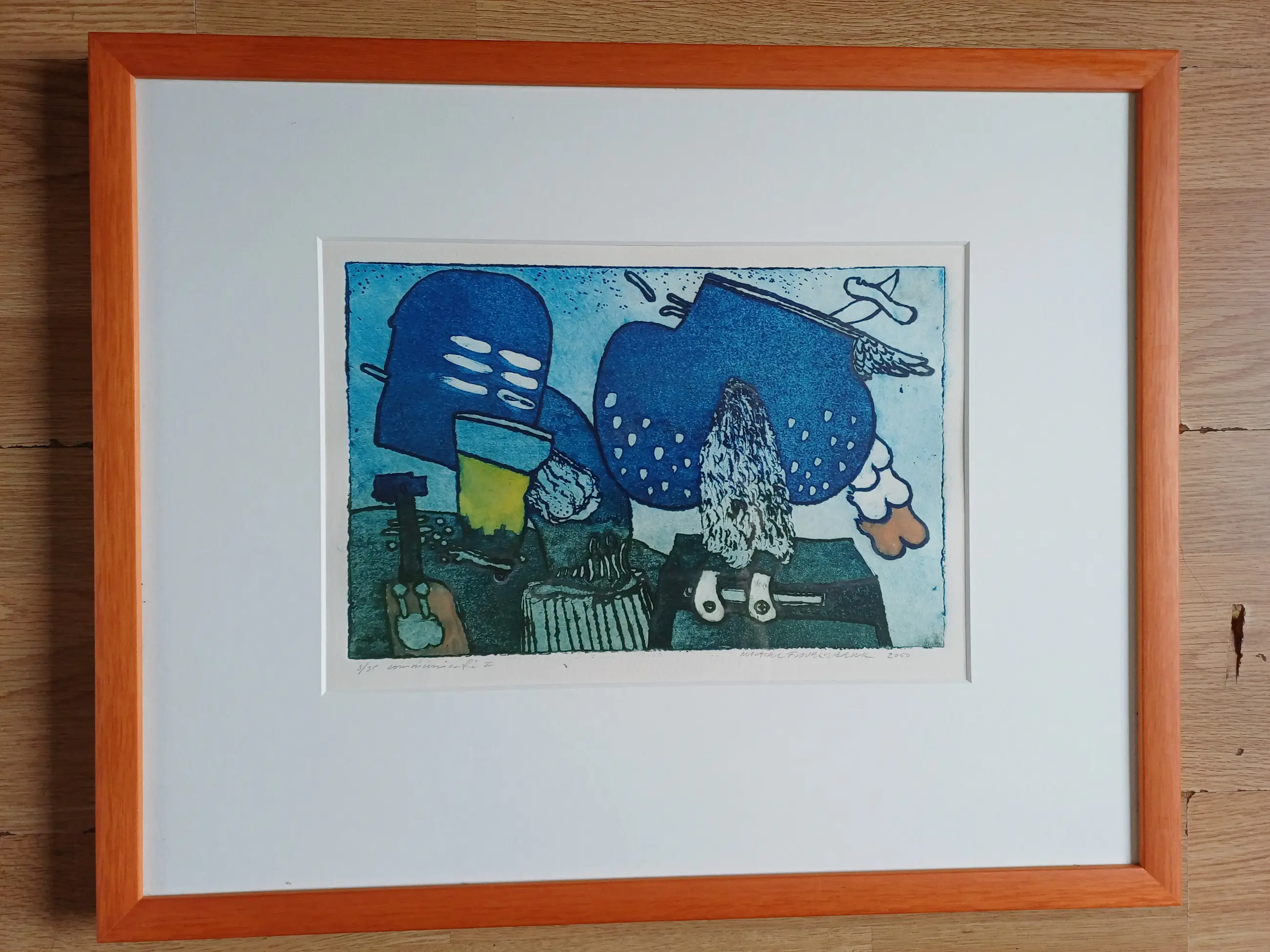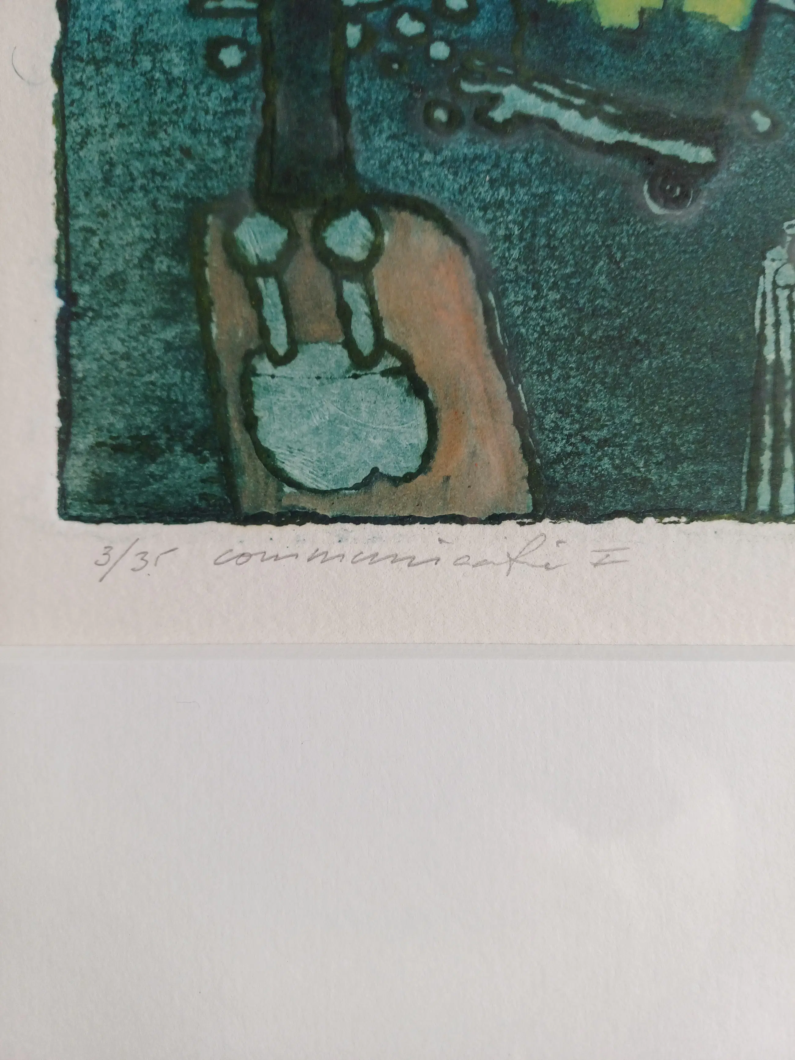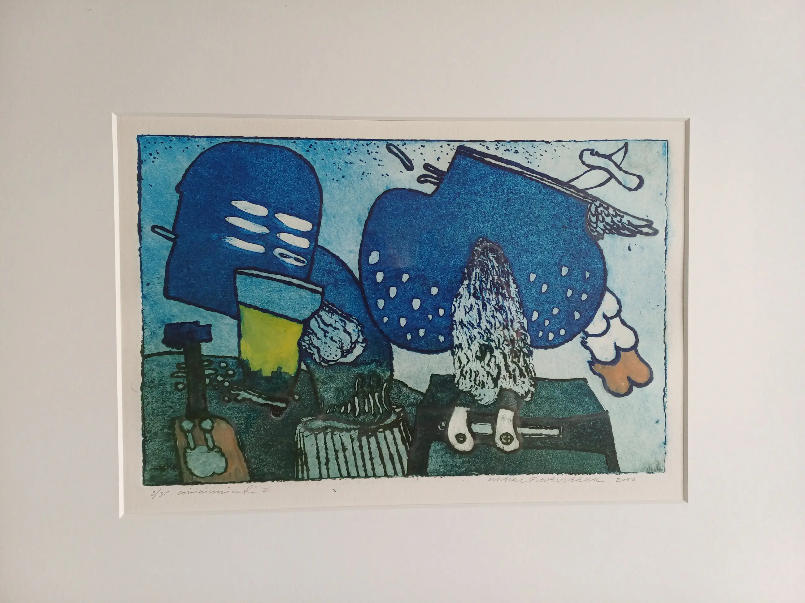 Dit werk van Michel van Overbeeke is gemaakt in het jaar 2000 in een oplage van 35 stuks waarvan dit nummer 3 is. Gesigneerd met potlood rechtsonder. De titel van het werk is Communicatie I. Ingelijst in passe-partout achter glas.