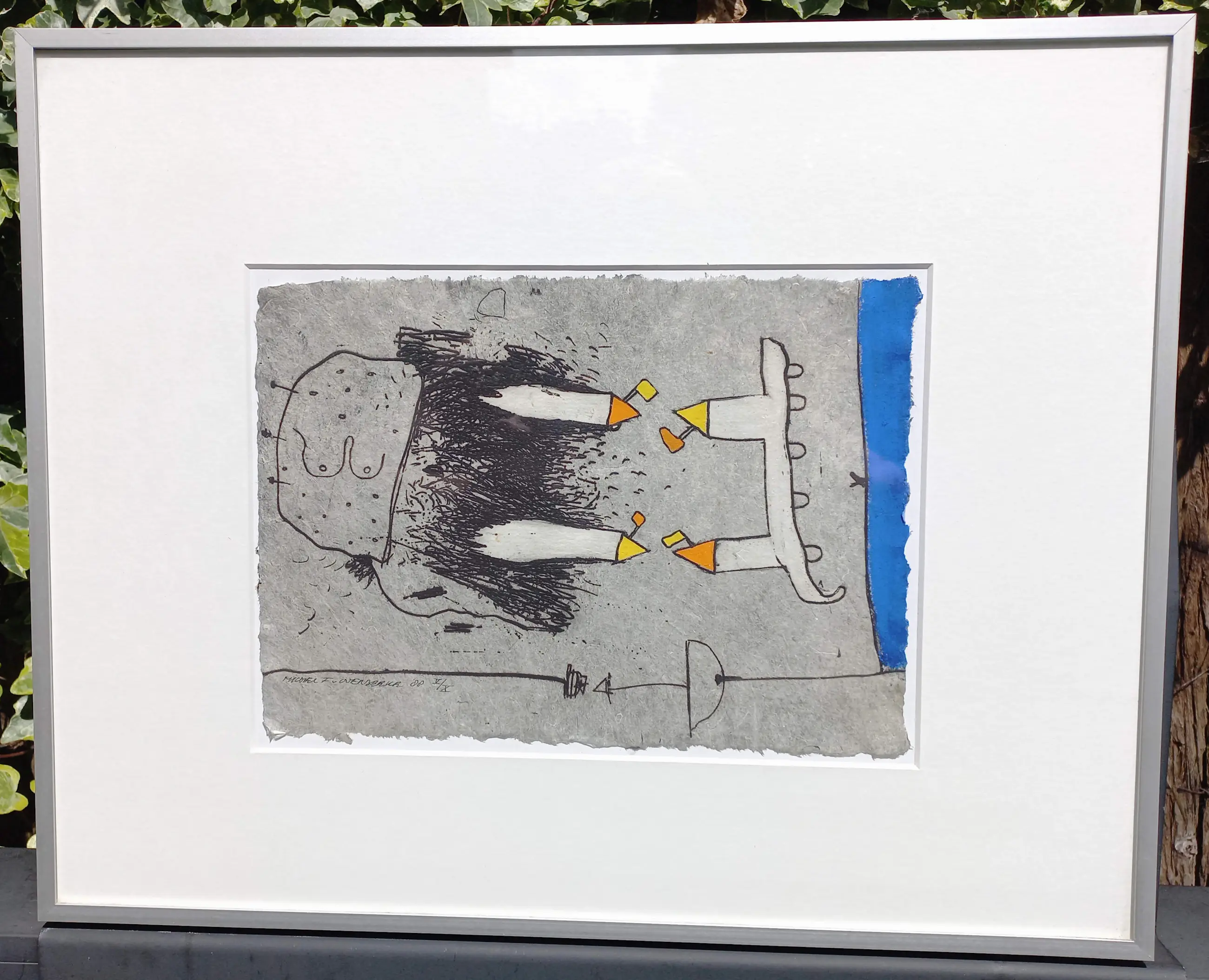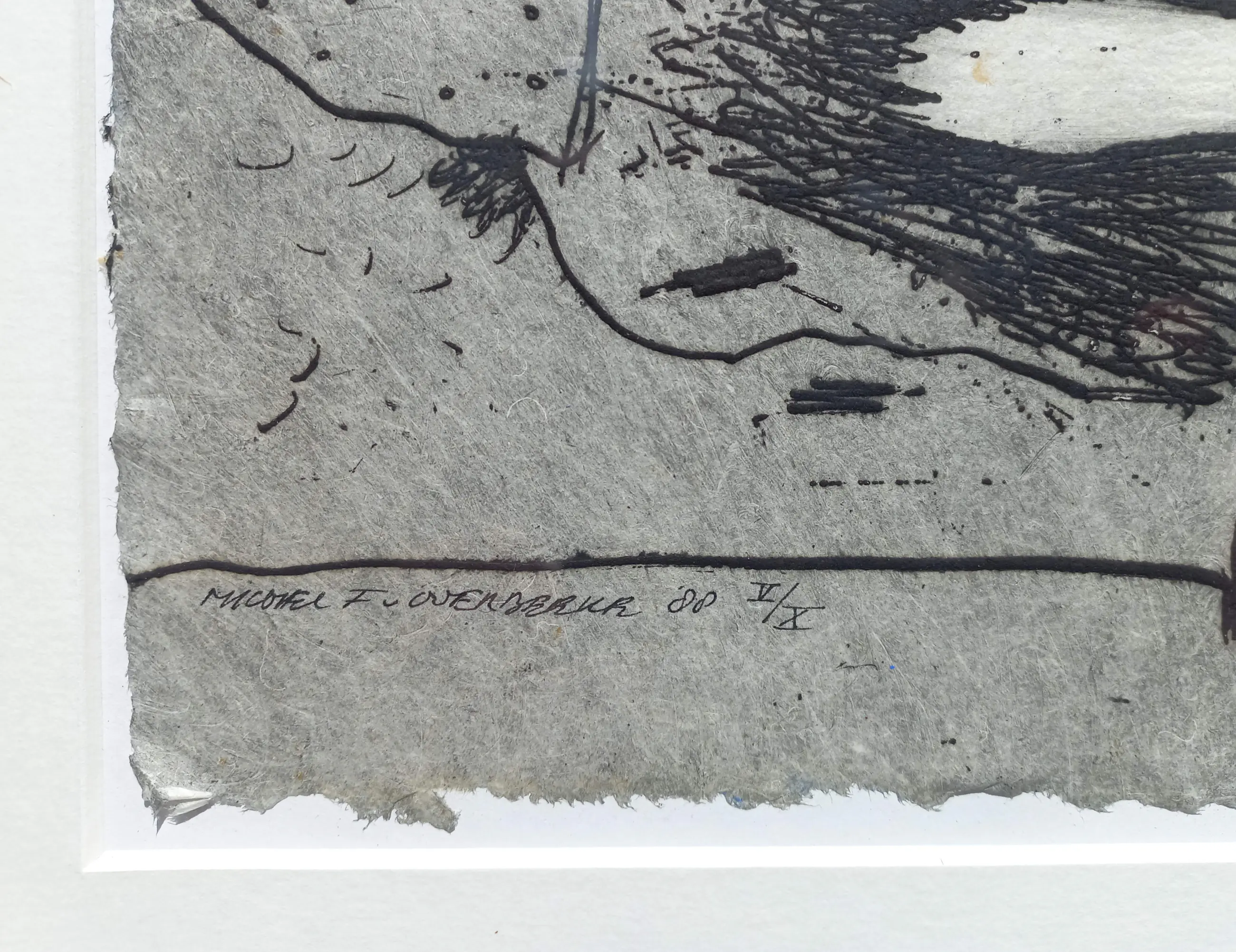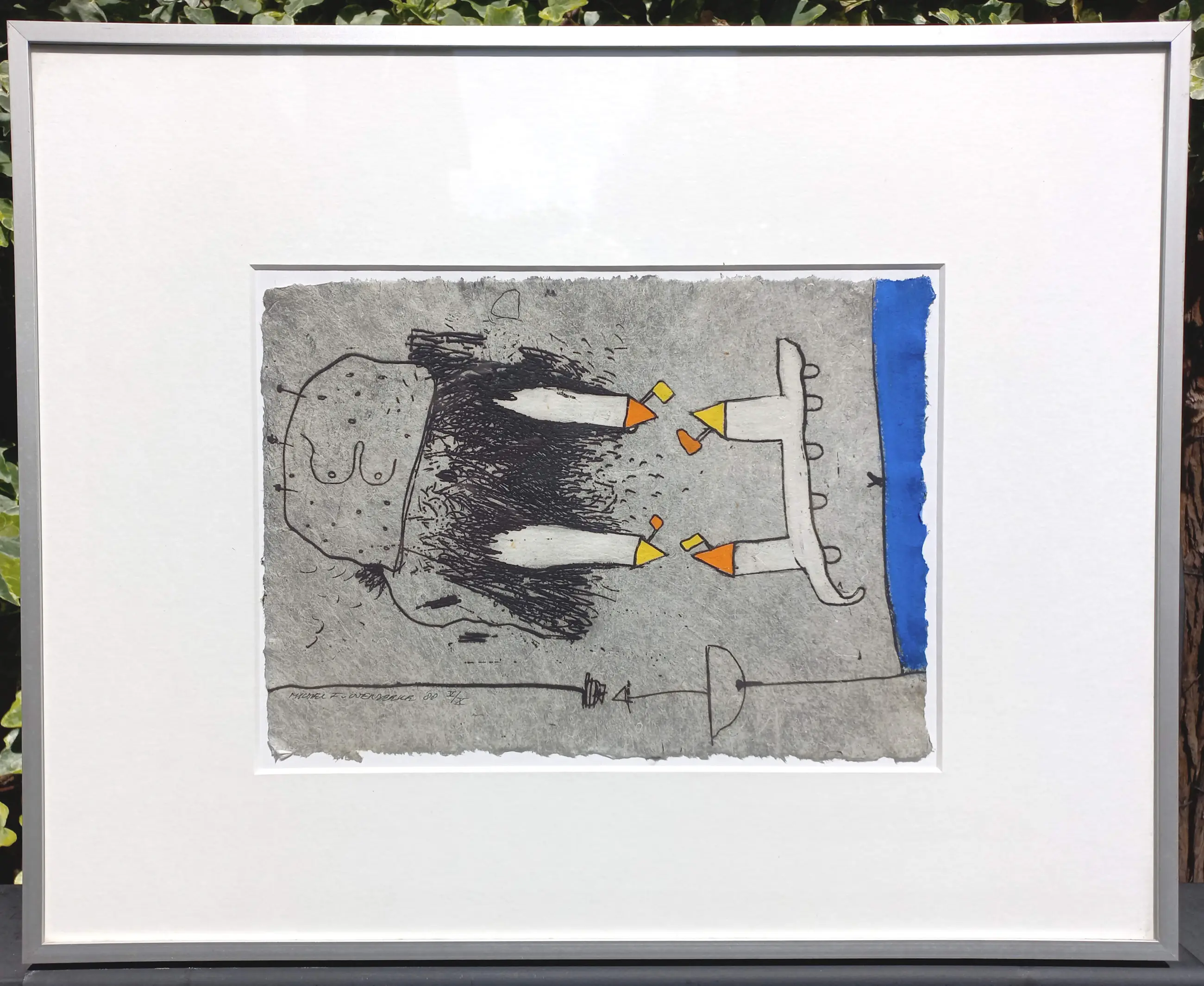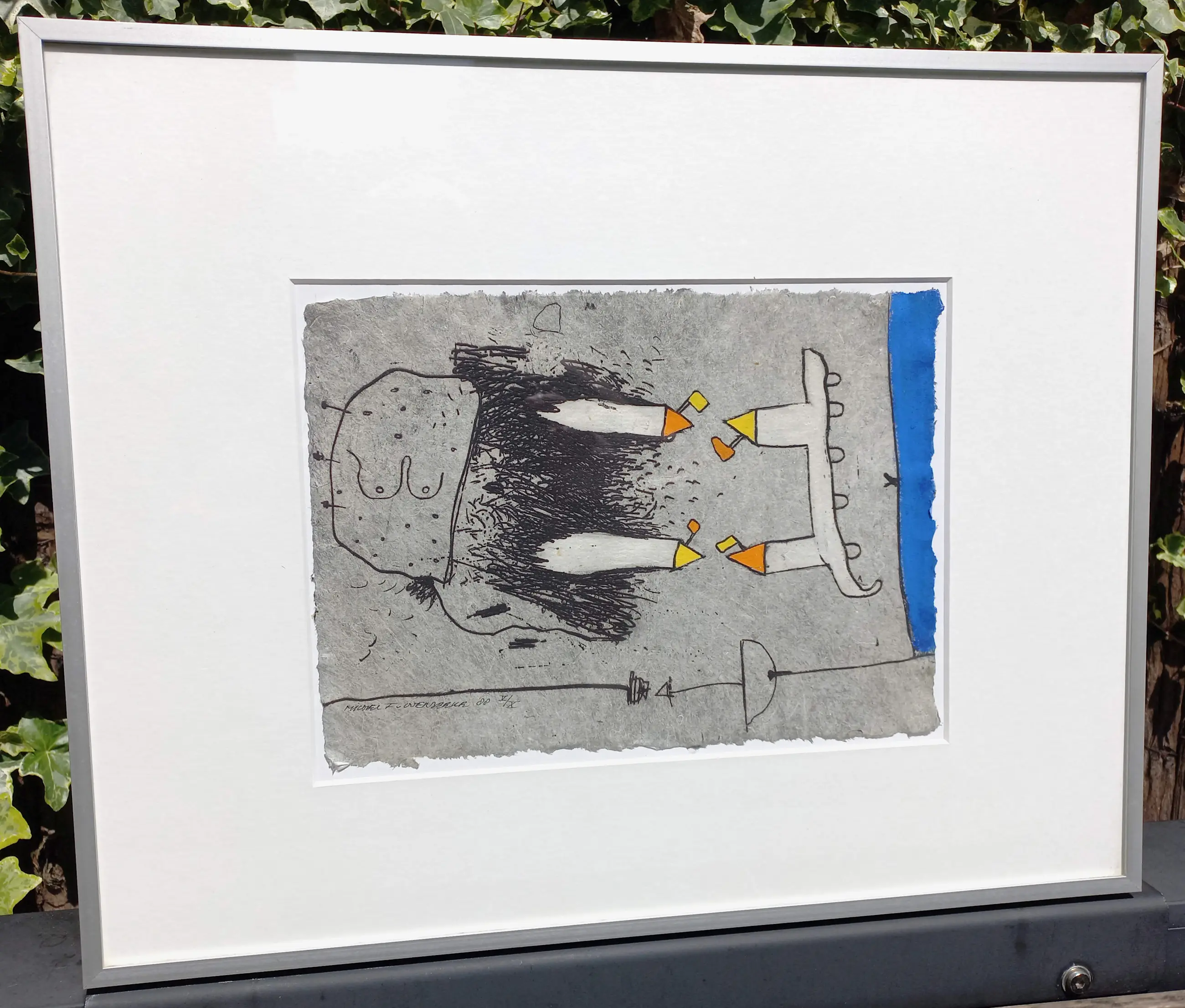 Mooie, herkenbare ets van Michel van Overbeeke. Met de hand ingekleurde aquatint ets op geschept papier, met inkt gesigneerd, gedateerd (‘88) en genummerd (V/X = 5/10). Het volledige blad in strakke aluminium lijst, achter glas en met smetteloos, zuurvrij passe-partout. Alles in zeer goede conditie.
