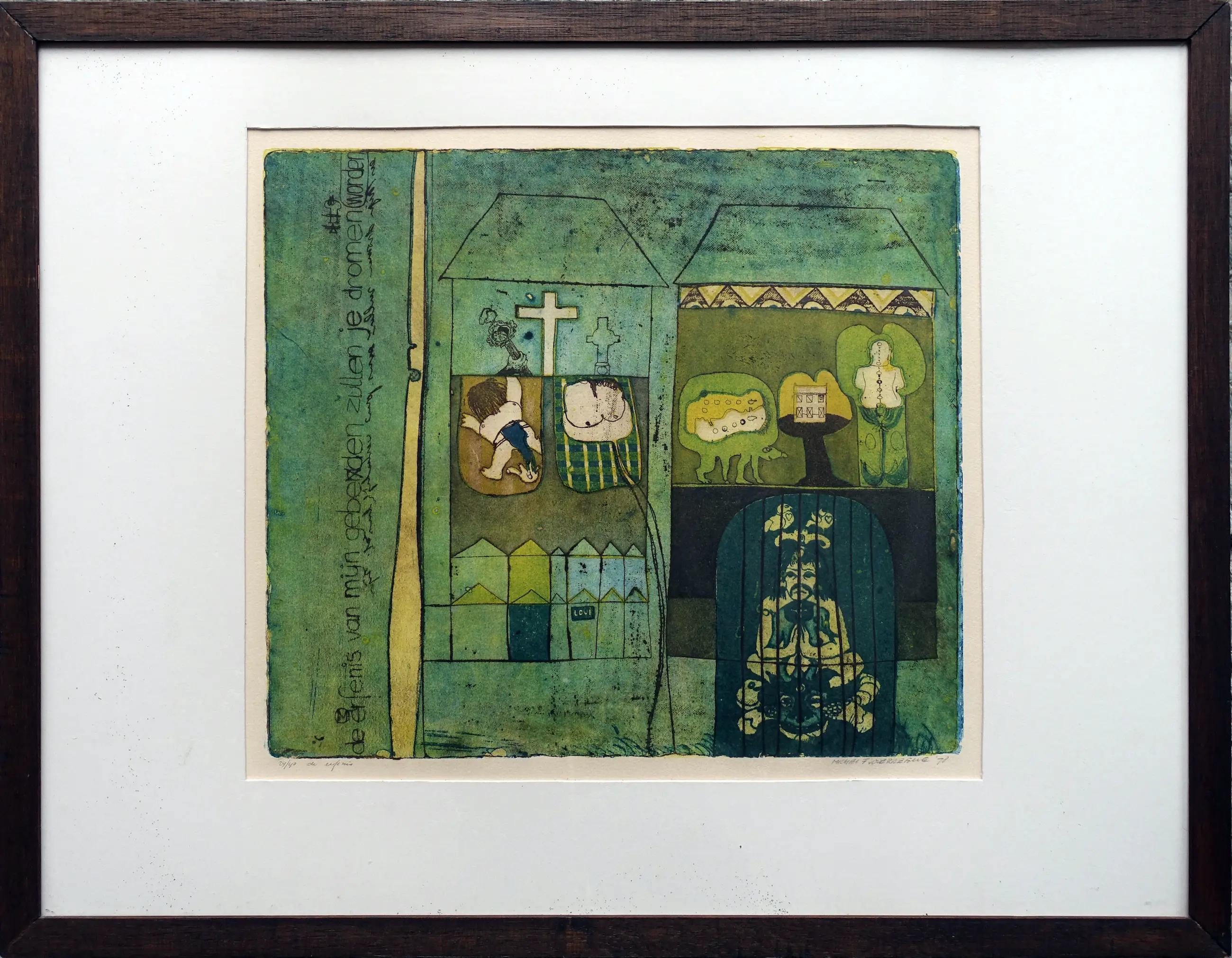 De prent ziet er goed uit, maar is niet uit de lijst geweest voor een beoordeling. De achterwand van de lijst en het passe-partout zijn beschadigd door papiervisjes-vraat.