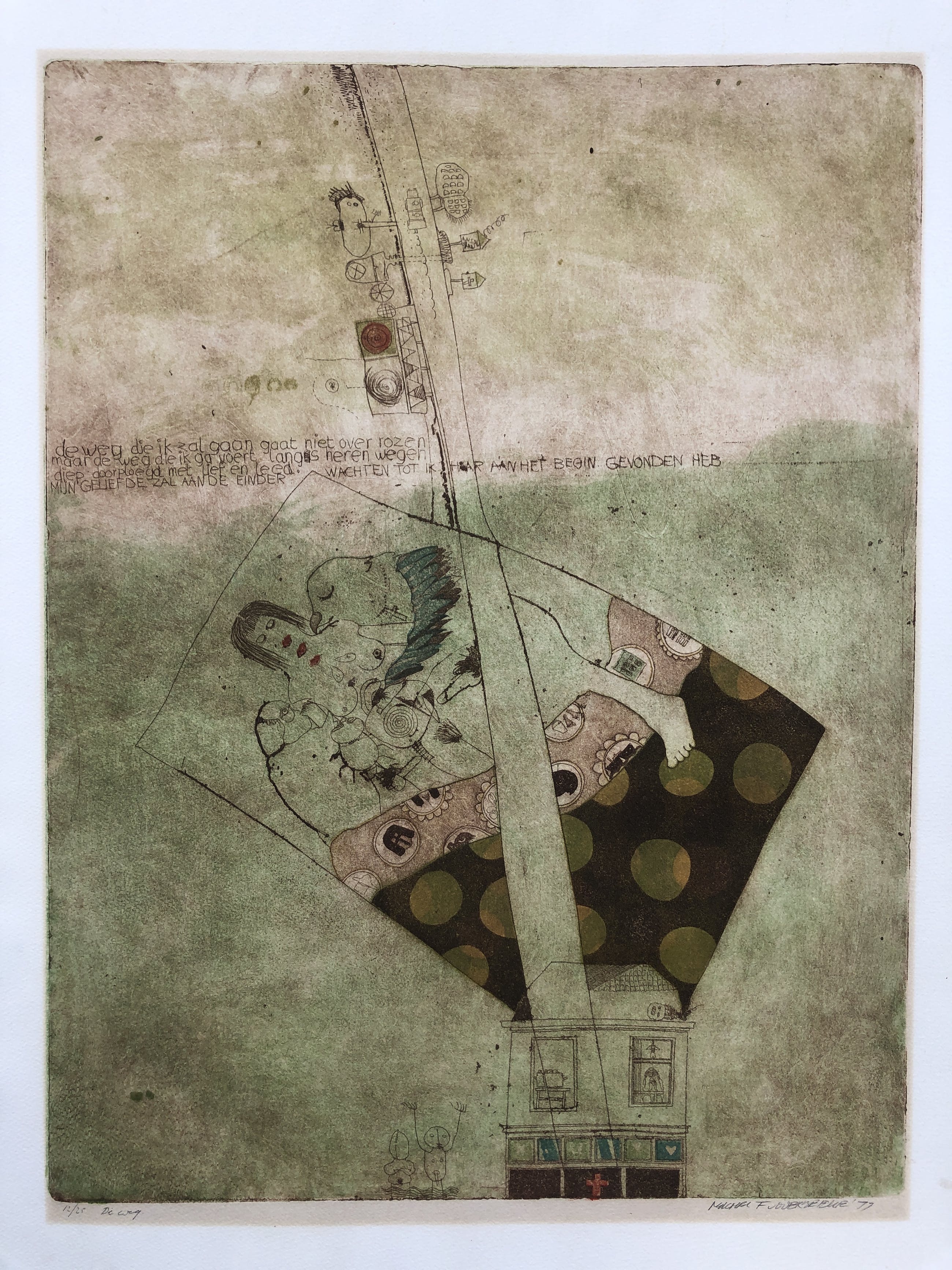 Vroeg werk van Michel F. Overbeeke uit 1977. Het werk heeft onder passe partout gezeten en is egaal wat verkluerd in de zon. Bij gebruik van een nieuw passe partout is dit verschil goed te camoufleren. U kunt het werk vooraf komen beoordelen bij galerie Rotot in Gorcum of na aankoop afhalen of toegezonden krijgen.
