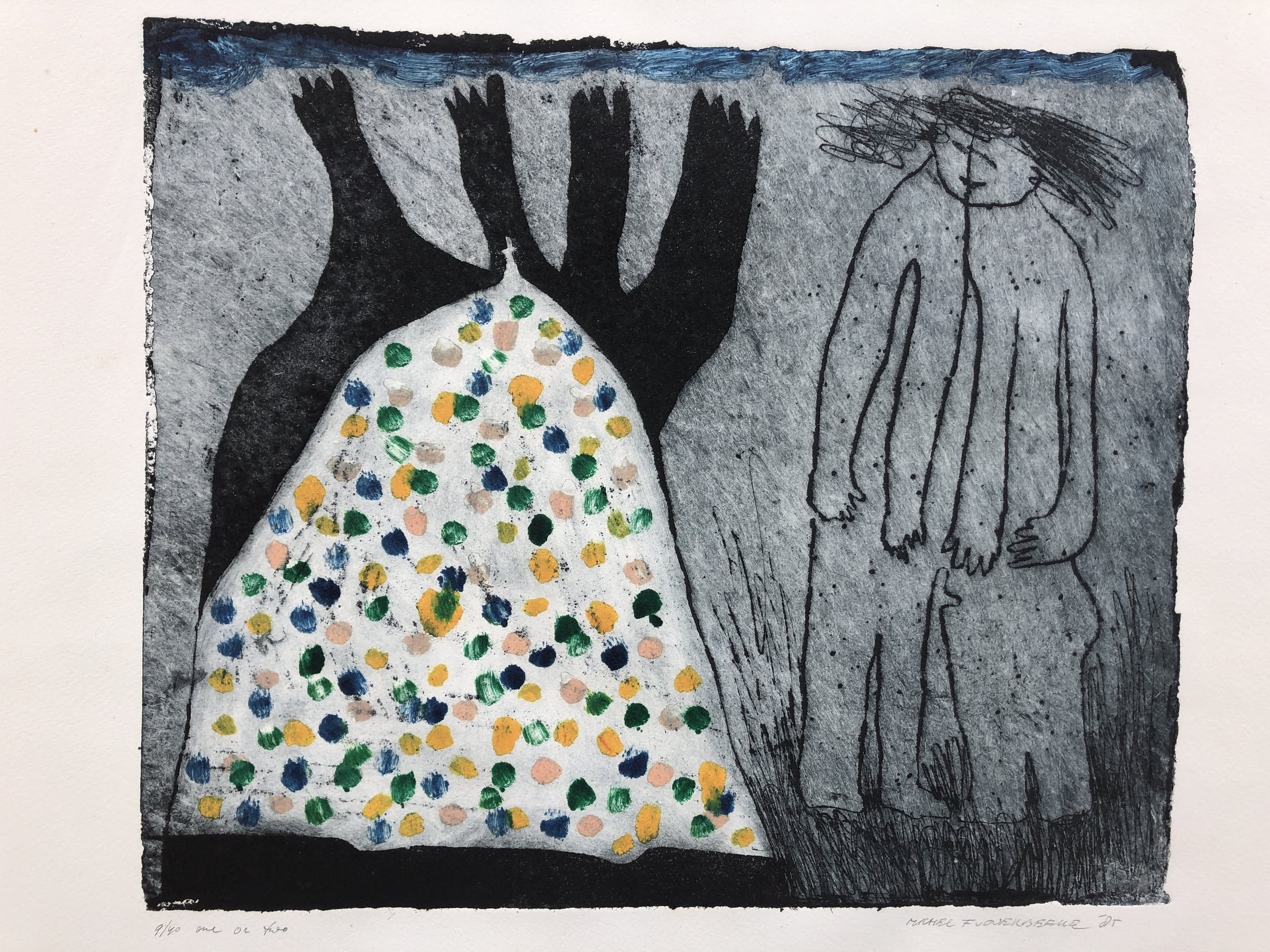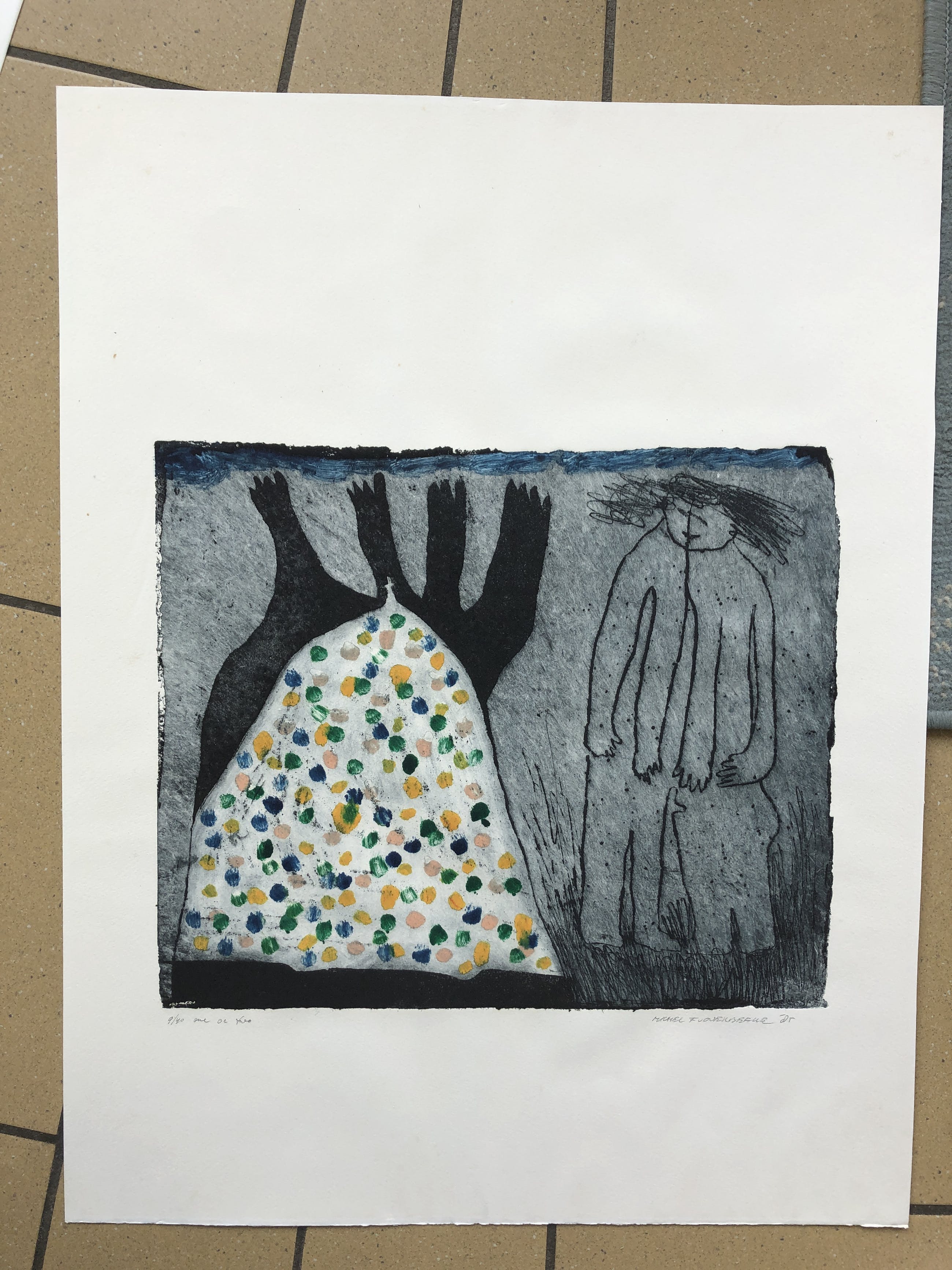 Vroeg werk van Michel F. Overbeeke uit 1985. Het werk heeft links in het wit twee kleine vlekjes.. Bij gebruik van een nieuw passe partout is dit goed te camoufleren. U kunt het werk vooraf komen beoordelen bij galerie Rotot in Gorcum of na aankoop afhalen of toegezonden krijgen.