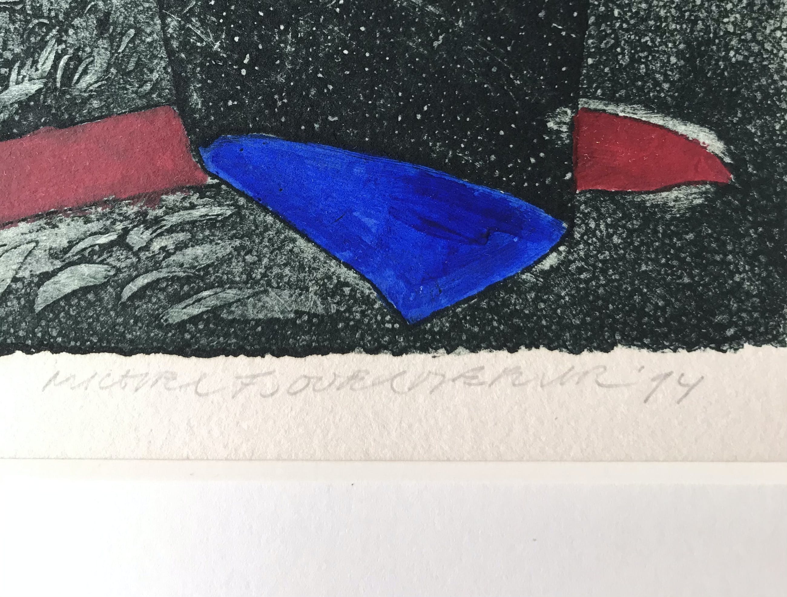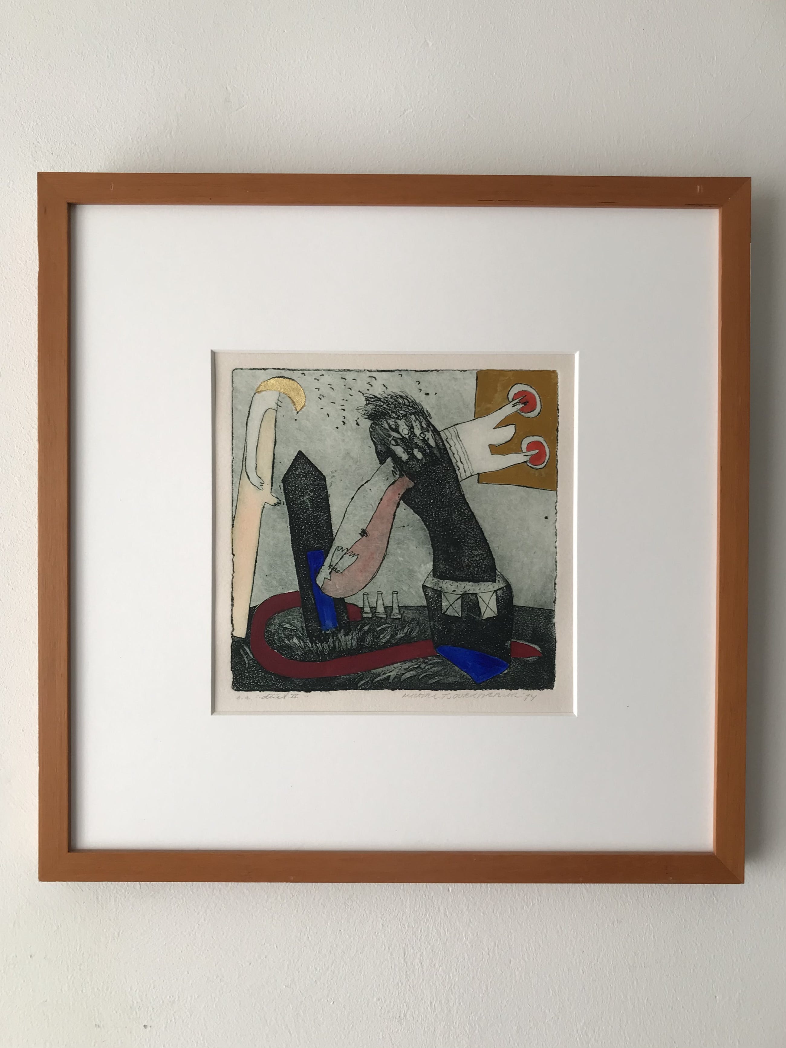 Kleurets met detail in bladgoud. Het blad meet 40 x 40 cm. De afbeelding is 20 x 20 cm. groot. Gesigneerd en getiteld in potlood, ongenummerd met vermelding e.a. (épreuve d’artiste). In een beuken lijst.