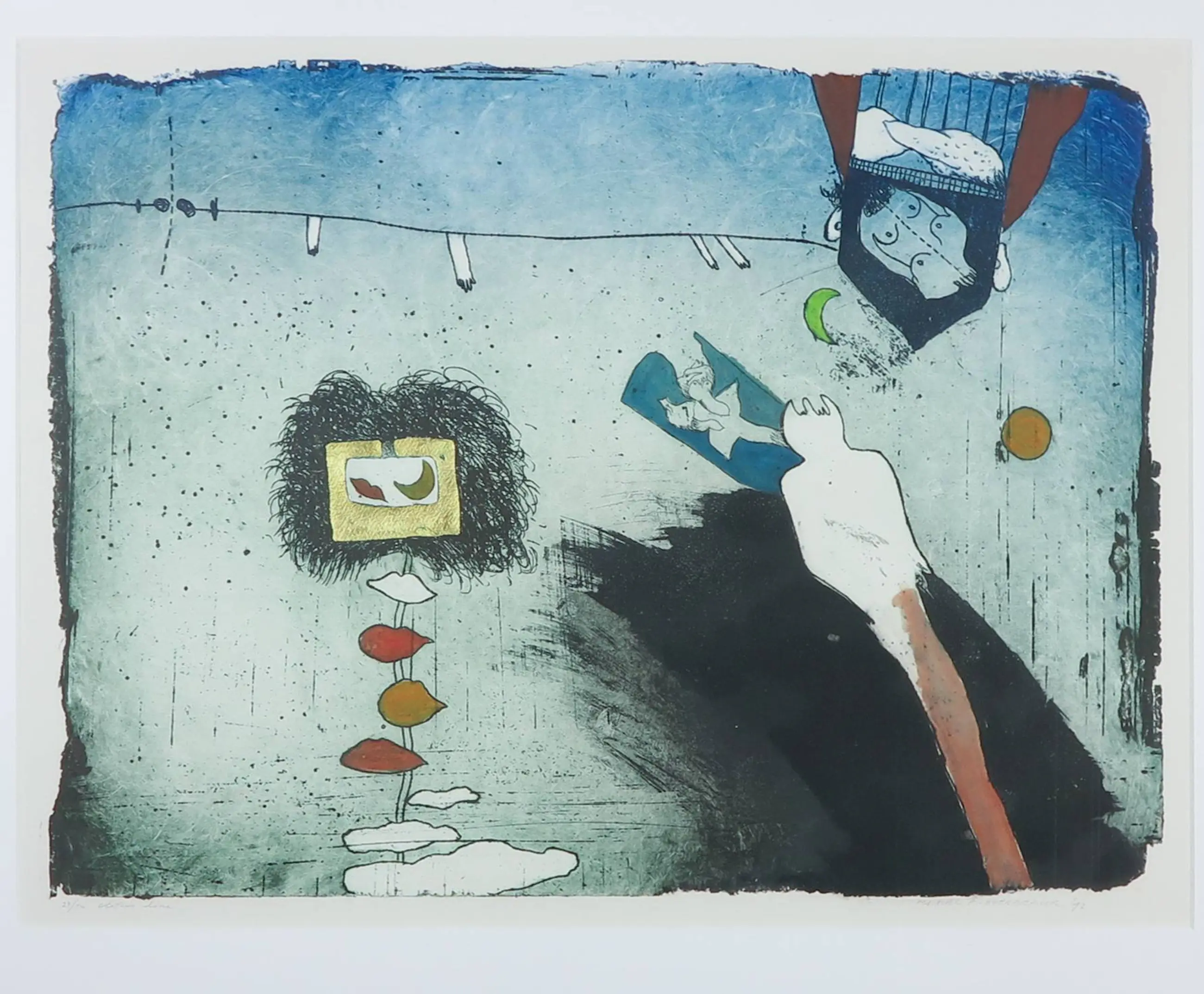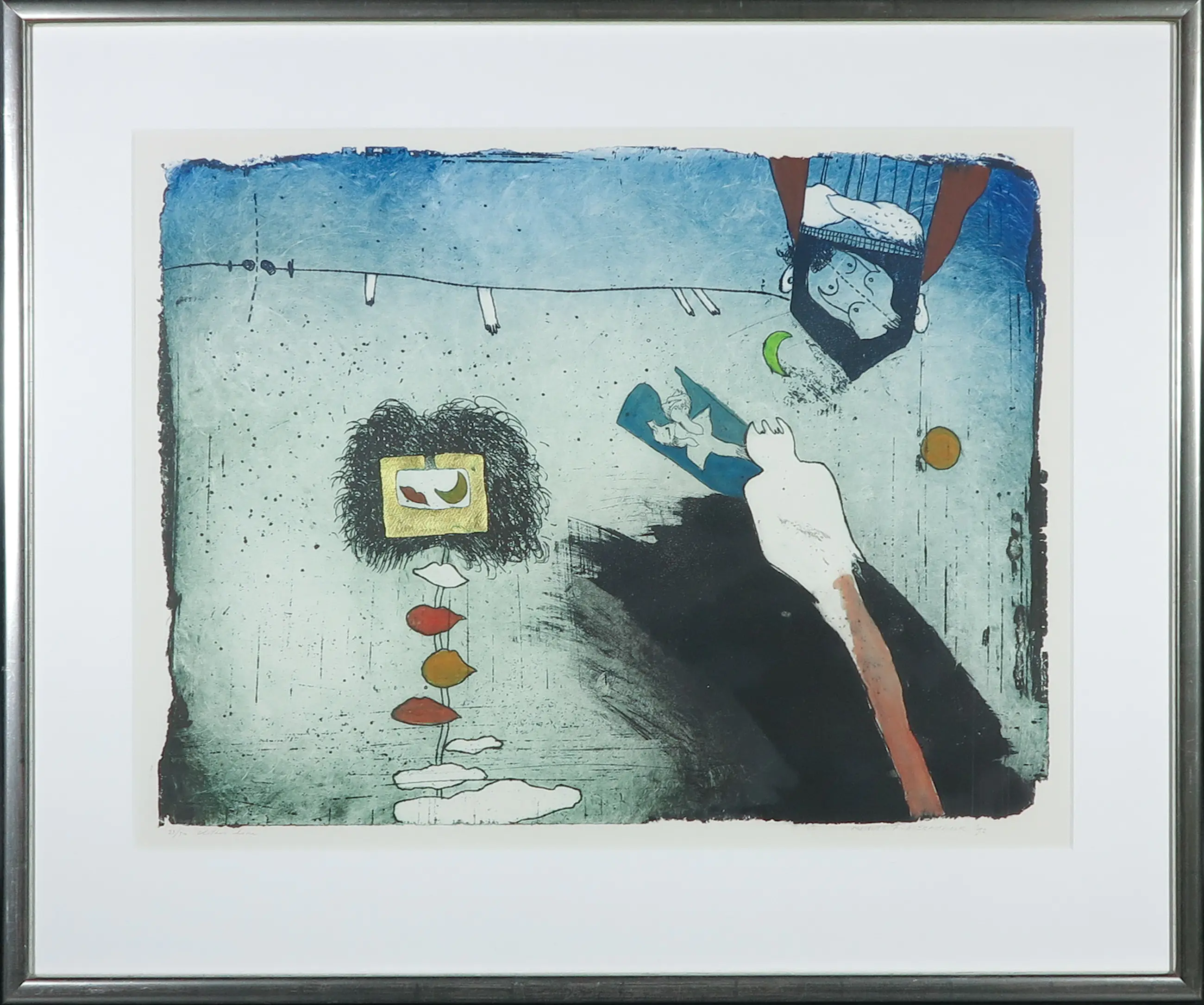 Grote ingelijste ets/aquatint, bewerkt met bladgoud van Michel van Overbeeke.