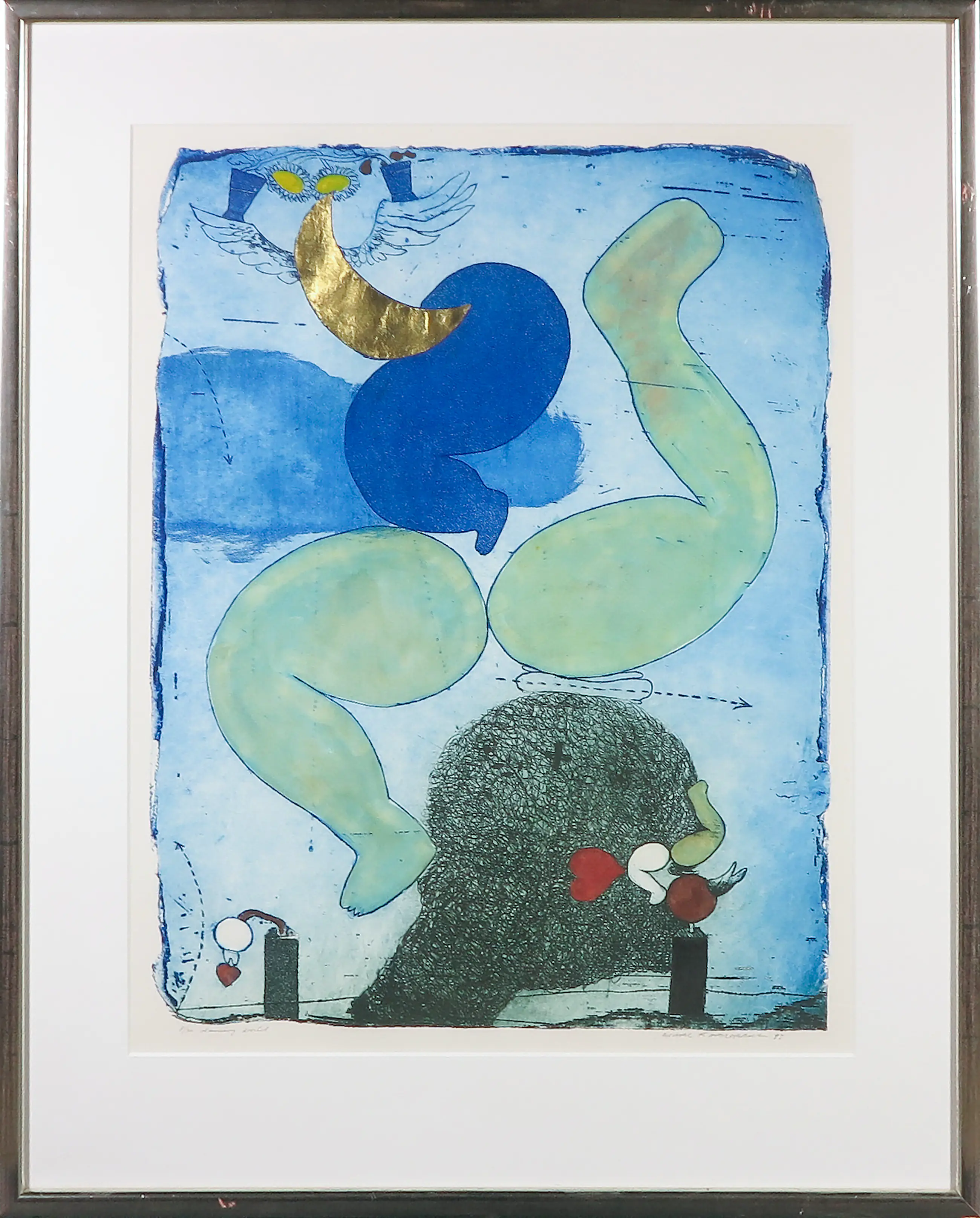 Grote ingelijste ets/aquatint, bewerkt met bladgoud van Michel van Overbeeke.