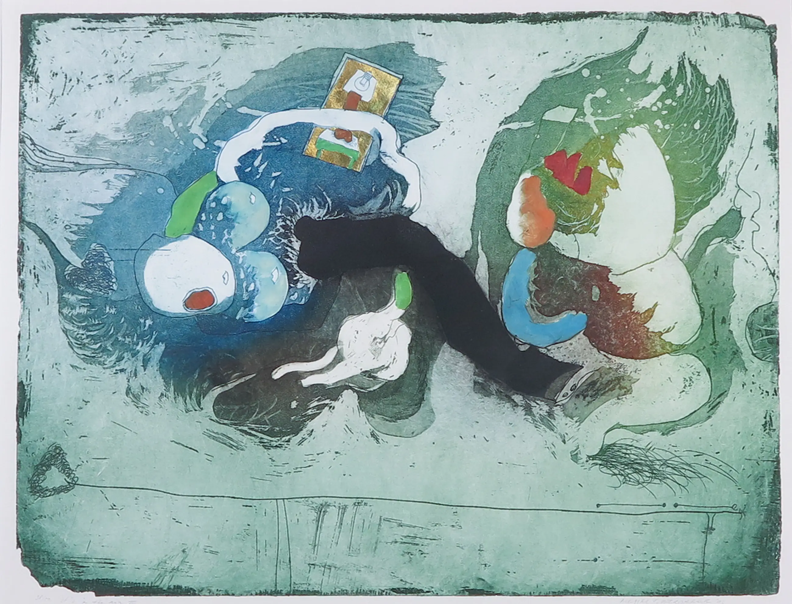 Grote ingelijste ets/aquatint, bewerkt met bladgoud van Michel van Overbeeke.