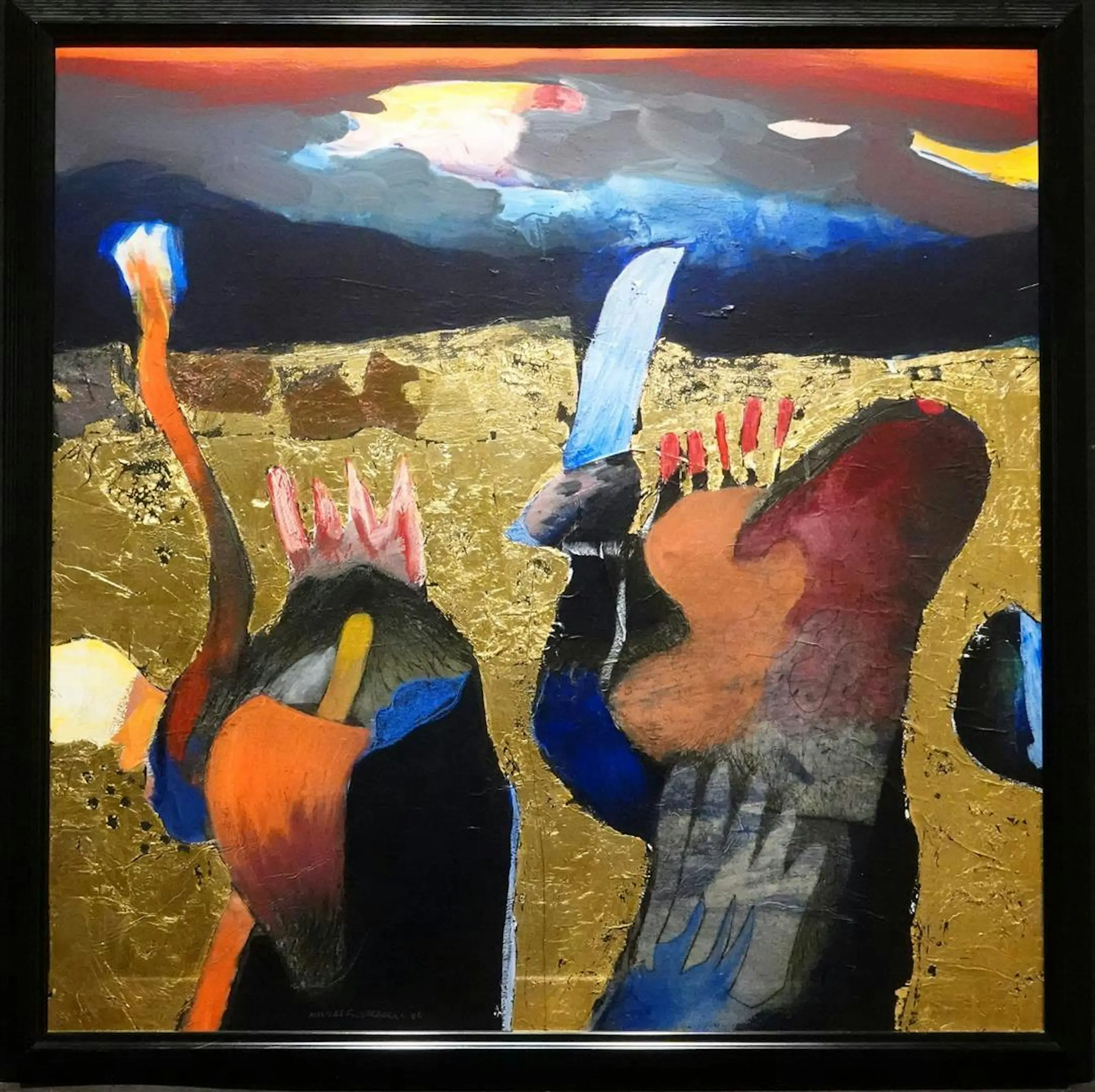 Olieverf en bladgoud op doek van Michel Overbeeke. Jaar: 1996. Het werk is linksonder, in het zwarte gedeelte, gesigneerd en gedateerd door de kunstenaar. Afmetingen werk: H100 x b100 cm. Afmetingen incl. lijst: H110 x b110 cm. De authenticiteit van dit werk wordt volledig gegarandeerd. Een certificaat van echtheid kan, op aanvraag, worden gemaild.