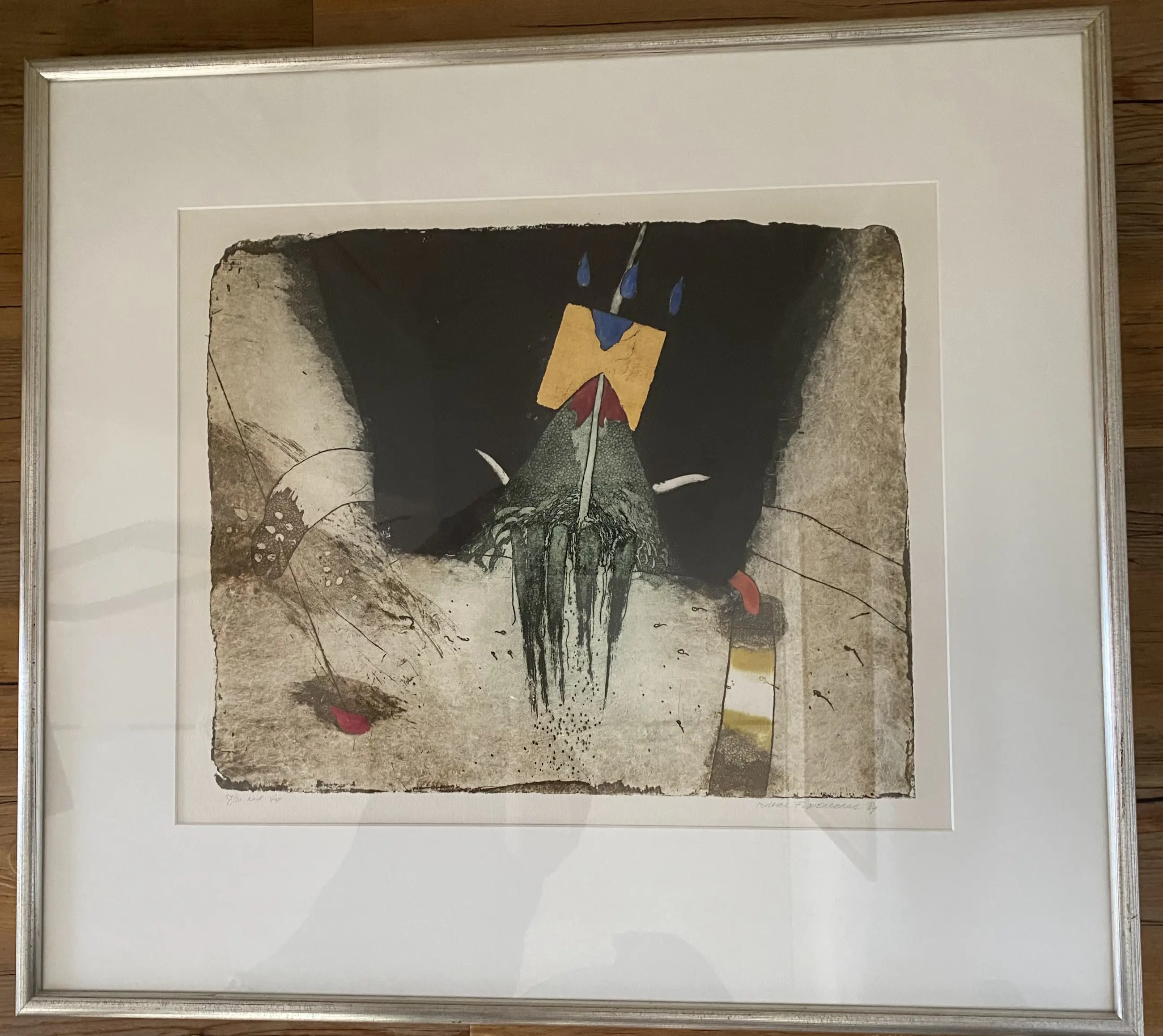 Originele ets met goud opdruk in fraaie zilverkleurige lijst.