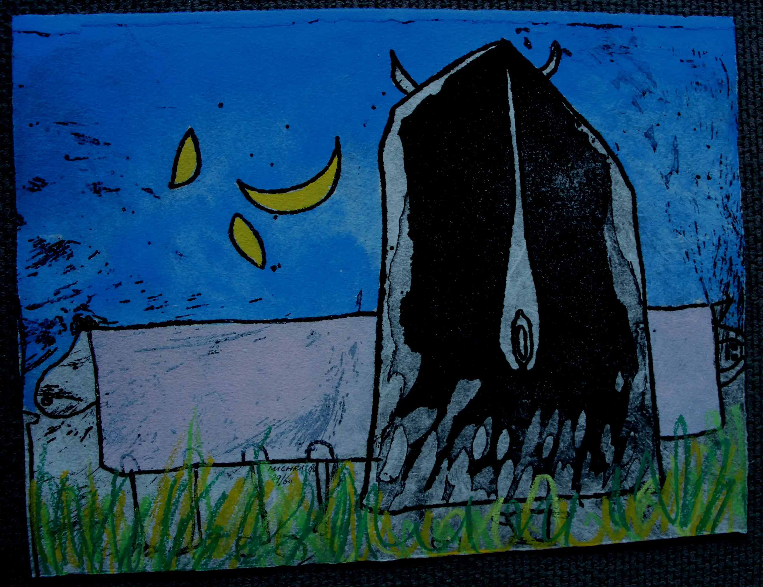 Met de hand bewerkte ets (vetkrijt/aquarel) van Michel van Overbeeke. Jaar: 1988. Oplage: 29/60. Afmetingen blad: H23 x b31m. Het werk is midden onderaan, gesigneerd door de kunstenaar. De authenticiteit van het aangeboden werk wordt volledig gegarandeerd. Een certificaat van echtheid kan, op aanvraag, worden gemaild.