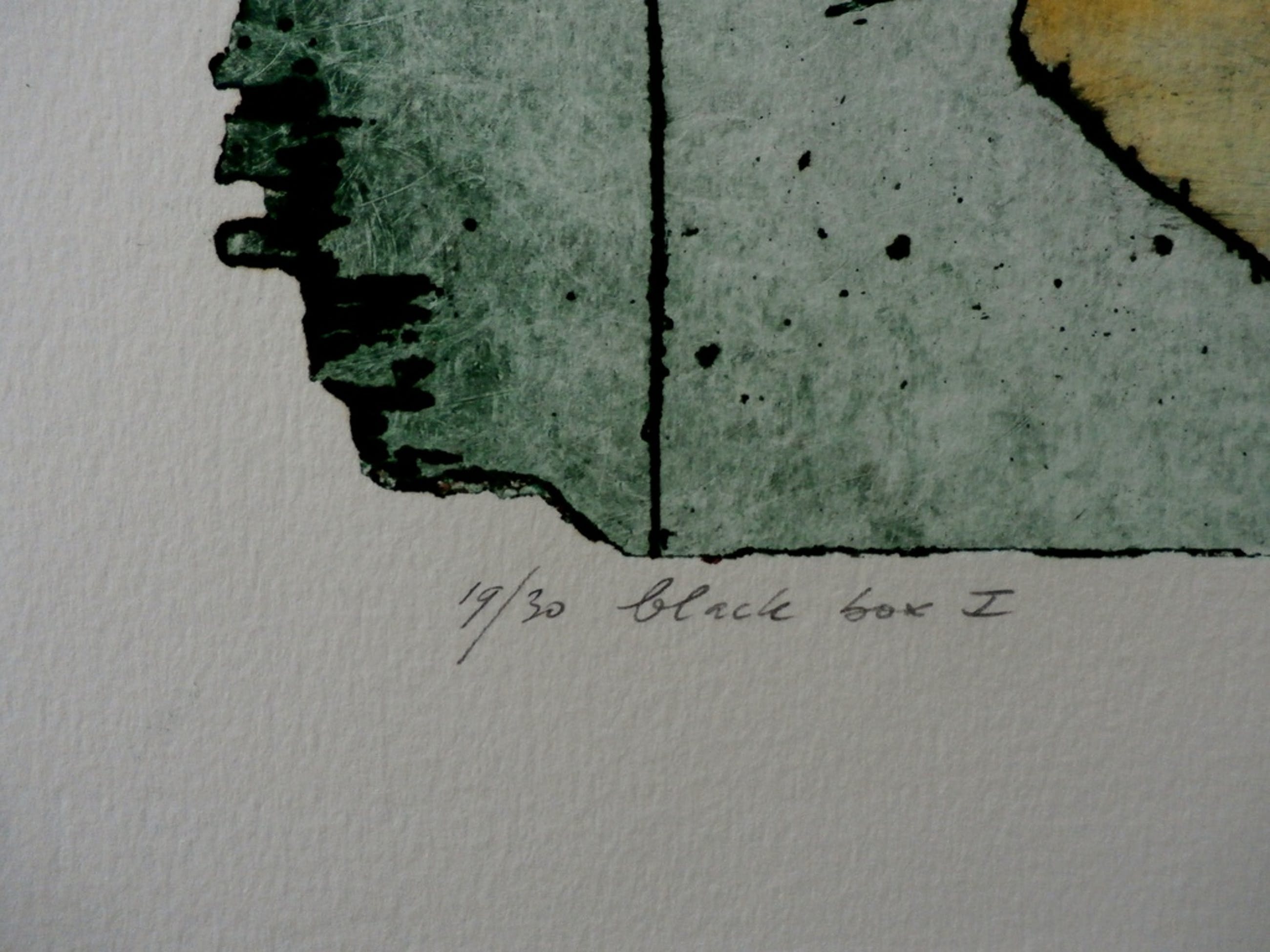 Ets van Michel van Overbeeke uit 1990. Titel: Black box I. Nummer: 19/30. Afmetingen blad: H48 x b57,5 cm. Afmetingen ets: H39 x b49 cm . Herkomst: collectie ABN AMRO. In het midden van de ets is bladgoud gebruikt. De authenticiteit van het, aangeboden, werk wordt voor 100% gegarandeerd. Een certificaat van echtheid kan, op aanvraag, worden meegestuurd.
