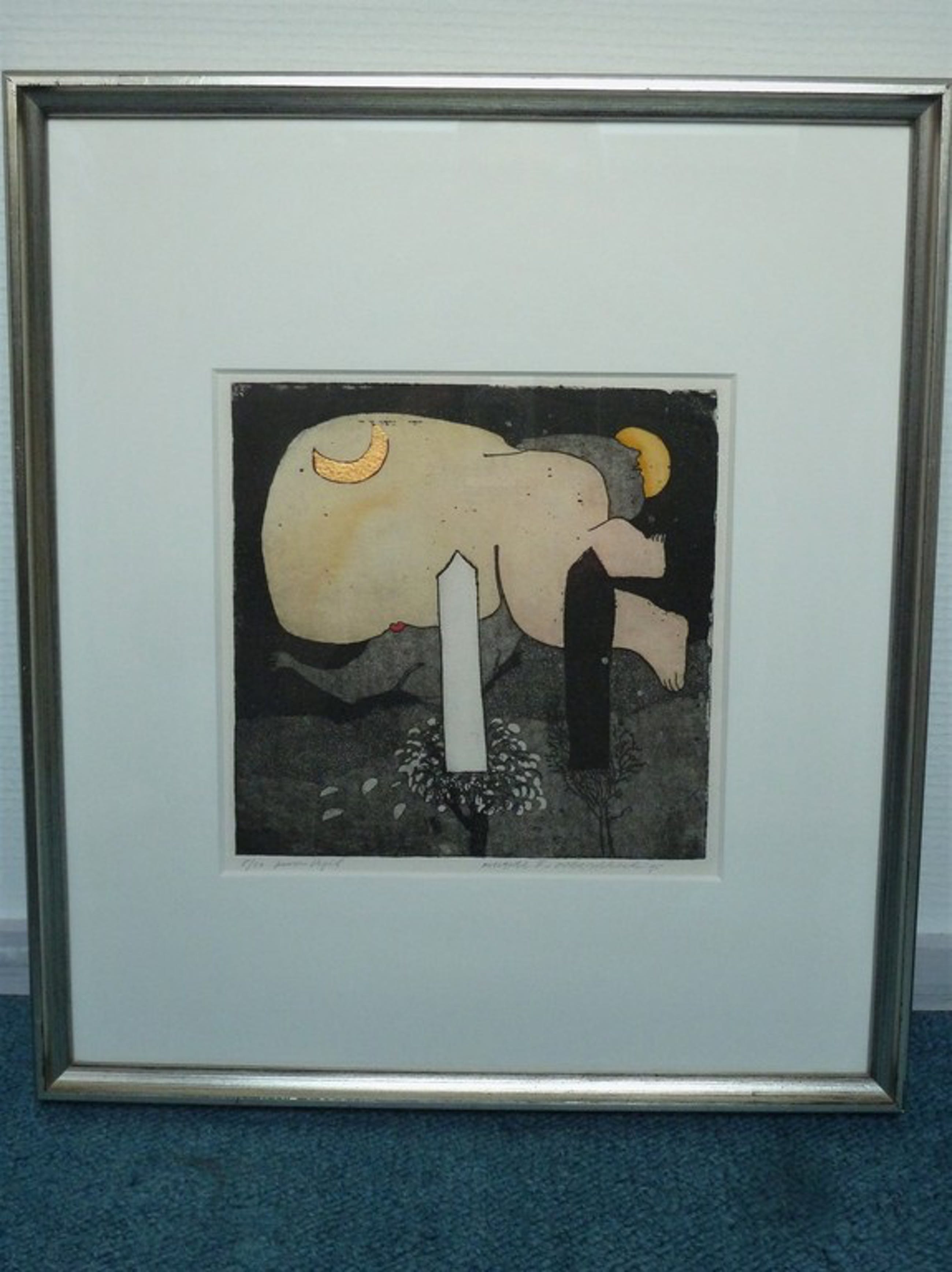 Ingekleurde ets met bladgoud. Totaalafmetingen incl. lijst 43x38cm. Beeld :21x21cm. Oplage 5/50. Werk verkeert in een prima conditie. Is deskundig ingelijst en kan zo aan de muur.