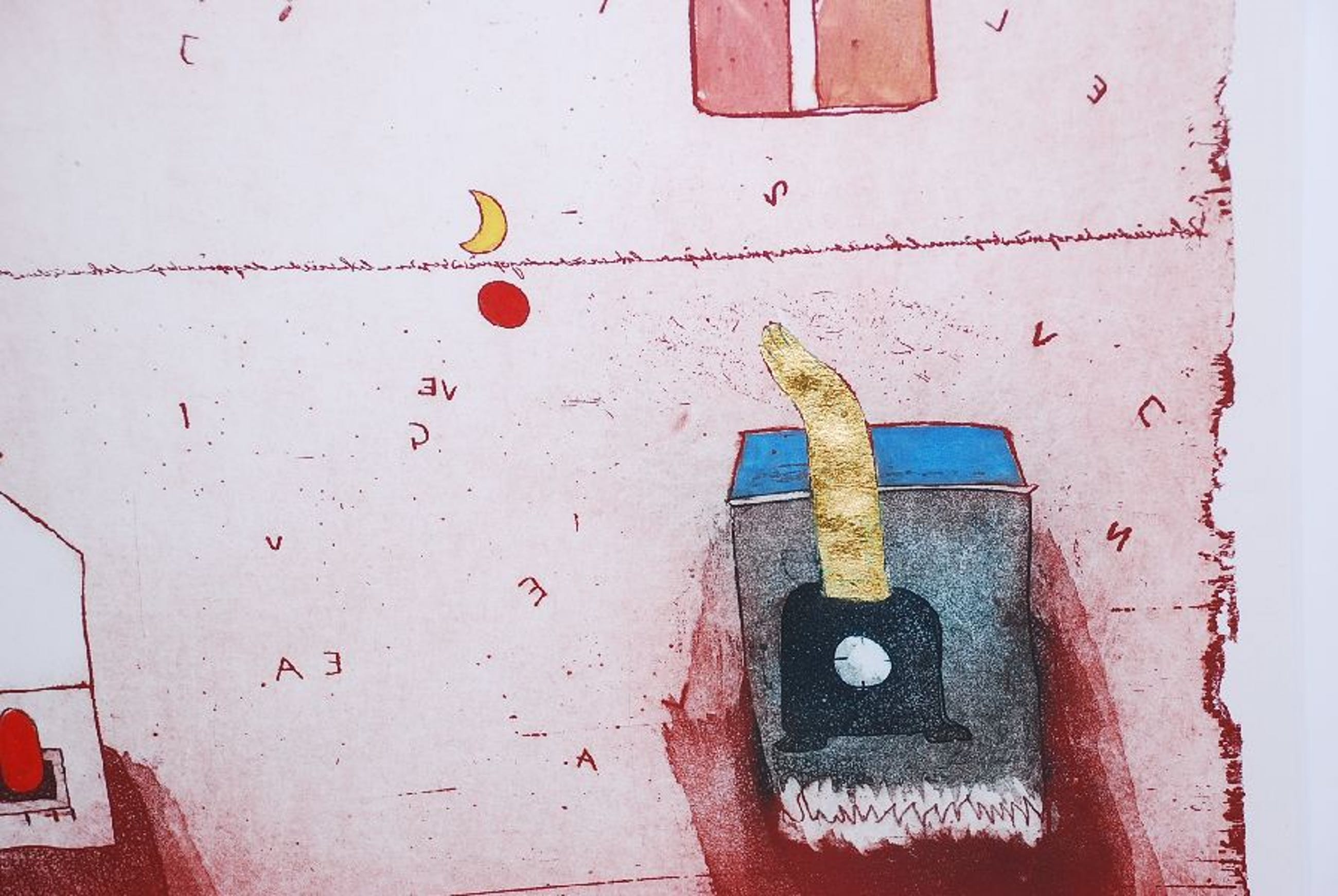 Mooi groot werk van Michel van Overbeeke. Mooie kleurenets met bladgoud details. Kan direct aan de muur.