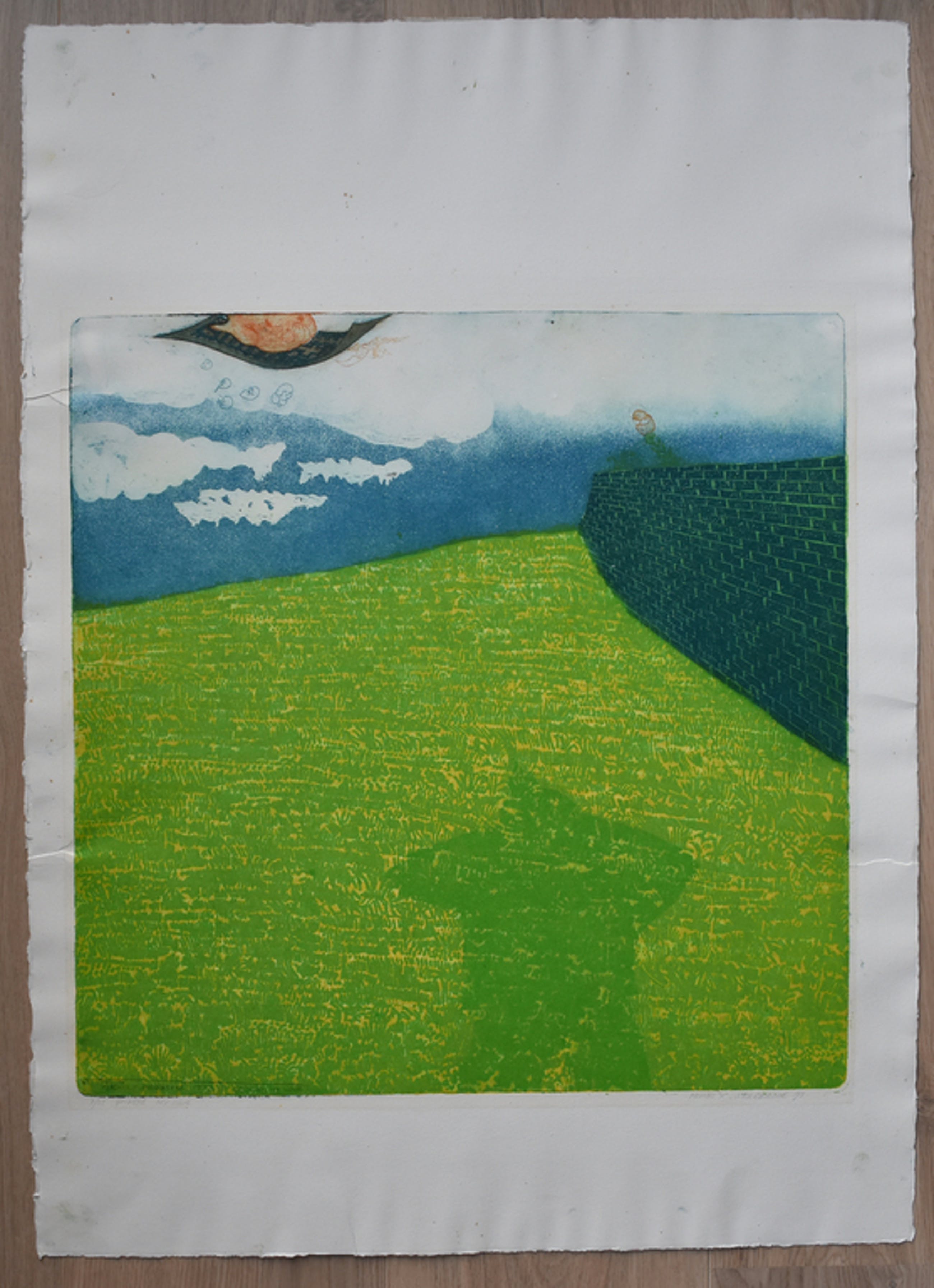 Zeer groot formaat ets van Michel van Overbeeke. Een dromerig landschap gevuld met schaduwen en schimmen. Krachtige kleuren op mooi, handgemaakt papier gedrukt. Gesigneerd in potlod en gesigneeerd in de plaat.