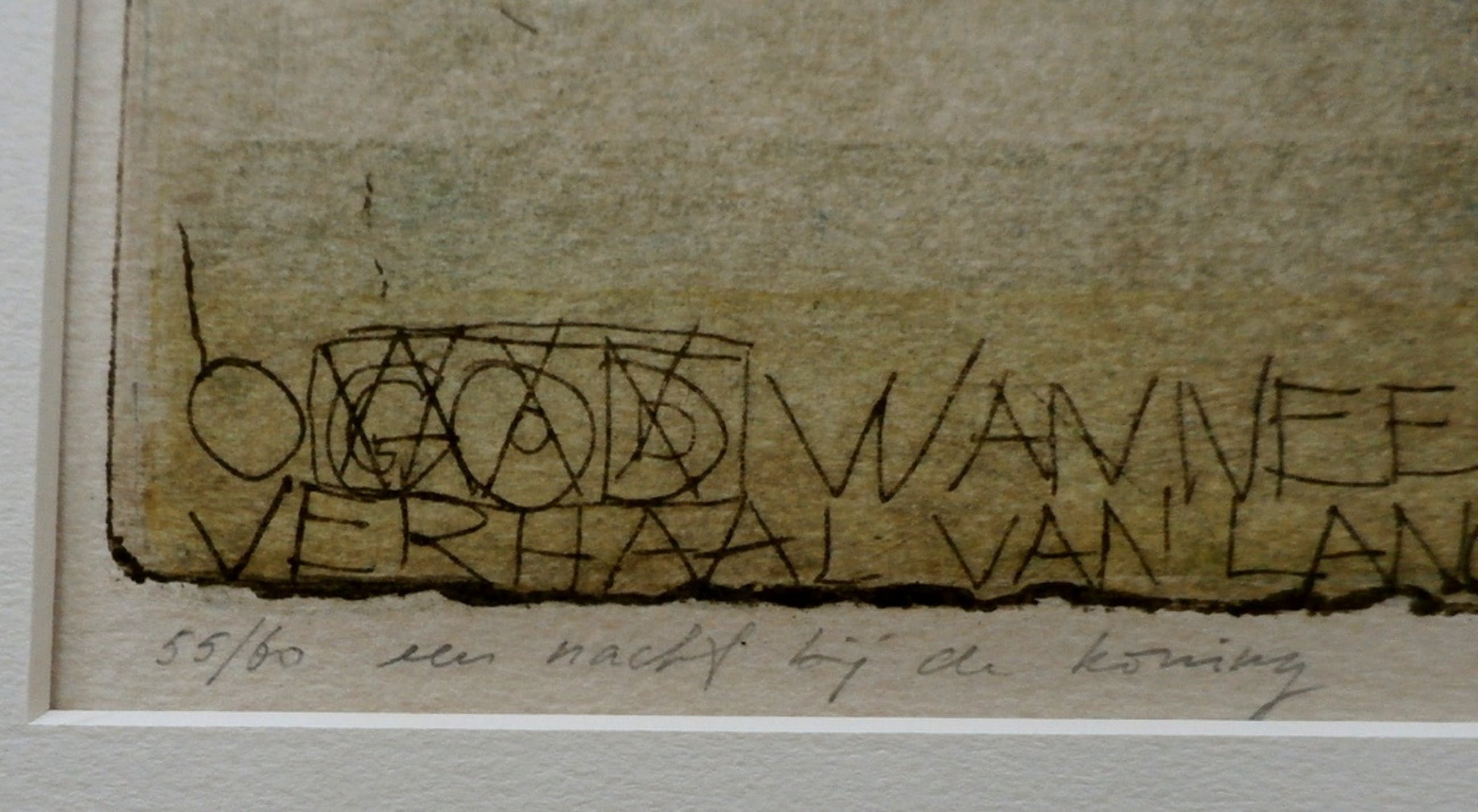 Ets van Michel van Overbeeke uit 1978. Titel: een nacht bij de koning. Tekst onderaan ets: Wanneer we eenmaal teruggekomen zijn op ons verhaal van lang geleden ontmoeten we ons zelf in u. Nummer: 55/60. Afmetingen incl. passe-partout: H61 x b58 cm. Afmetingen ets: H39,5 x b35 cm . Herkomst: collectie ABN AMRO. De authenciteit van het, aangeboden, werk wordt voor 100% gegarandeerd. Een certificaat van echtheid kan, op aanvraag, worden meegestuurd.
