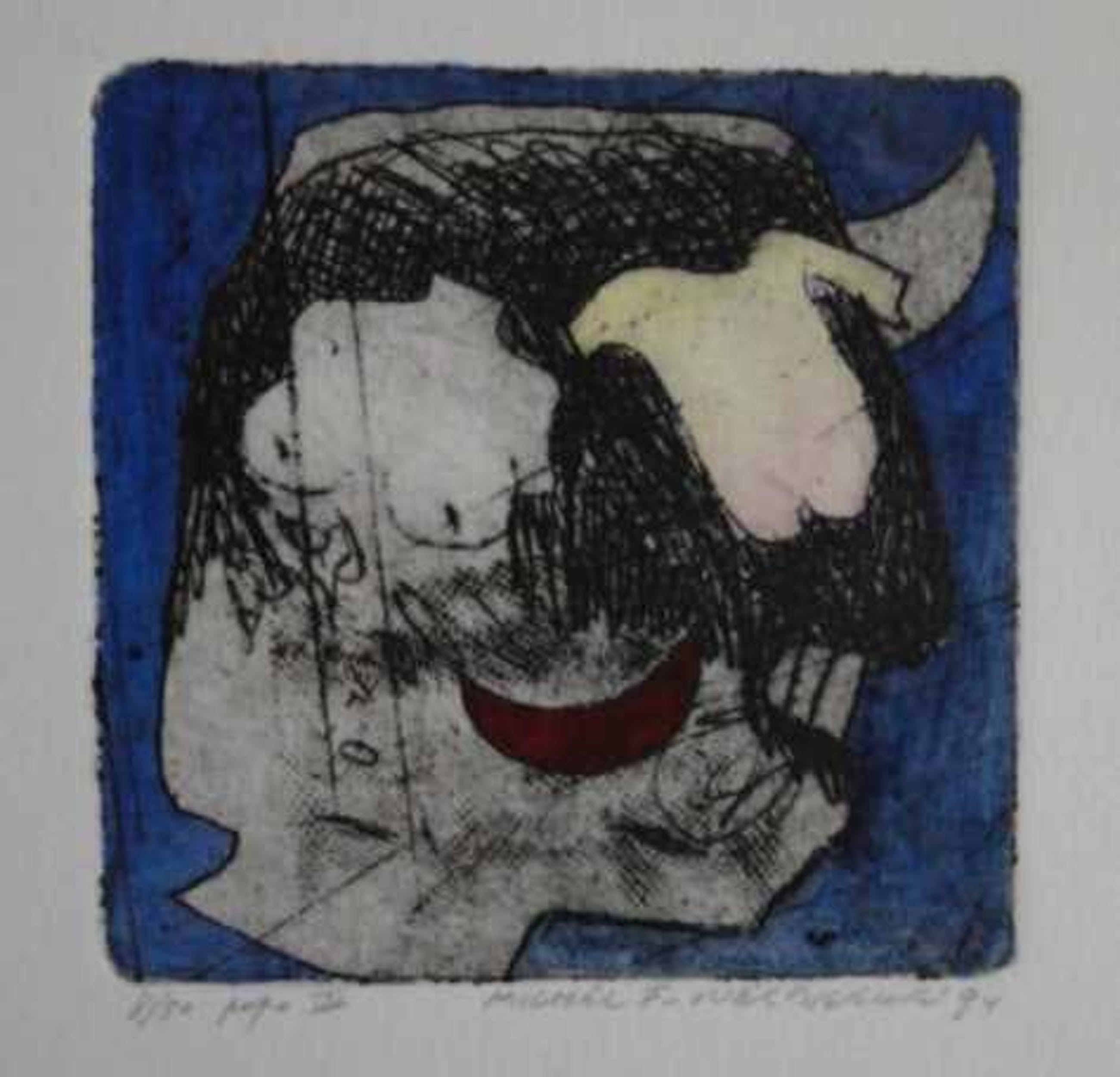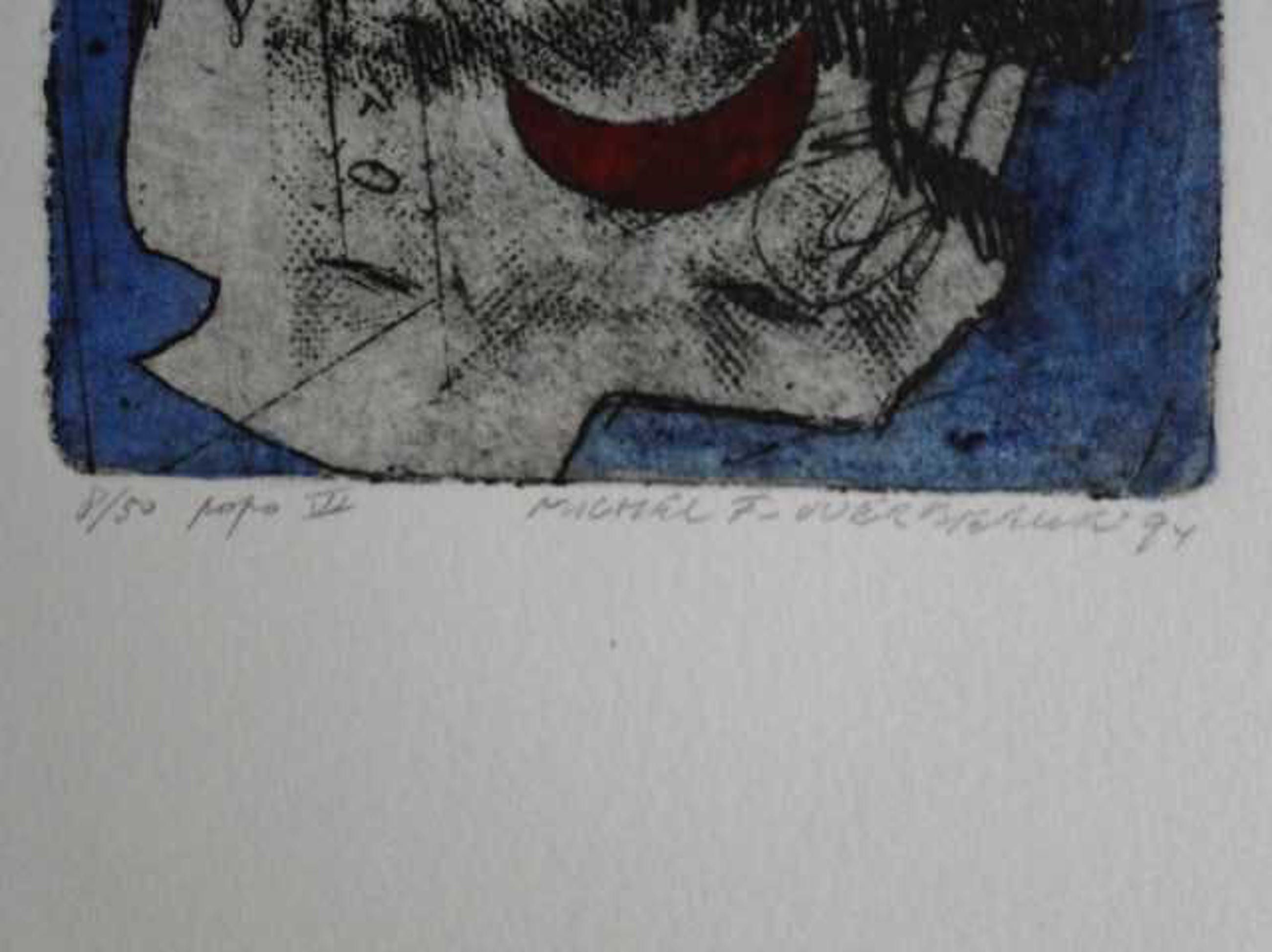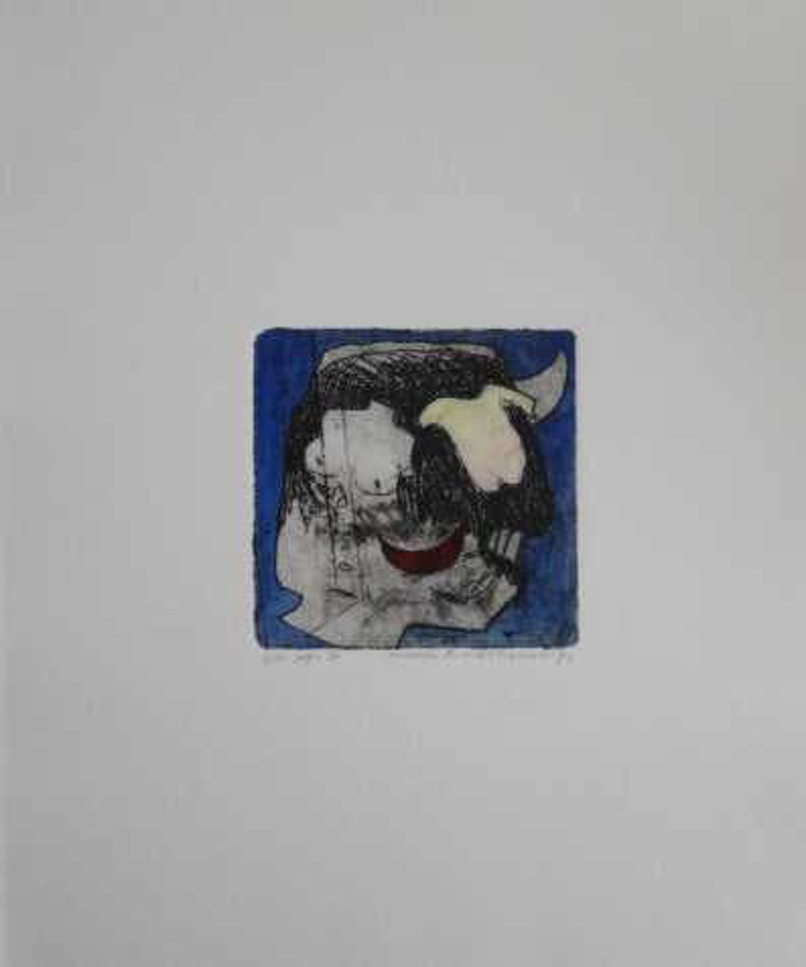 Het werk van Michel van Overbeeke is kleurrijk en zeer herkenbaar. Dit geldt ook voor dit werk uit de Popo-serie. Formaat blad: 33 x 25 cm. Formaat beeld: 10 x 10 cm.