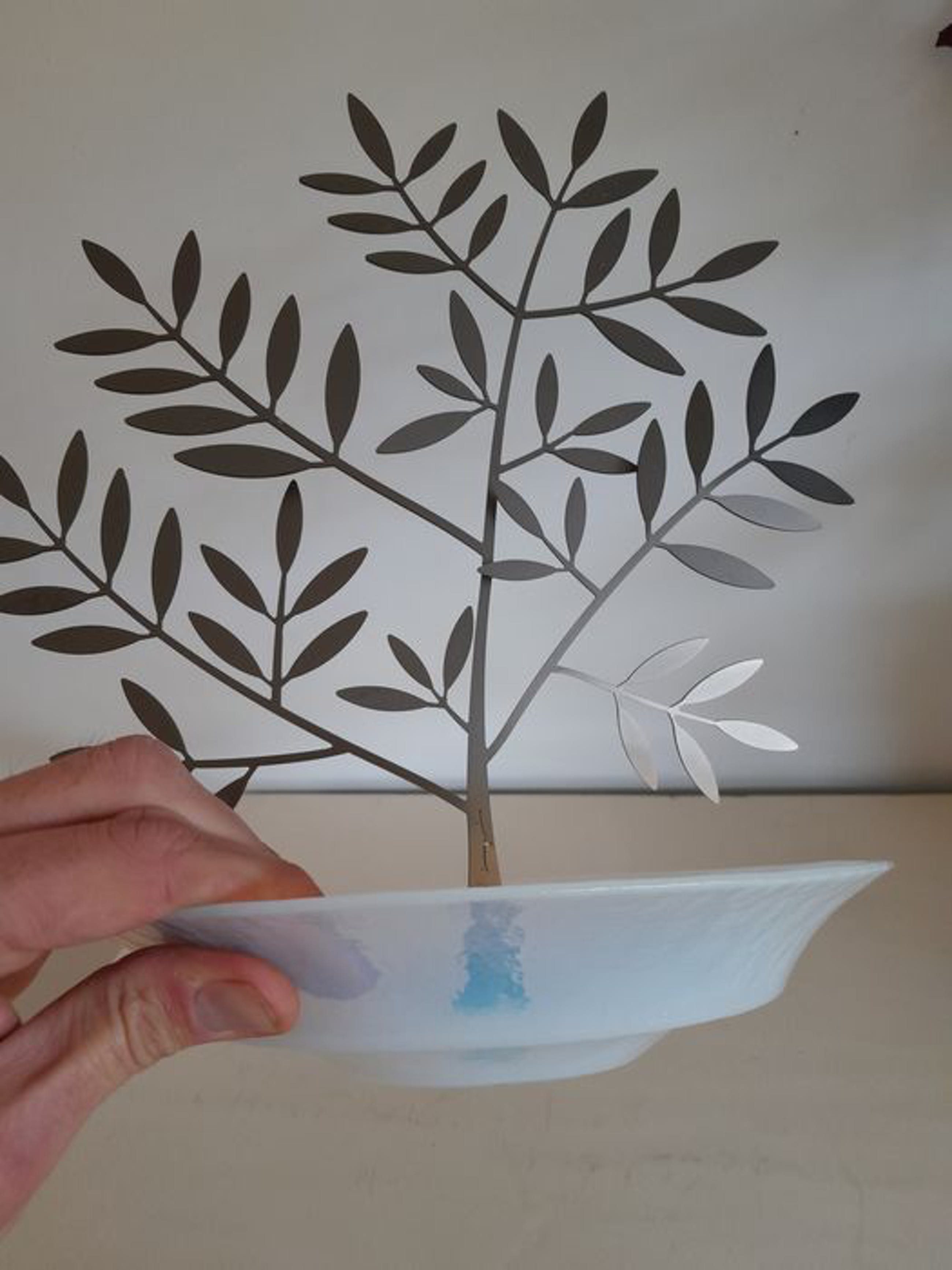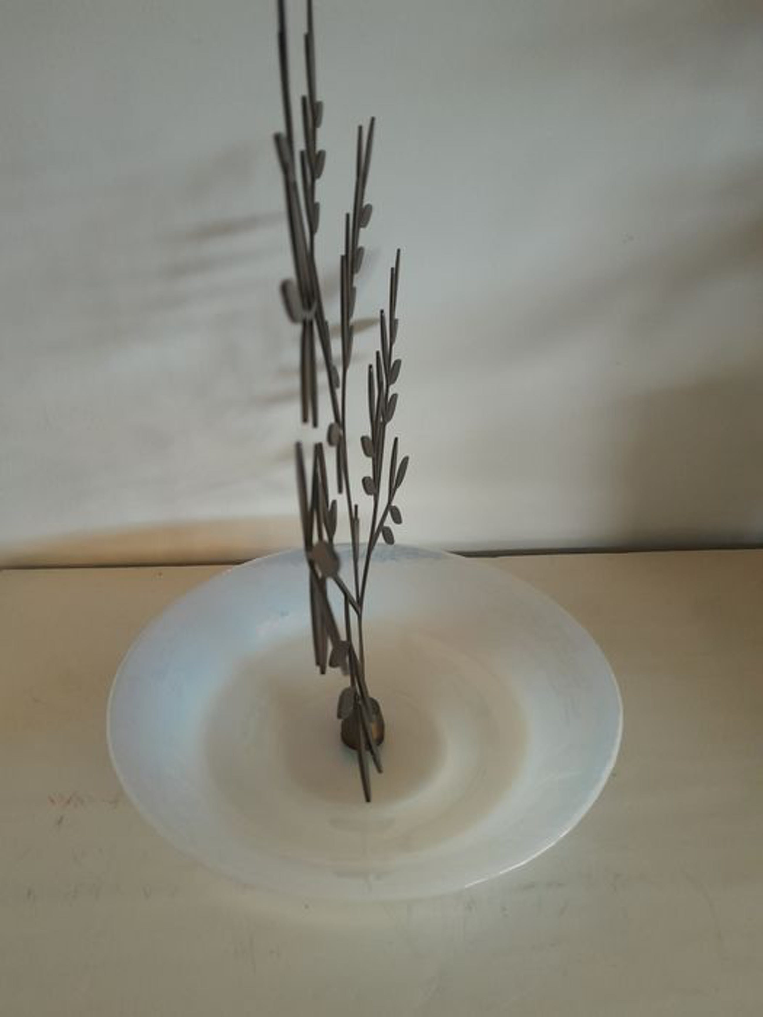 Schaal met olijfboom is ontworpen door Michele de Lucchi in 2000 en is een speciale productie. De olijfboom bestaat uit beschermd ruw metaal, laser gesneden uit een 2 mm dikke plaat. Schaal bestaat uit bewerkt mat glas. Afmetingen: H 30 cm x B 29 cm Diameter schaal: 21,5 cm In zeer goede staat