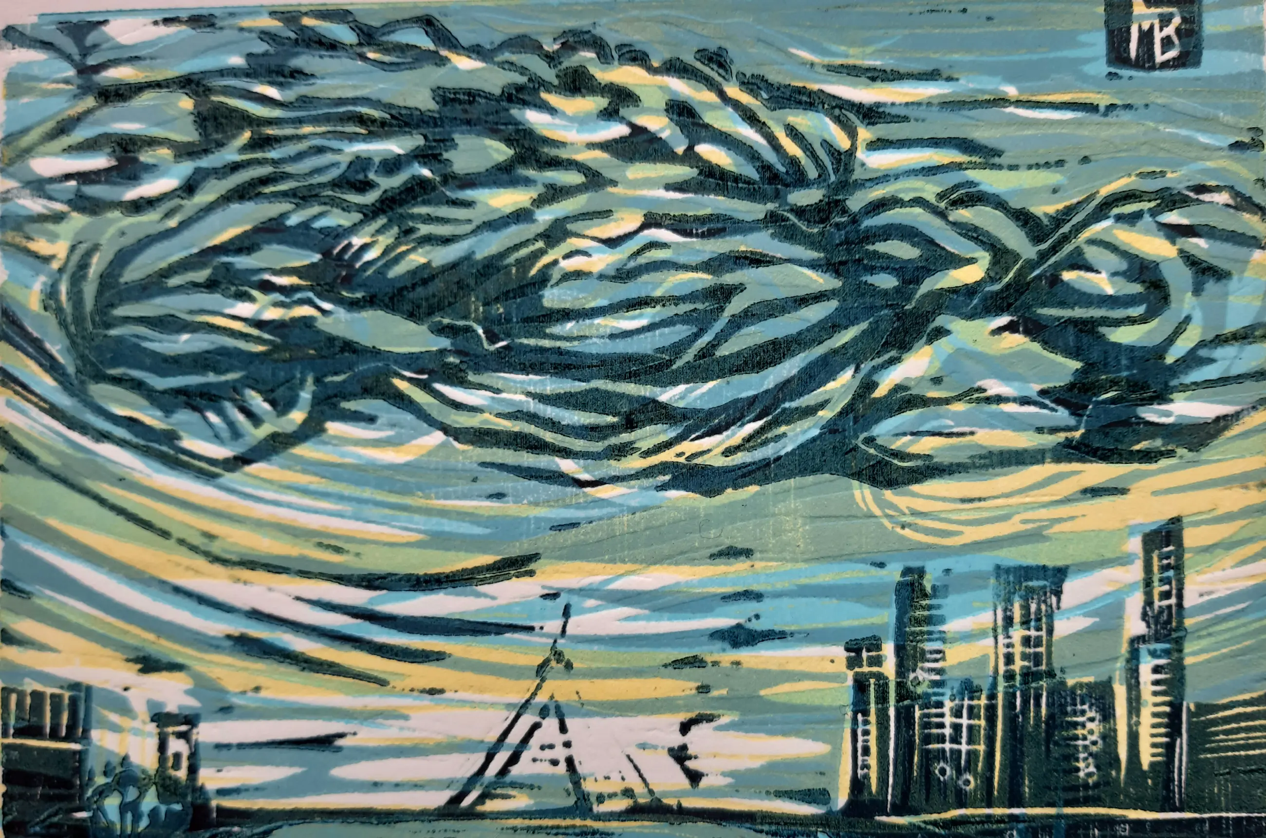 Houtsnede, vier kleuren. Prentje van januari 2021 uit de reeks 'Prentje van de maand'. In 2021 was het thema ‘De Lucht'.
