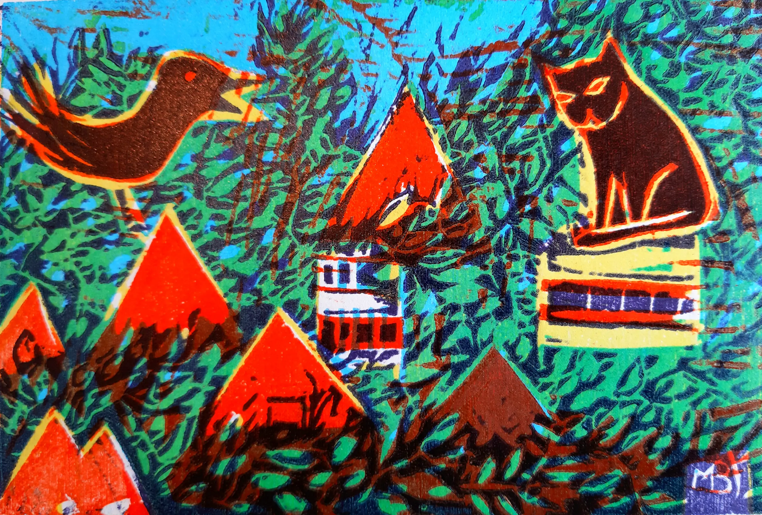 Houtsnede, vier kleuren. Prentje van juni 2019 uit de reeks 'Prentje van de maand'. In 2019 was het thema ‘De stad'.