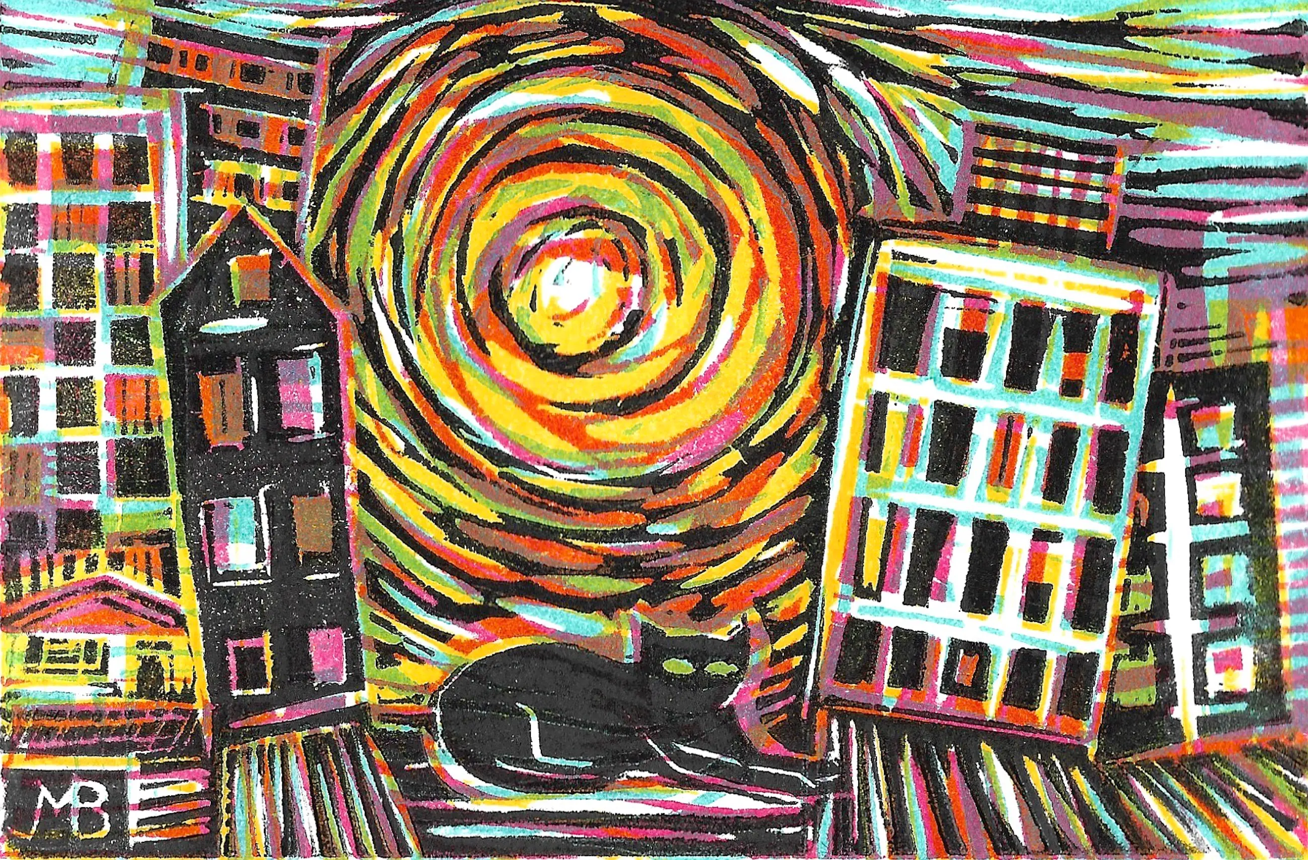 Houtsnede, vier kleuren. Prentje van augustus 2019 uit de reeks 'Prentje van de maand'. In 2019 was het thema ‘De stad ’.
