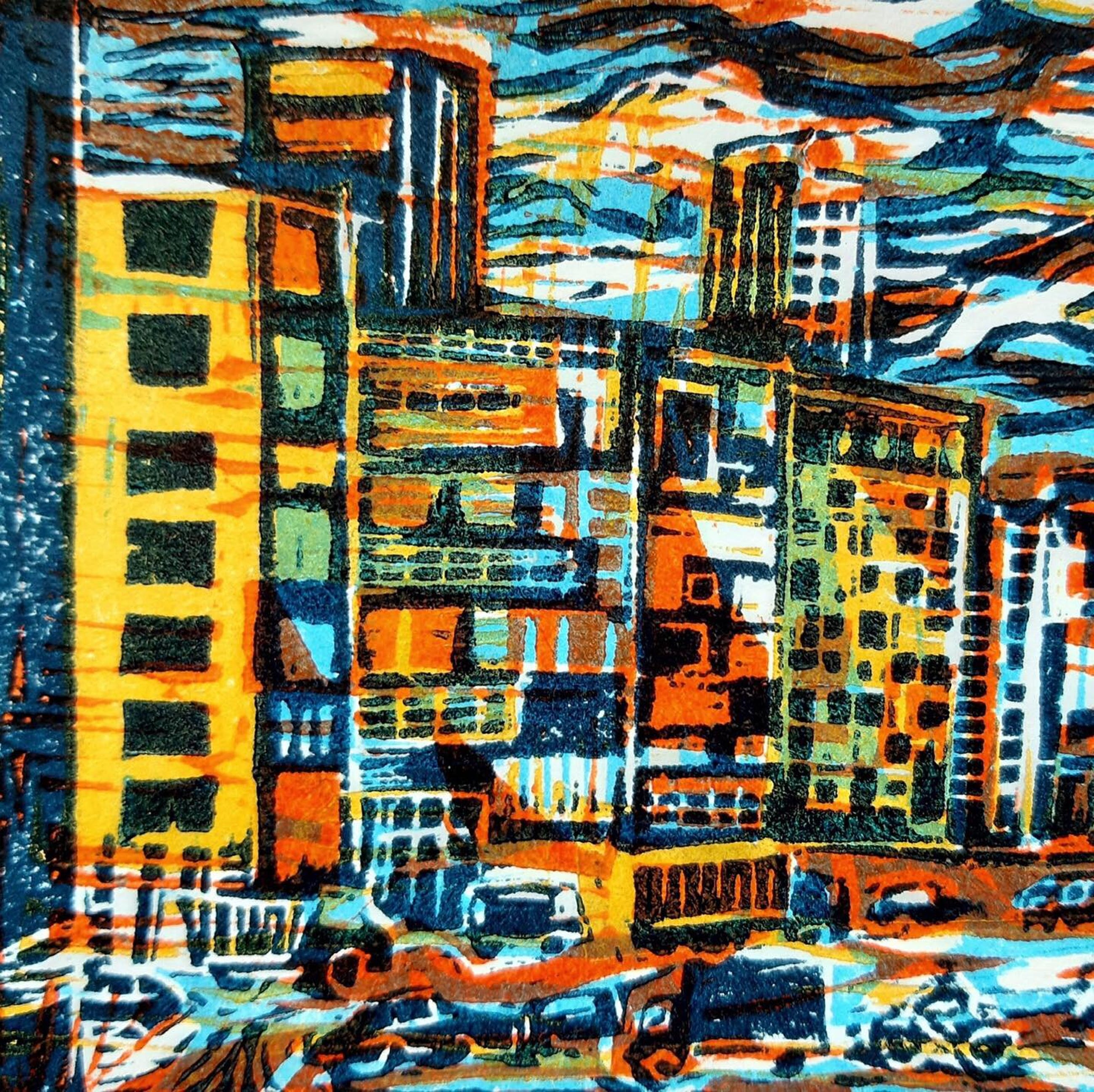 Uit de reeks ‘De Stad’; prentje van de maand. Dit zijn vierkleuren houtsnedes die sinds 2013 gedrukt worden. Bij iedere prent heeft Brink een gedicht gemaakt. De jaargang is te bestellen in een handgemaakte doos, inhoudend 12 prenten in paspartout; 12 prints met prentje in kleur en gedicht; bio van de maker en een colofon.