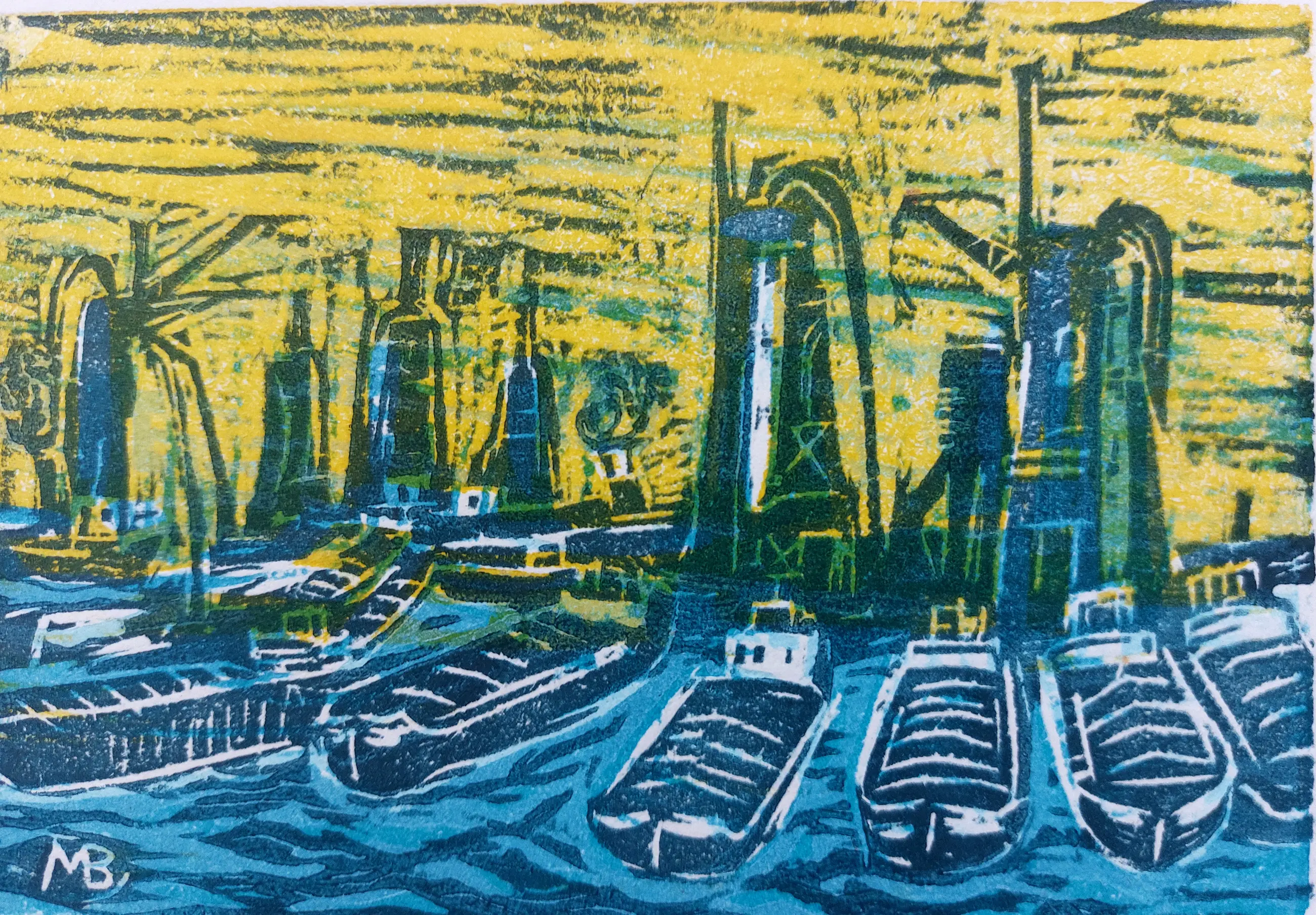 Houtsnede, vier kleuren. Prentje van augustus 2022 uit de reeks 'Prentje van de maand'. In 2022 is het thema ‘Rotterdam Maritiem ’.