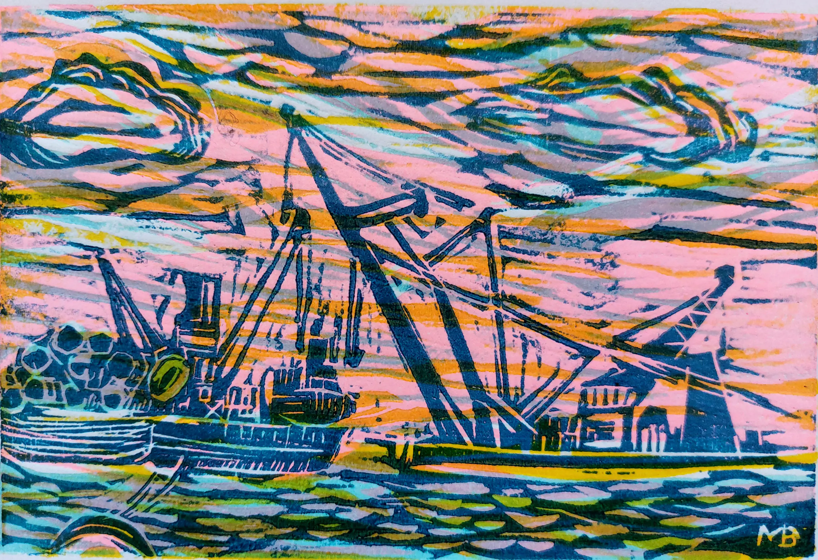 Houtsnede, vier kleuren. Prentje van november 2022 uit de reeks 'Prentje van de maand'. In 2022 is het thema ‘Rotterdam Maritiem ’.