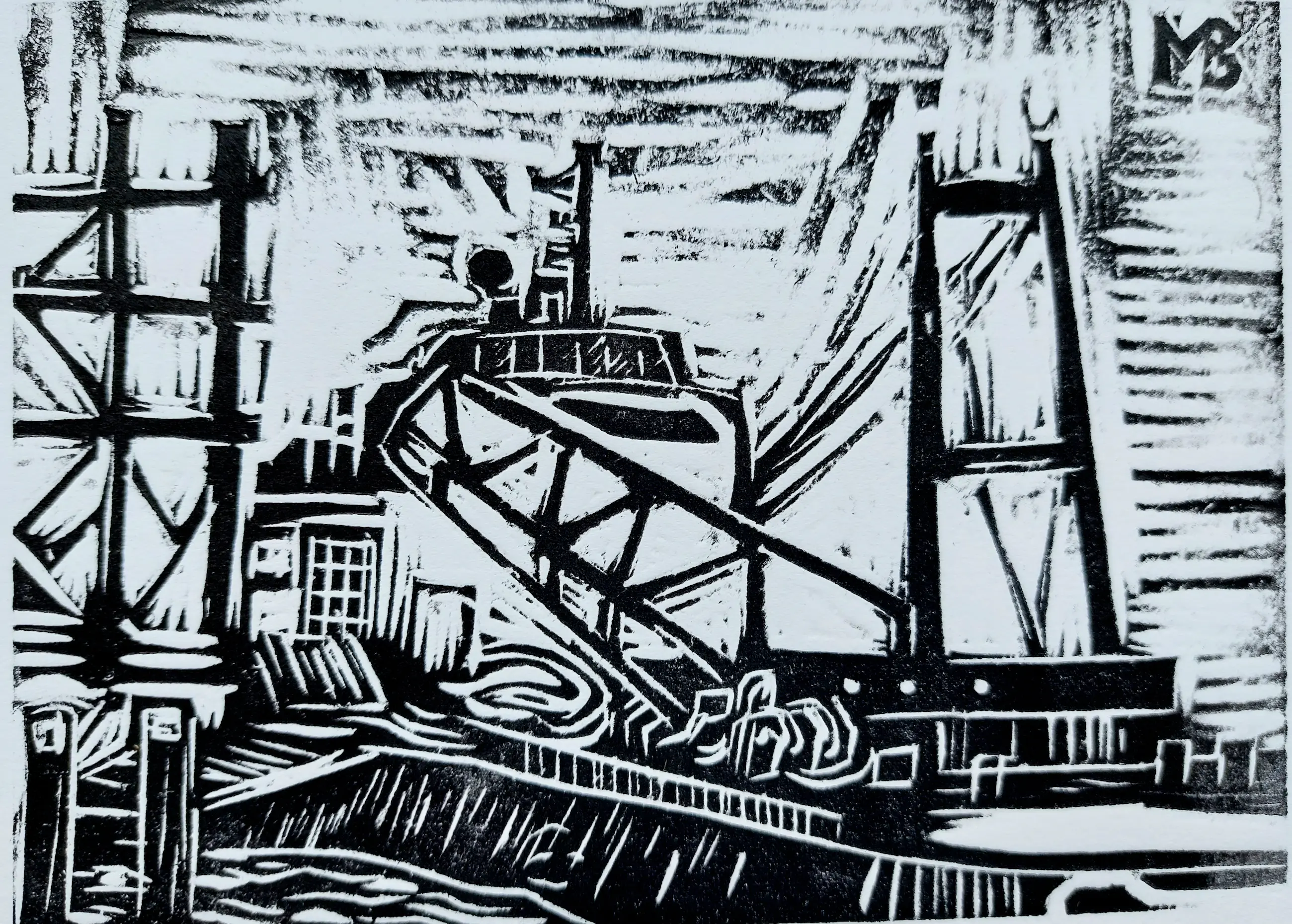 Houtsnede uit serie Prentje van de maand. In 2022 is het thema ‘Rotterdam Maritiem ' ( handdruk)