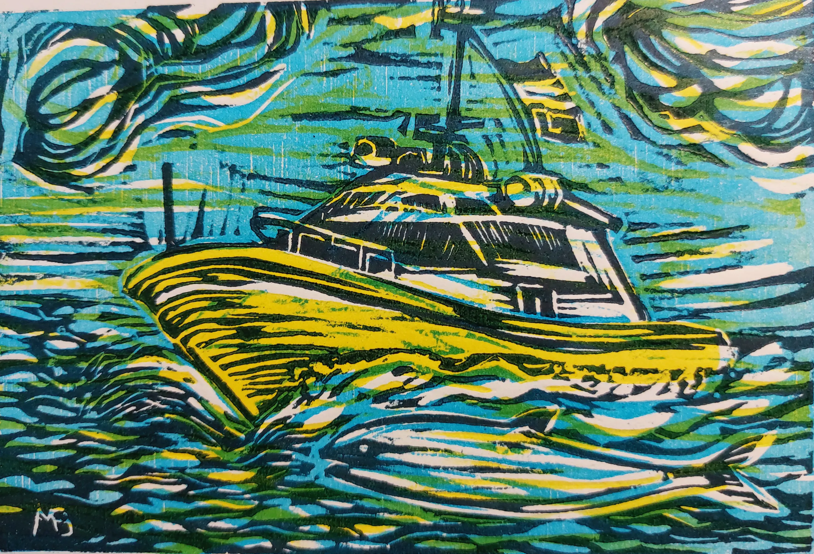Houtsnede, vier kleuren. Prentje van maart 2022 uit de reeks 'Prentje van de maand'. In 2022 is het thema ‘Rotterdam Maritiem '
